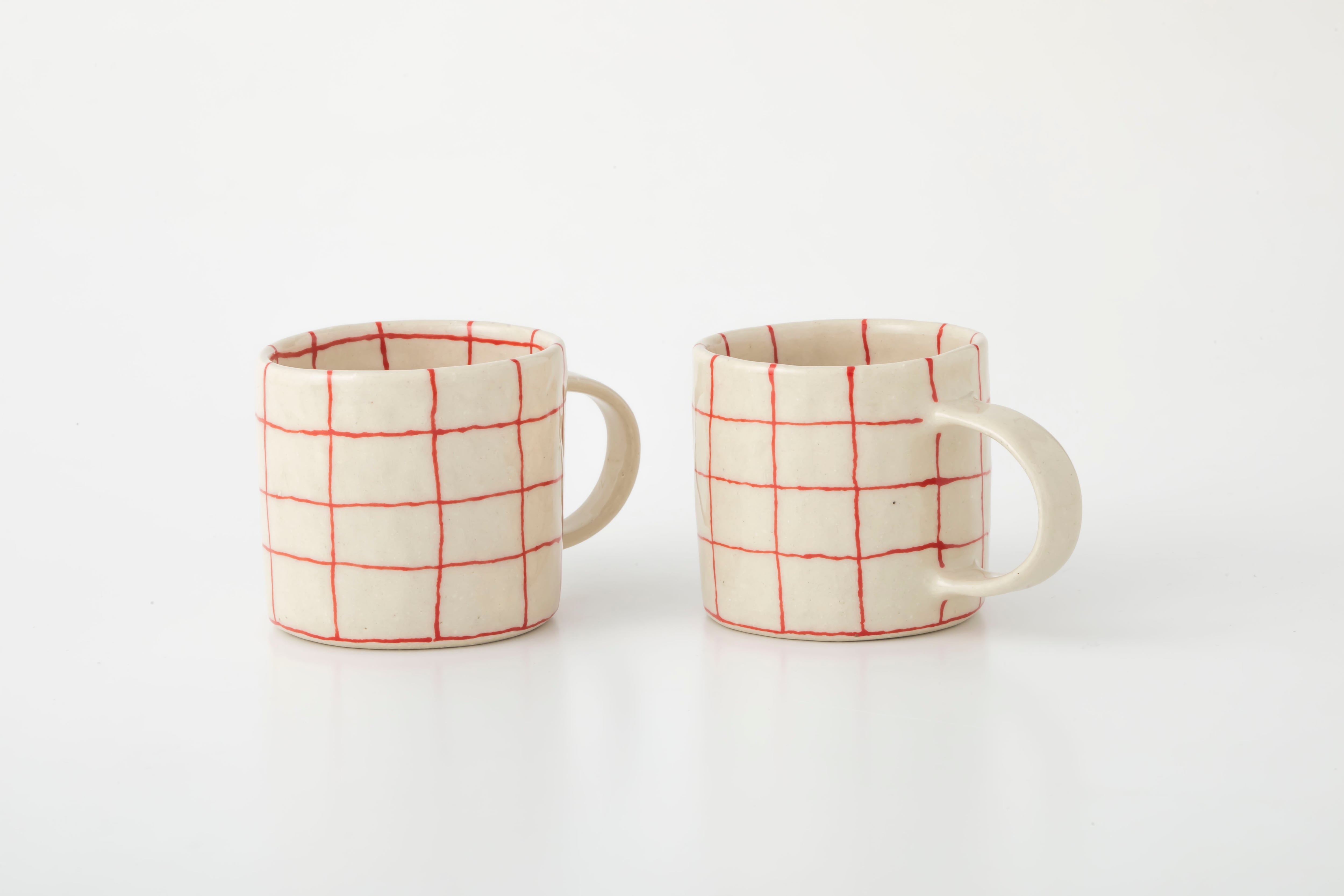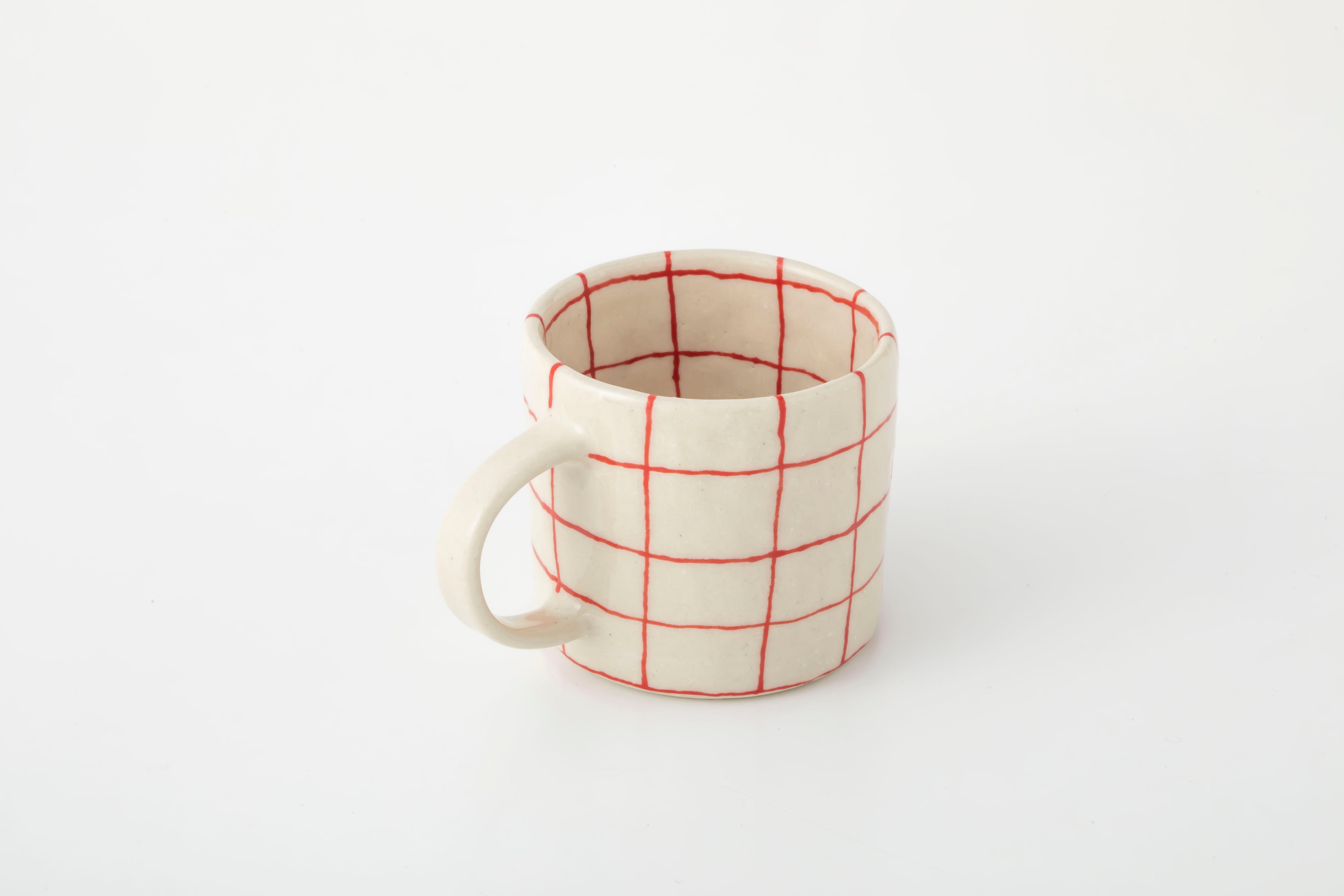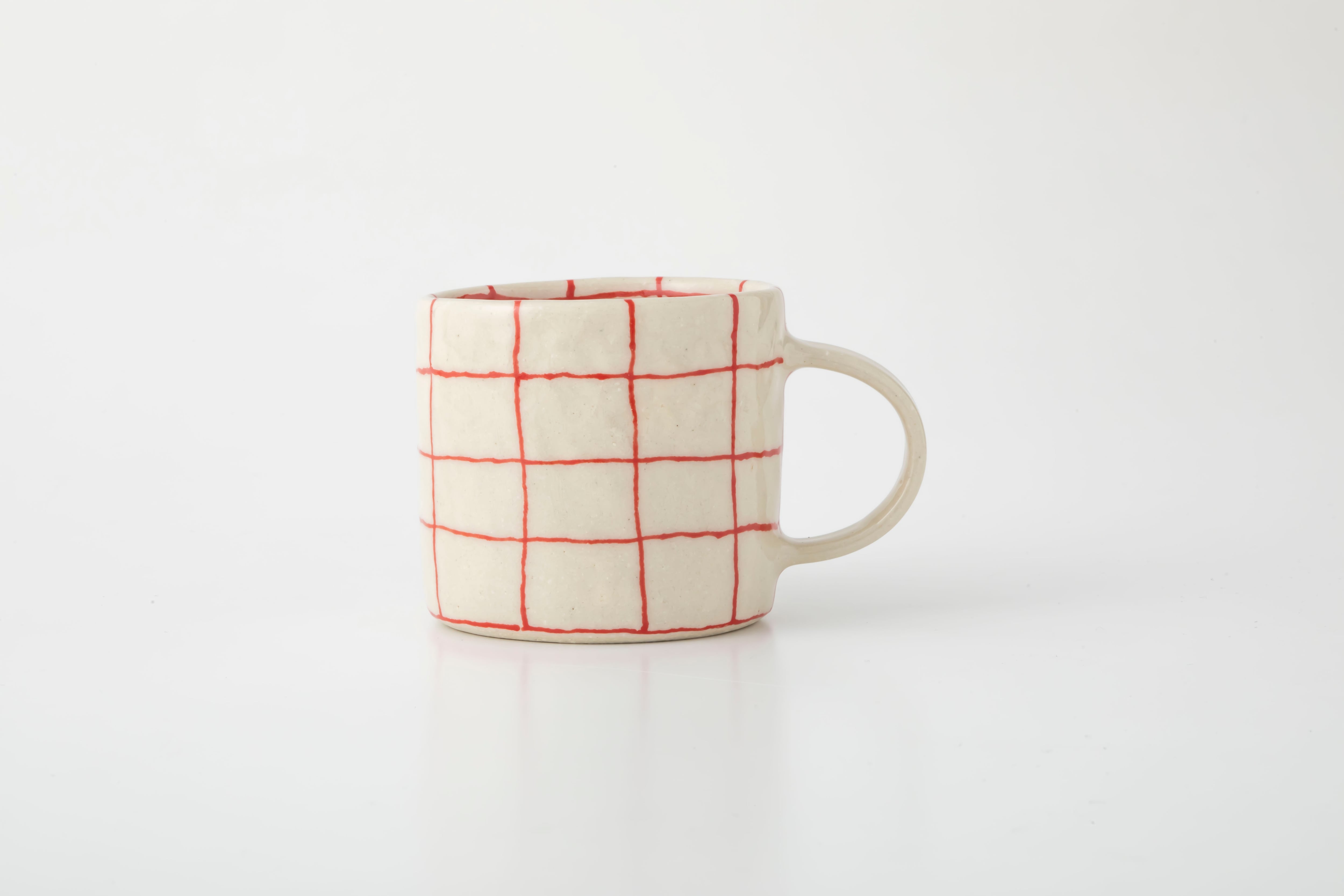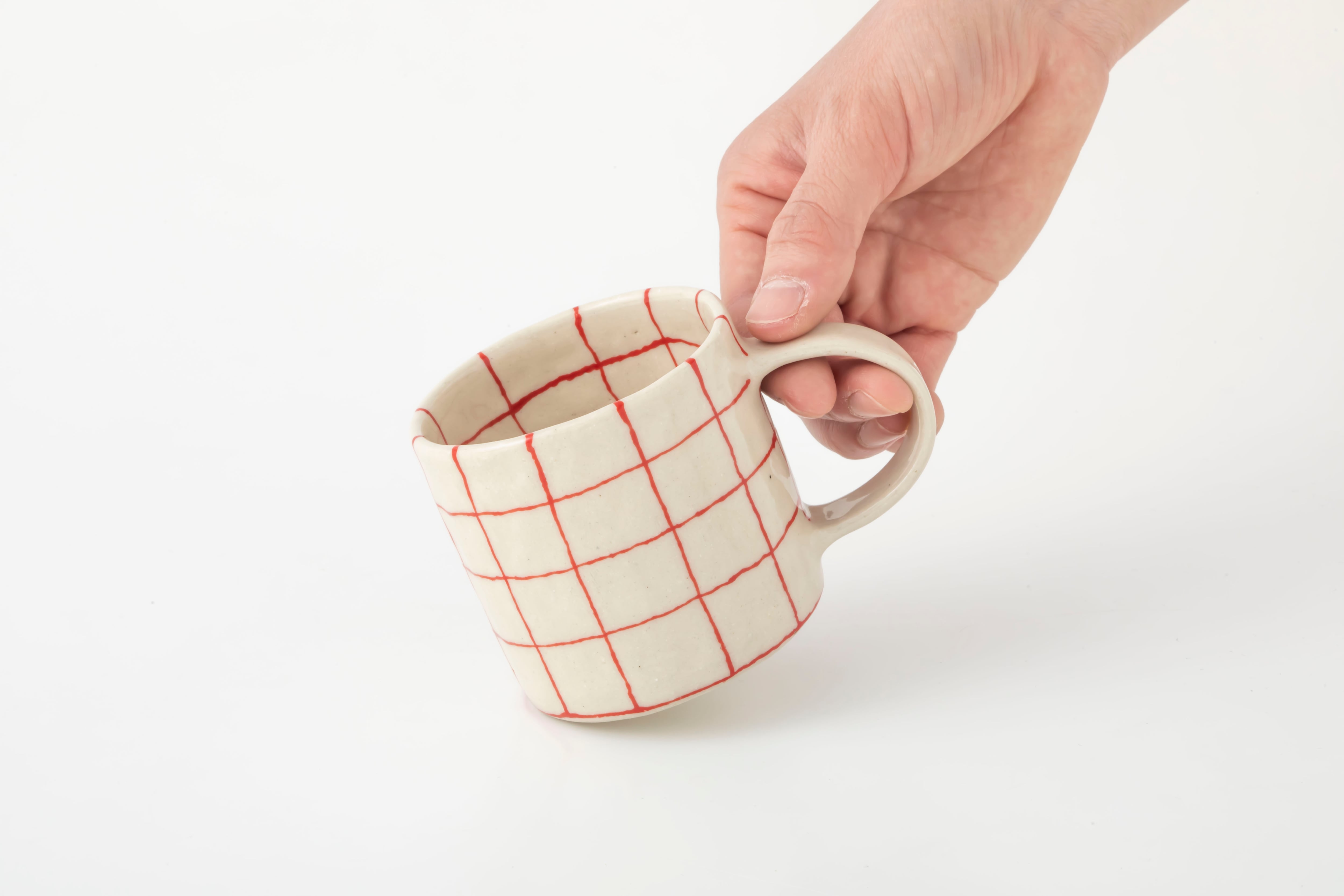 手捻りの温かみのあるフォルムにハンドペイントのチェック模様が可愛らしいマグカップは、口当たりの良さと手に収まりのいいサイズ感が魅力的。毎日の朝食やティータイムのおともにぜひご愛用ください。同シリーズのリムプレートやオーバルと合わせてのテーブルコーディネートもおすすめです。