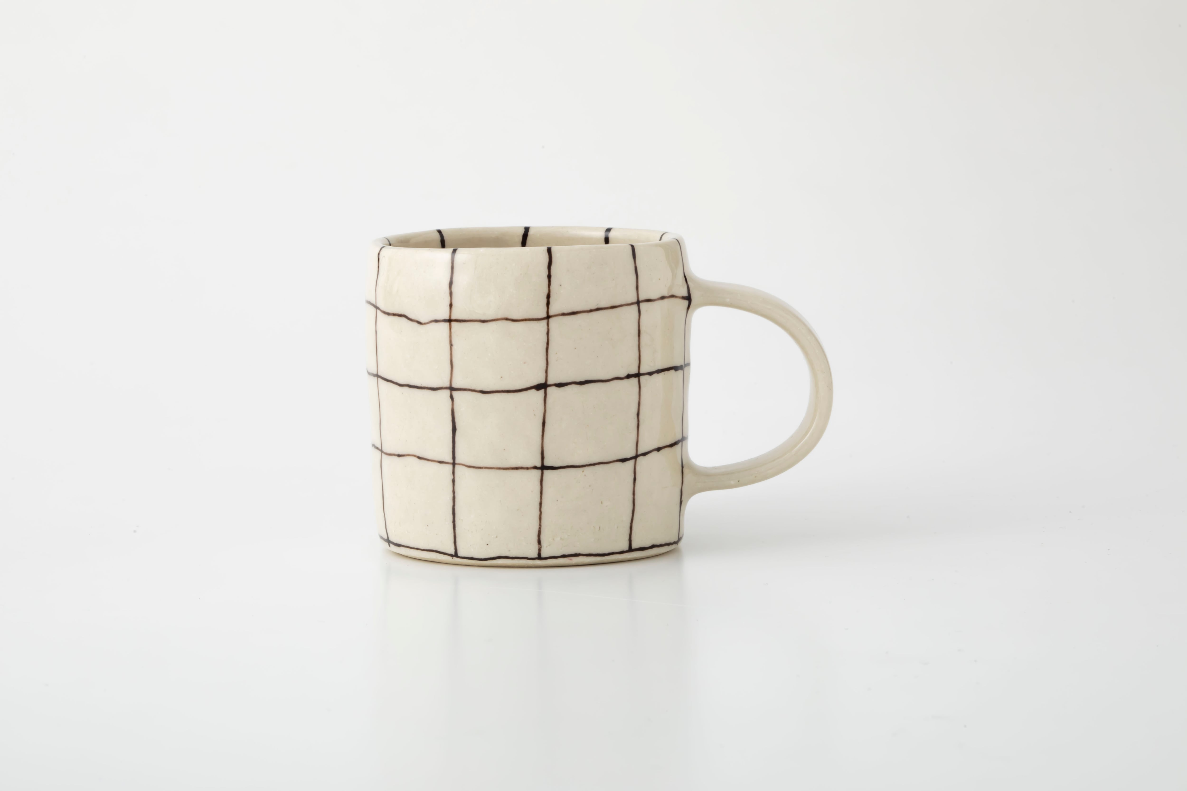 手捻りの温かみのあるフォルムにハンドペイントのチェック模様が可愛らしいマグカップは、口当たりの良さと手に収まりのいいサイズ感が魅力的。毎日の朝食やティータイムのおともにぜひご愛用ください。同シリーズのリムプレートやオーバルと合わせてのテーブルコーディネートもおすすめです。