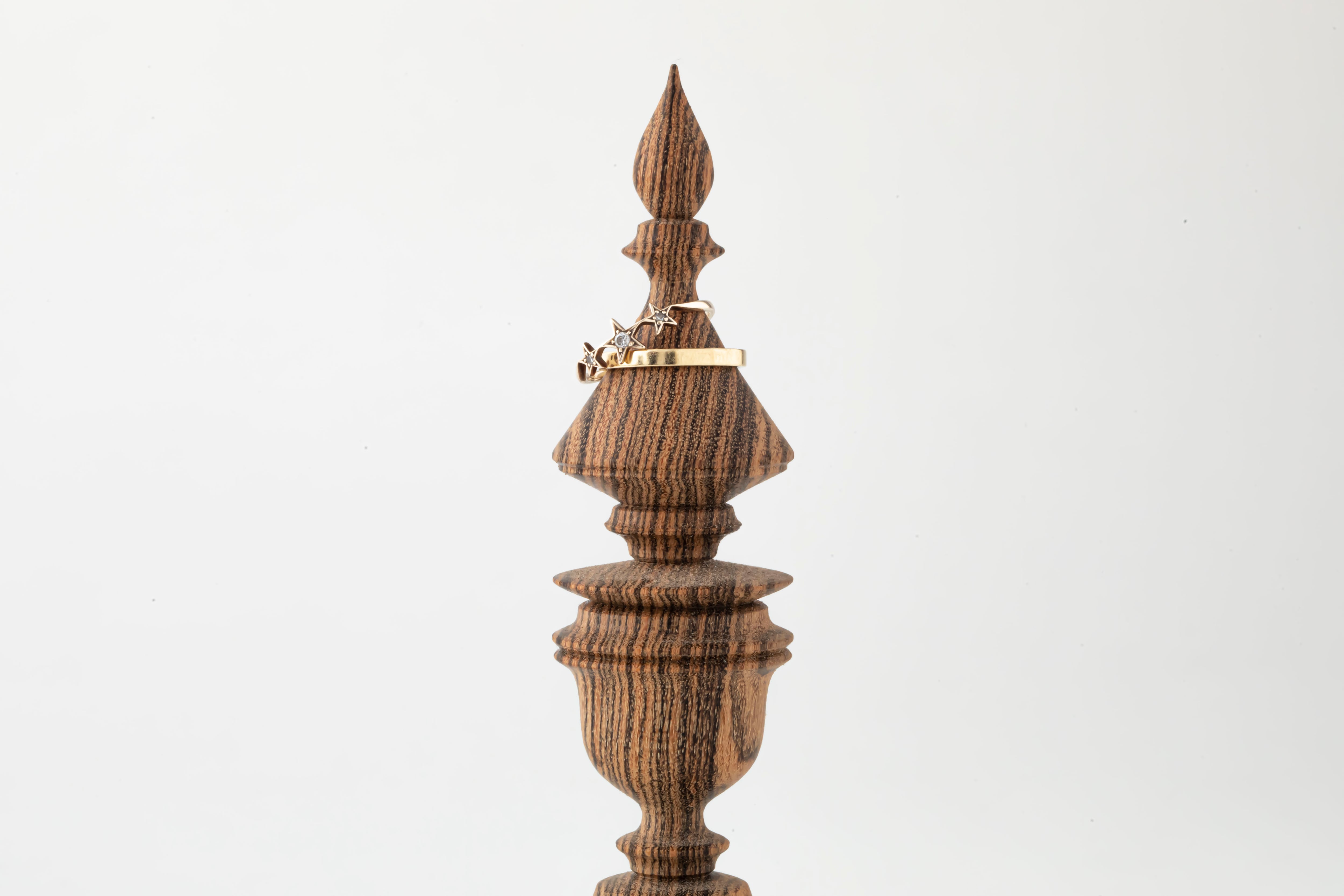 ご自身用にはもちろん、バースデーギフトやマリッジギフトとしてもおすすめなリングスタンドは、指輪をかけていない時もオブジェとして雰囲気たっぷりにインテリアを飾ってくれます。また、お気に入りの指輪を掛けることで、木目の美しさや素材の個性がより一層際立ち、ひとつの作品として完成するような佇まいに。大切なジュエリーと共に愛でていただけたら嬉しいです。