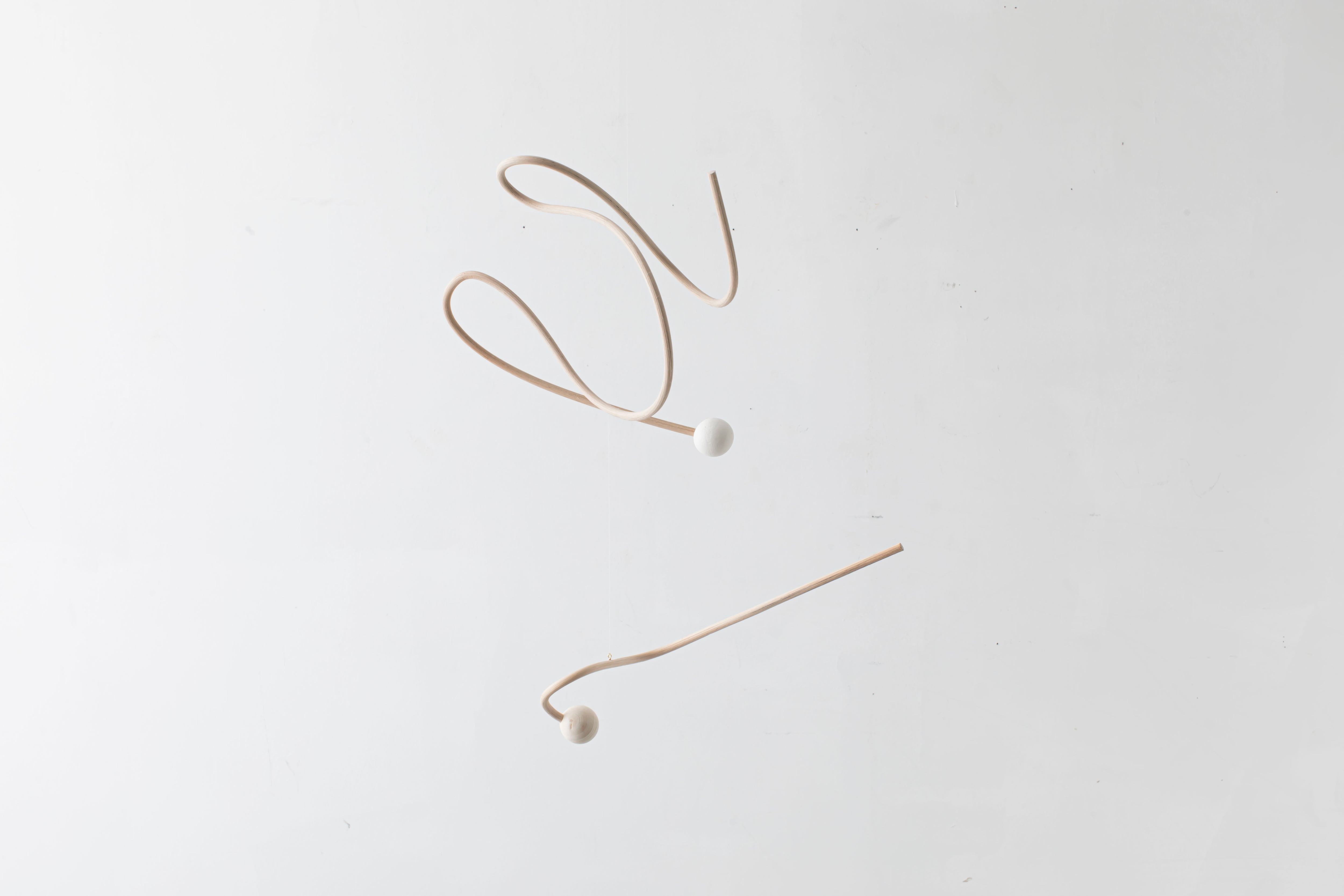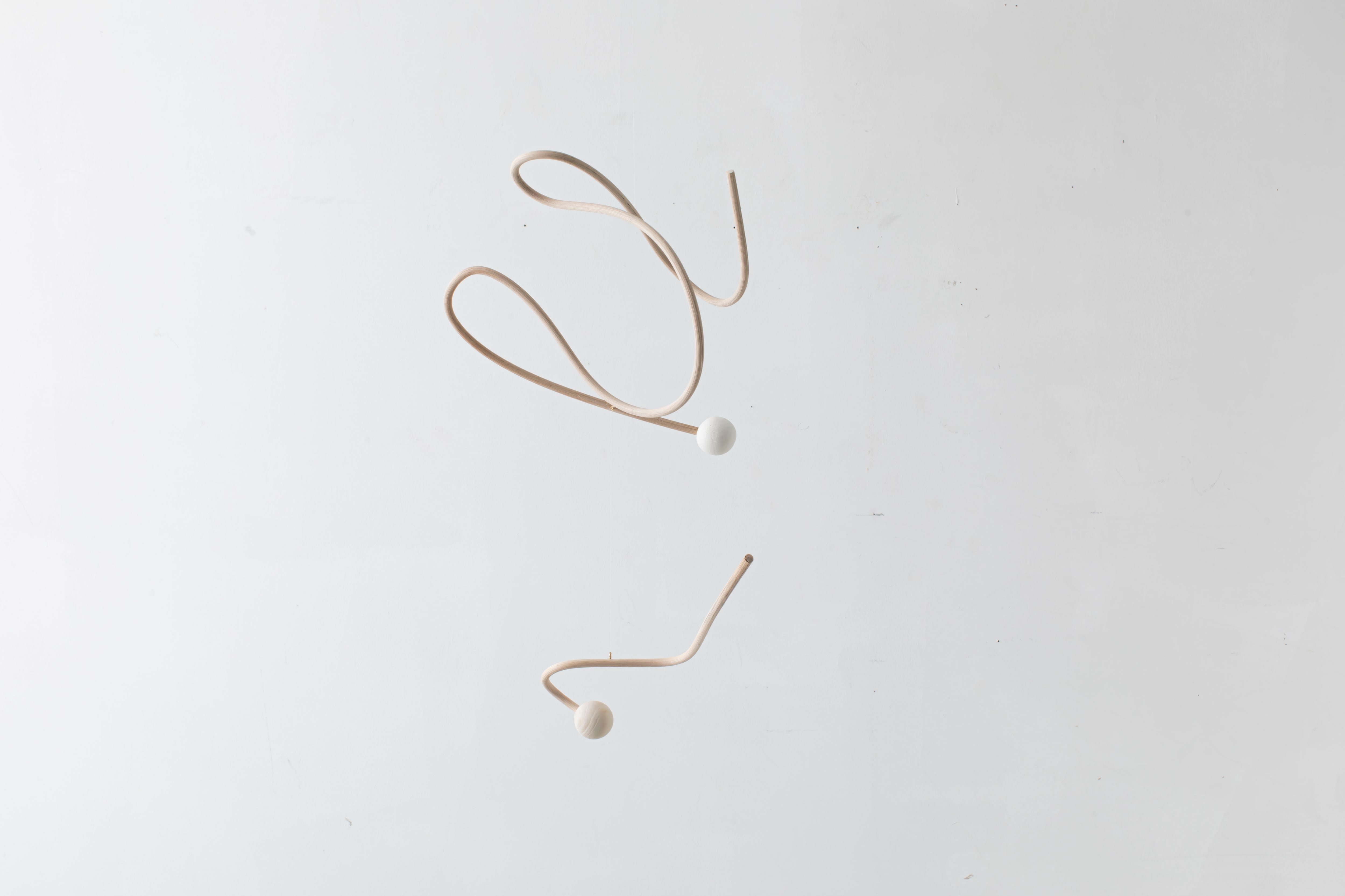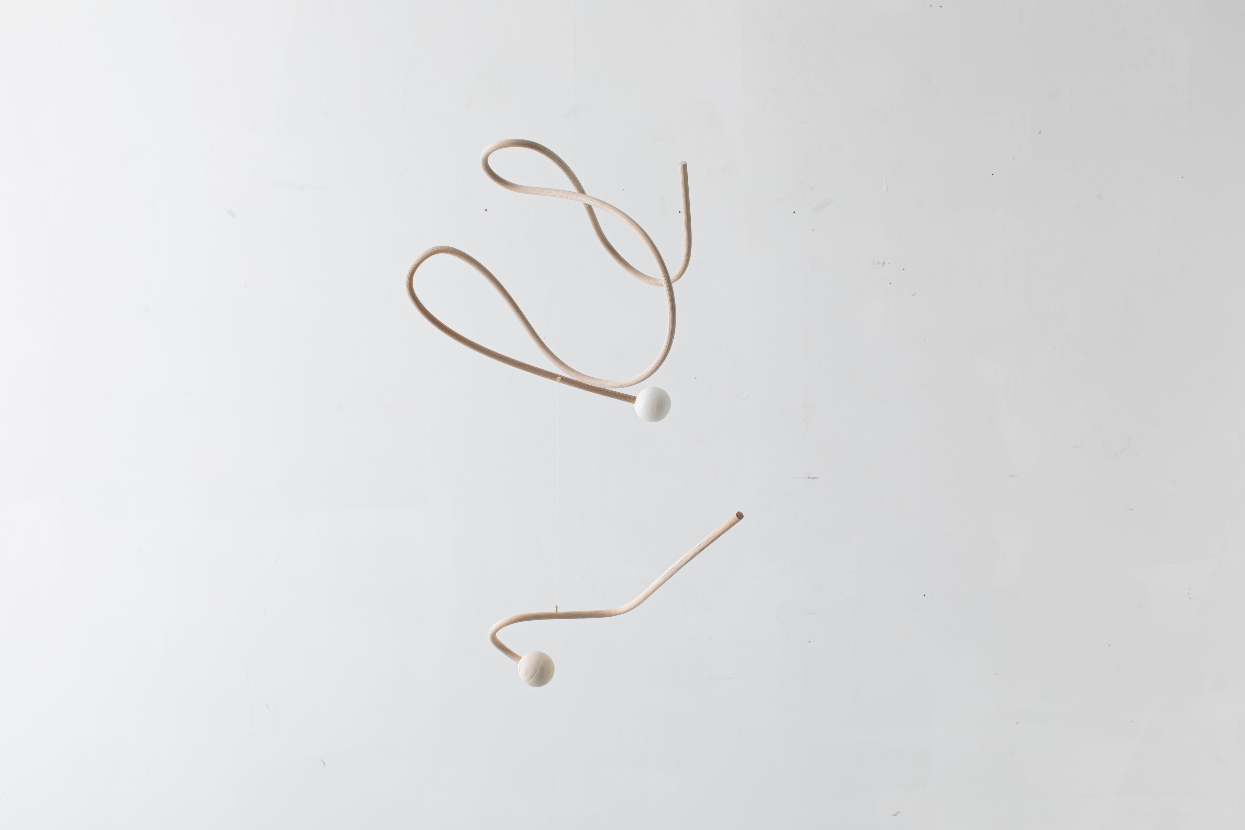 曲線が生み出すアイコニックなフォルムのモビールは、一本の籐を手作業でひとつひとつ型を使用しながら湾曲させて立体的に仕上げています。吊るし紐の長さや、かけ方を変えたりするだけで表情が変えられるので、飾る場所などによってアレンジを効かせながら何通りもの楽しみ方ができます。(※デザインによってはかけ方を変えられないものもございます)