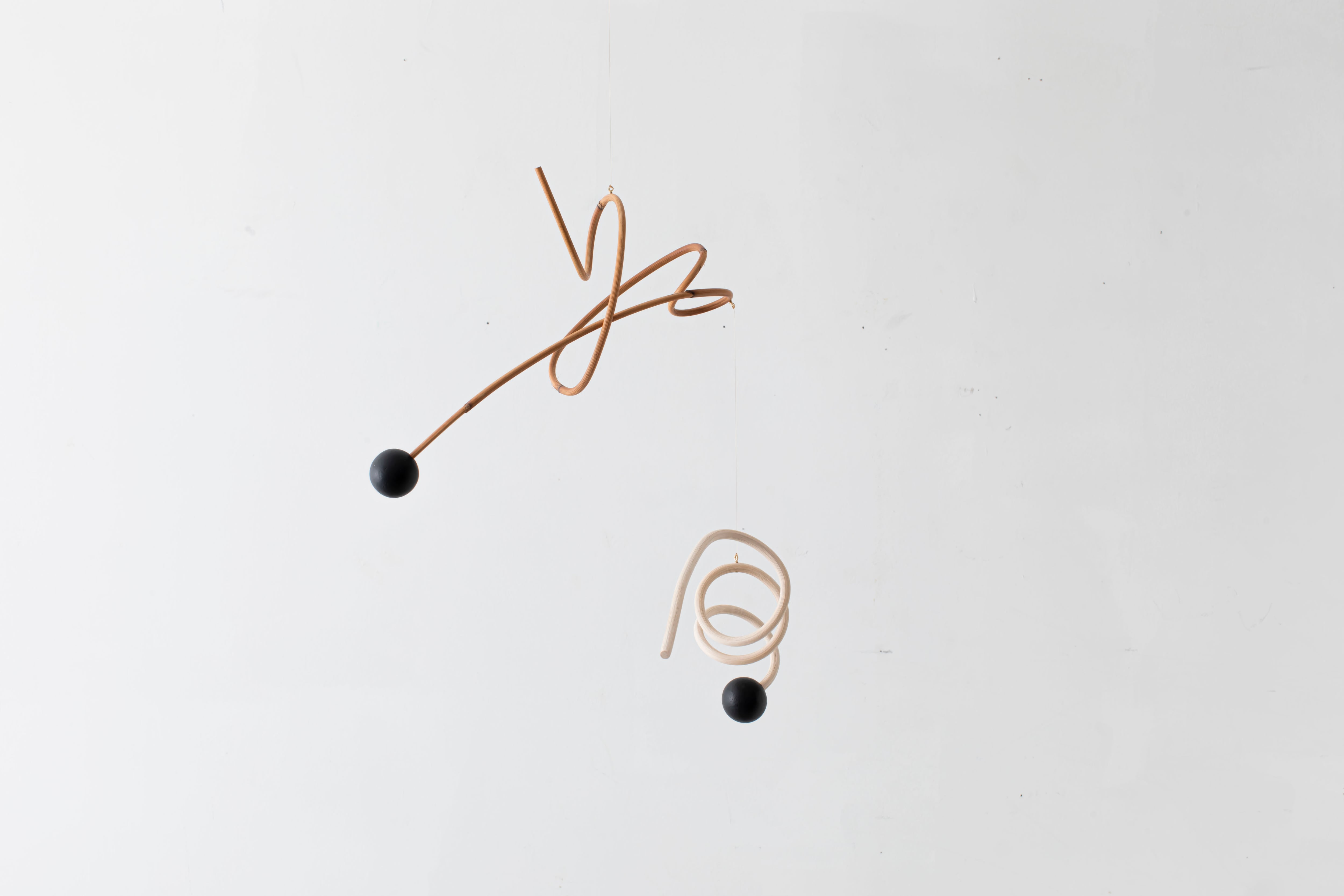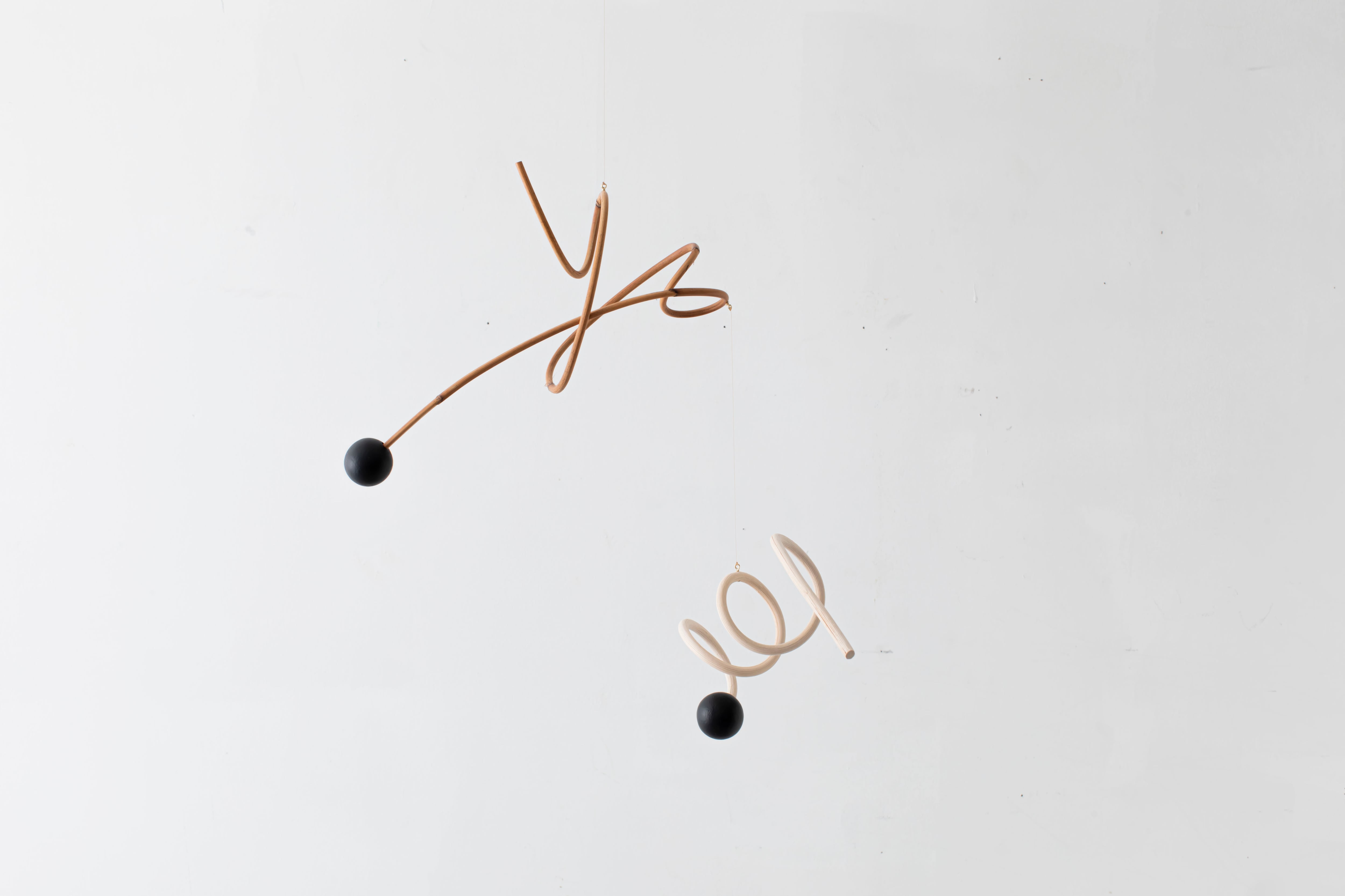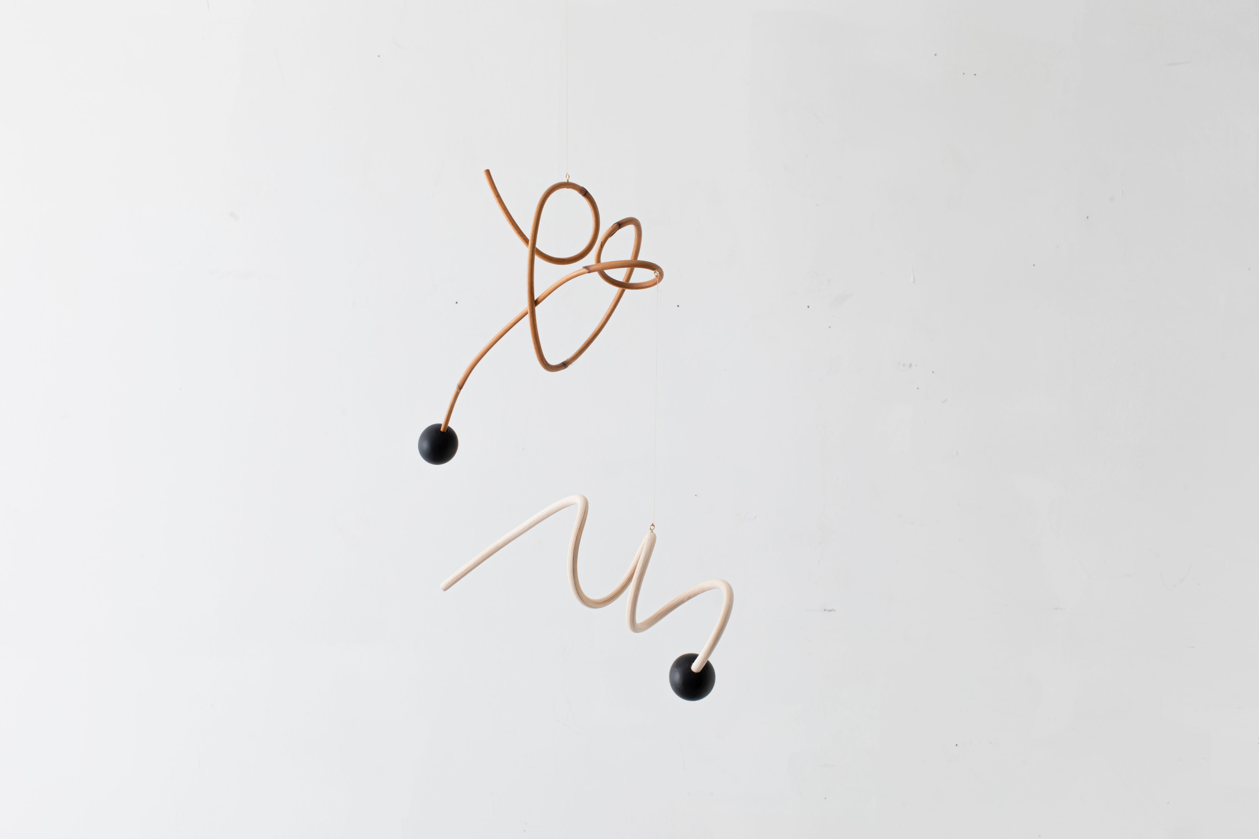 曲線が生み出すアイコニックなフォルムのモビールは、一本の籐を手作業でひとつひとつ型を使用しながら湾曲させて立体的に仕上げています。吊るし紐の長さや、かけ方を変えたりするだけで表情が変えられるので、飾る場所などによってアレンジを効かせながら何通りもの楽しみ方ができます。(※デザインによってはかけ方を変えられないものもございます)
