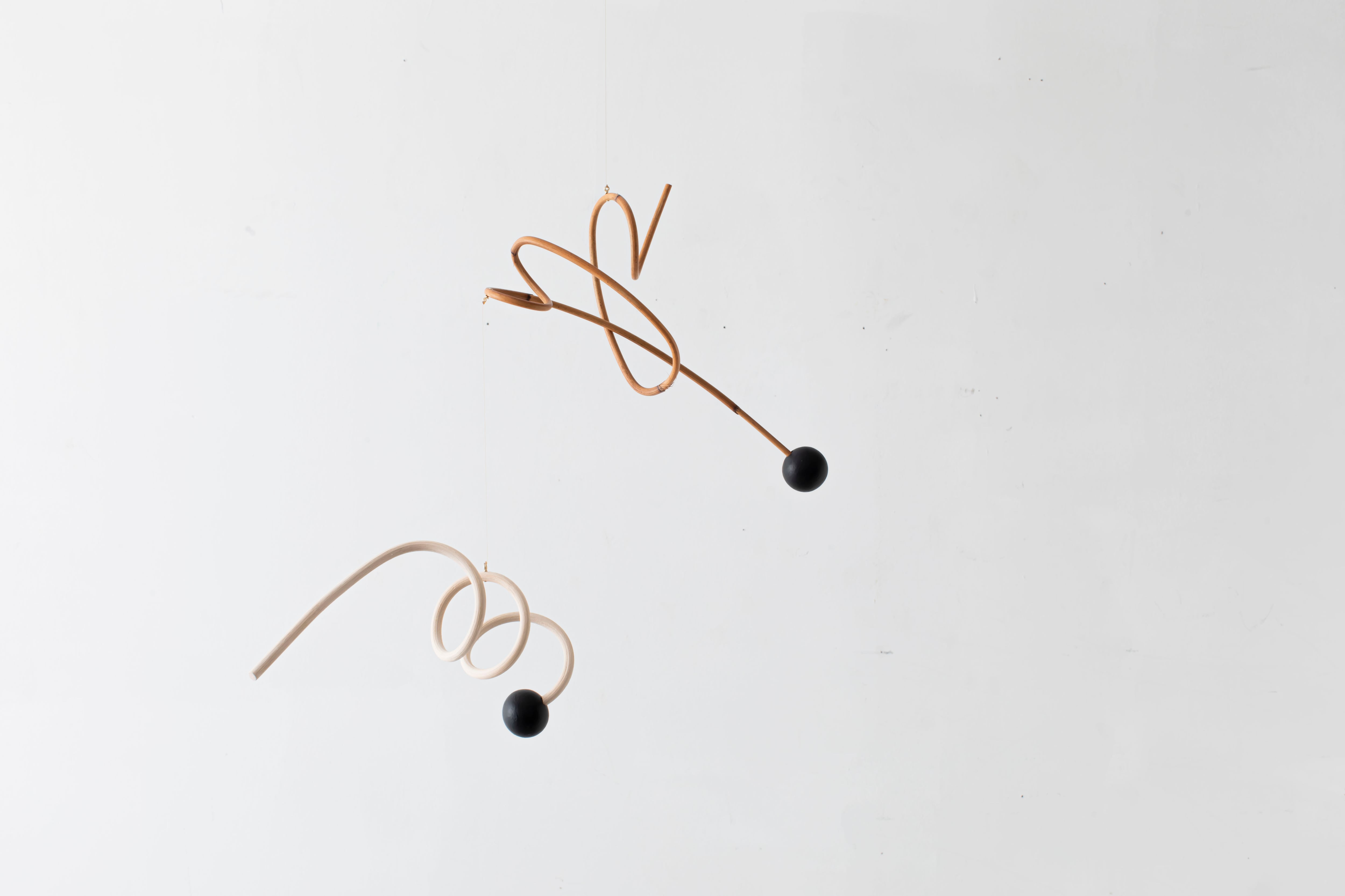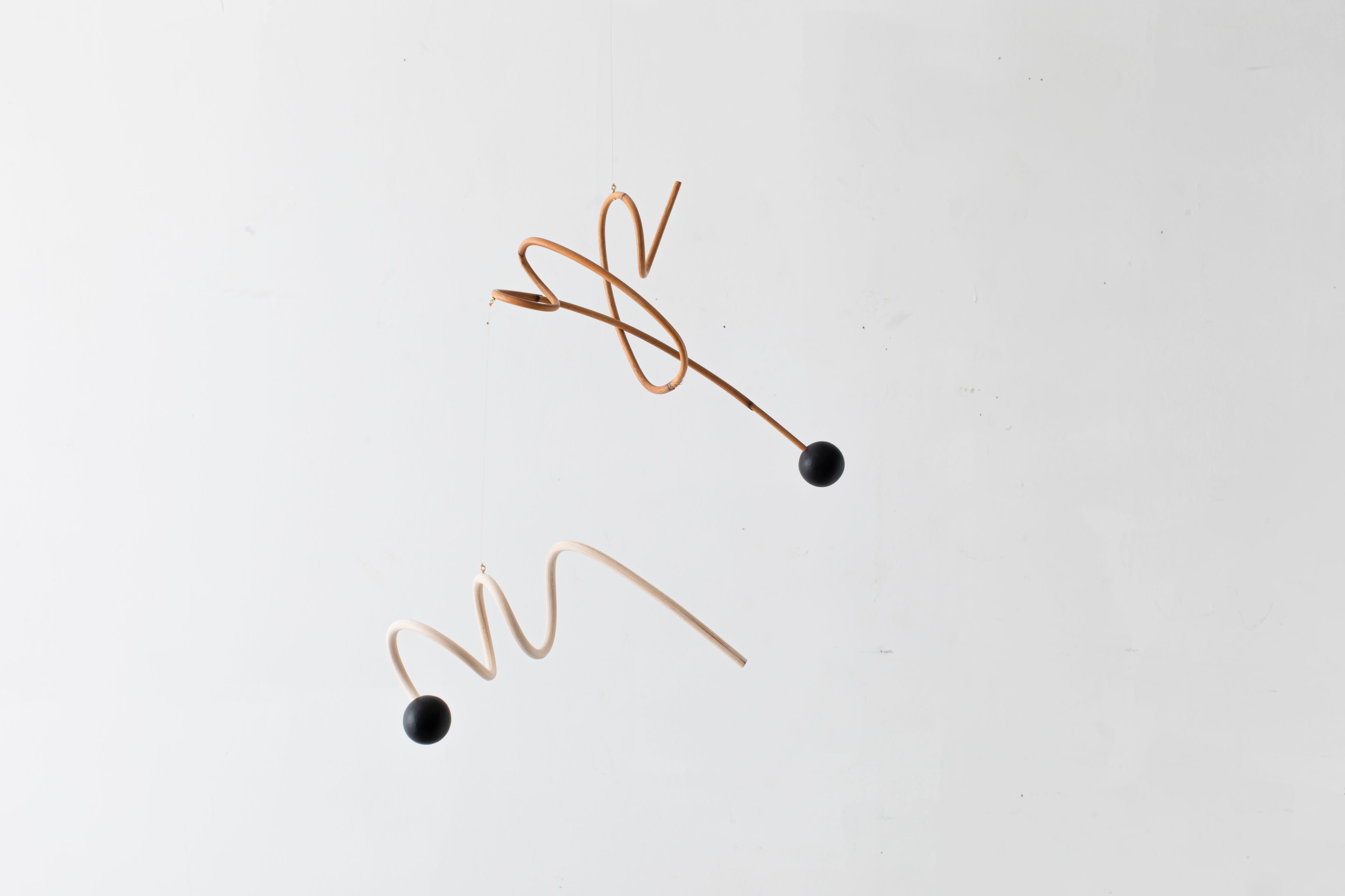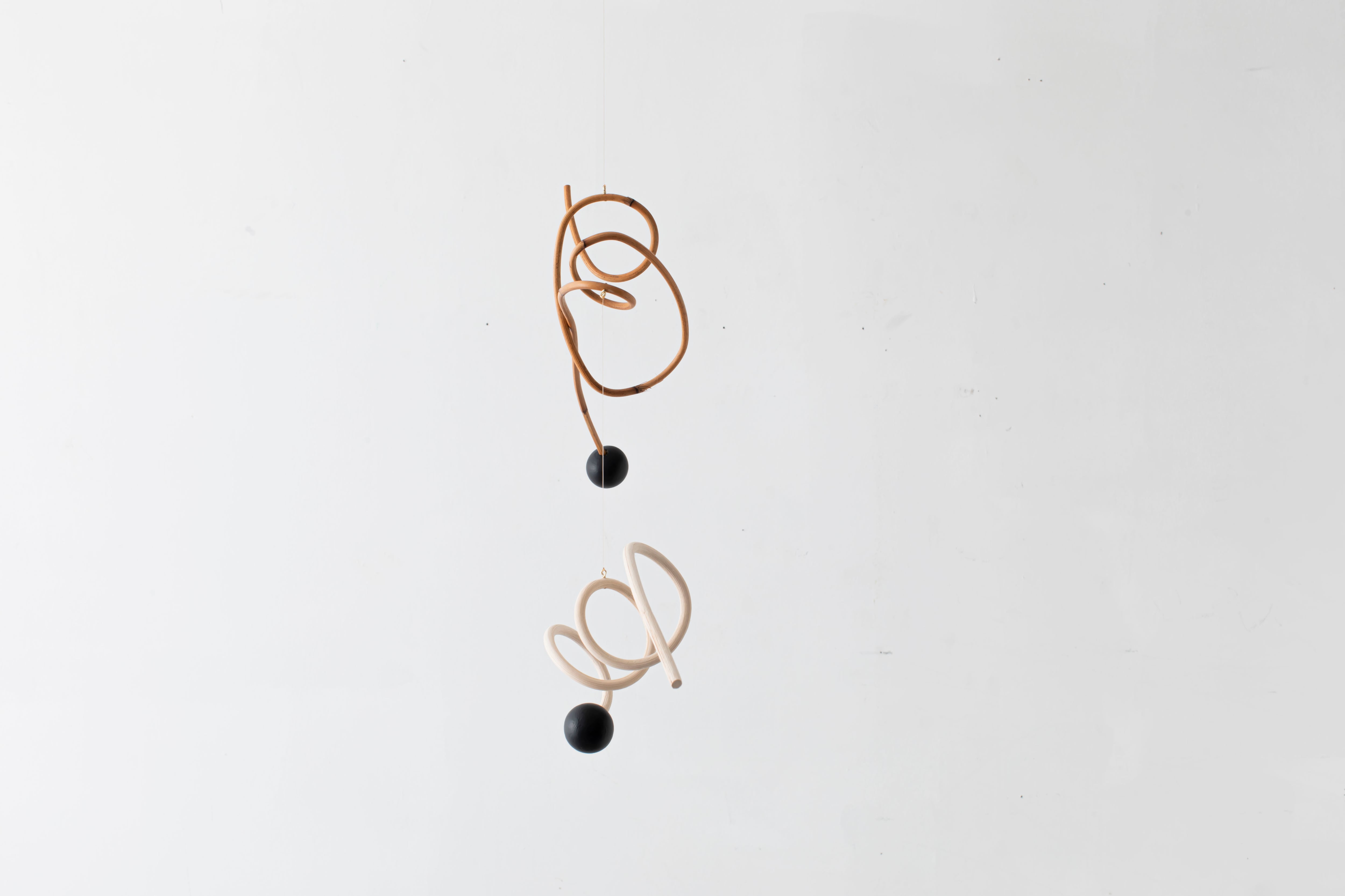 曲線が生み出すアイコニックなフォルムのモビールは、一本の籐を手作業でひとつひとつ型を使用しながら湾曲させて立体的に仕上げています。吊るし紐の長さや、かけ方を変えたりするだけで表情が変えられるので、飾る場所などによってアレンジを効かせながら何通りもの楽しみ方ができます。(※デザインによってはかけ方を変えられないものもございます)