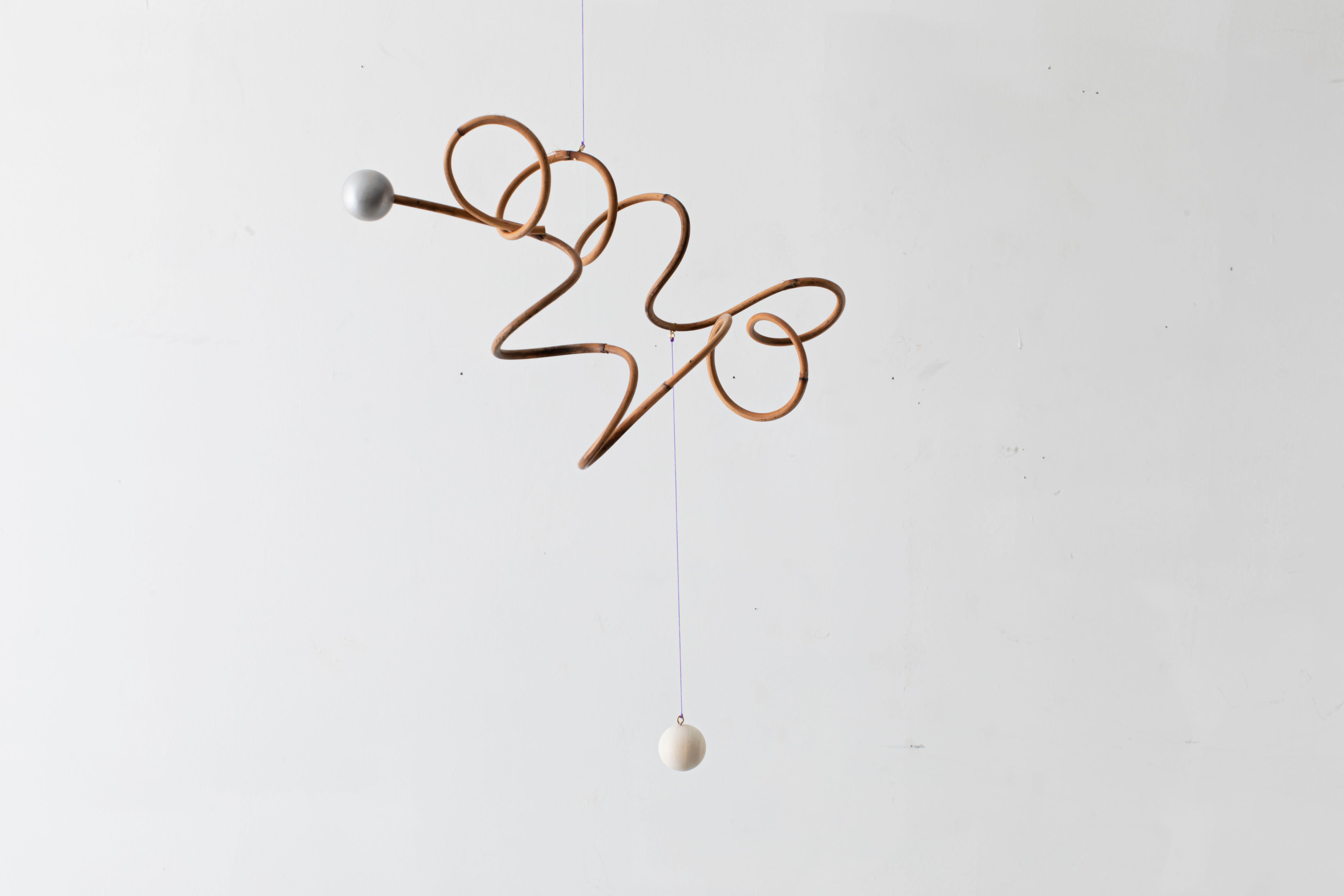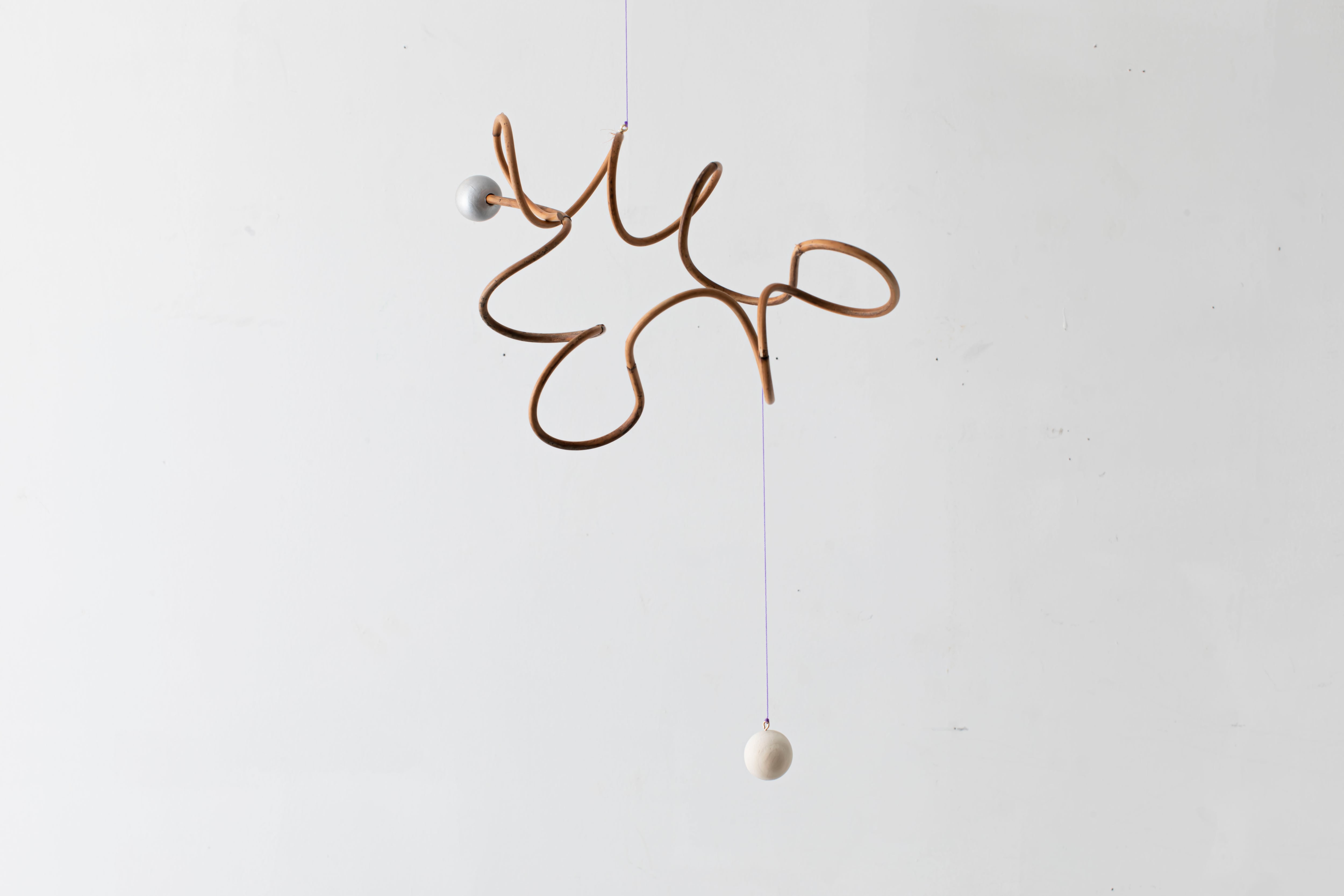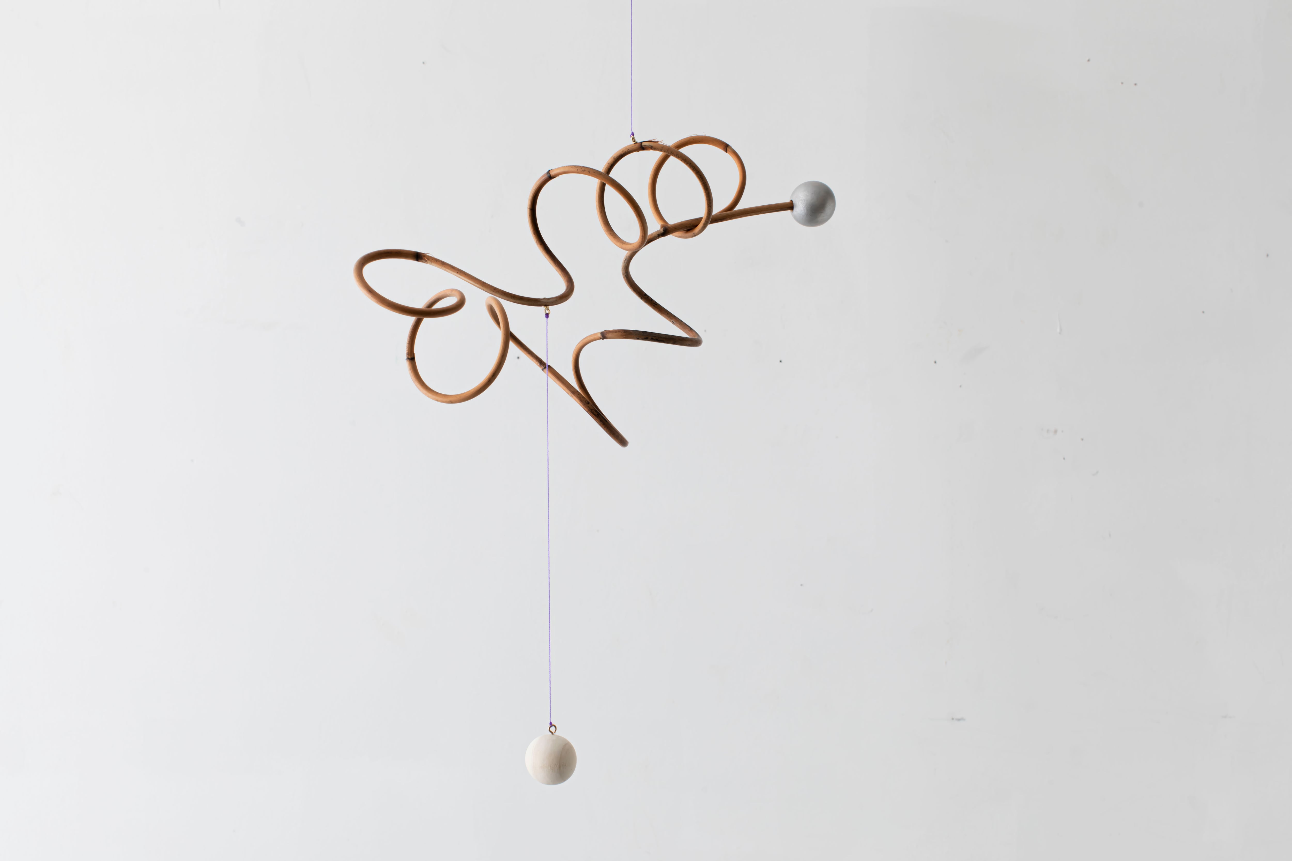 曲線が生み出すアイコニックなフォルムのモビールは、一本の籐を手作業でひとつひとつ型を使用しながら湾曲させて立体的に仕上げています。吊るし紐の長さや、かけ方を変えたりするだけで表情が変えられるので、飾る場所などによってアレンジを効かせながら何通りもの楽しみ方ができます。表情の変化もぜひお楽しみください。