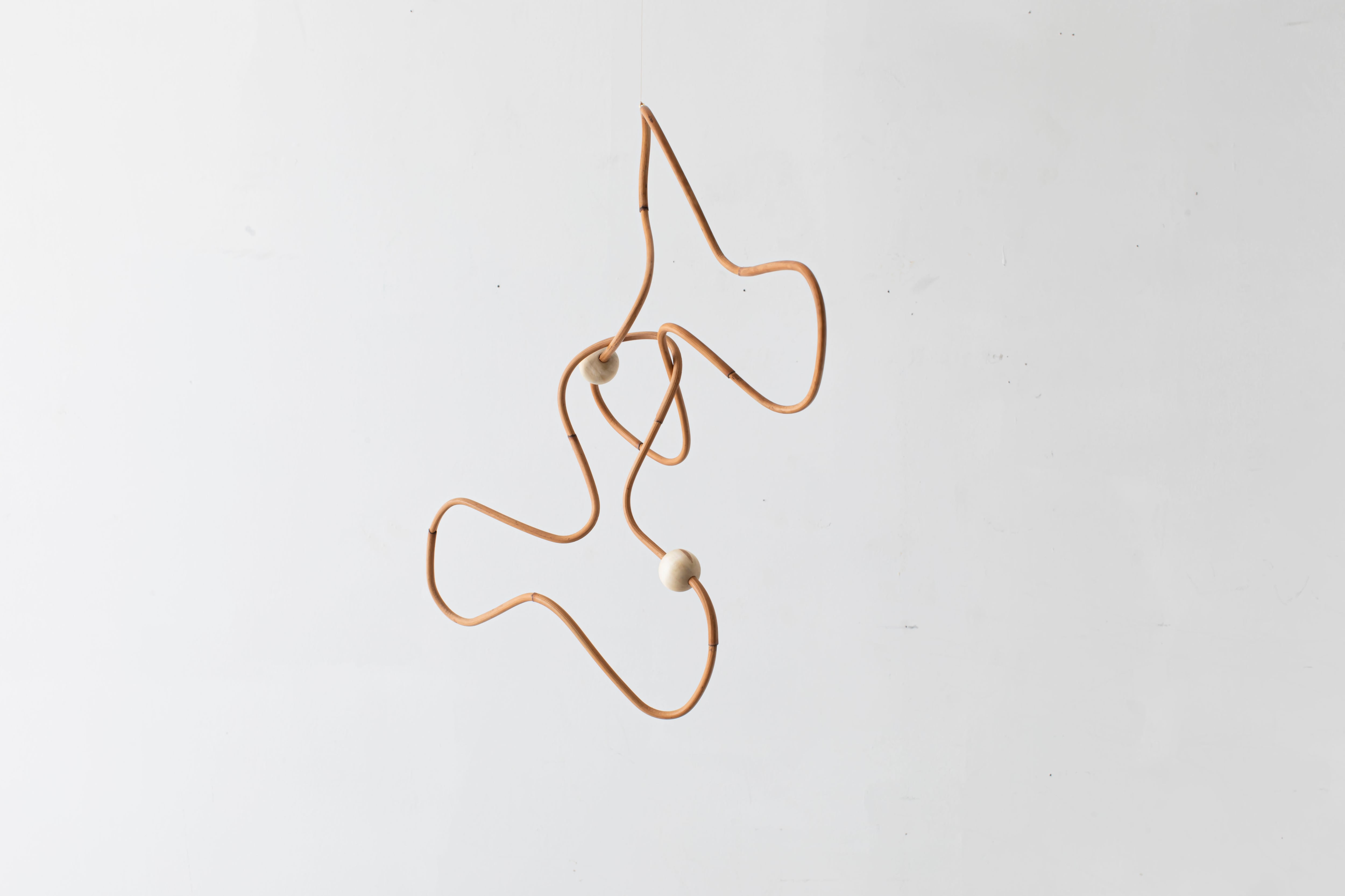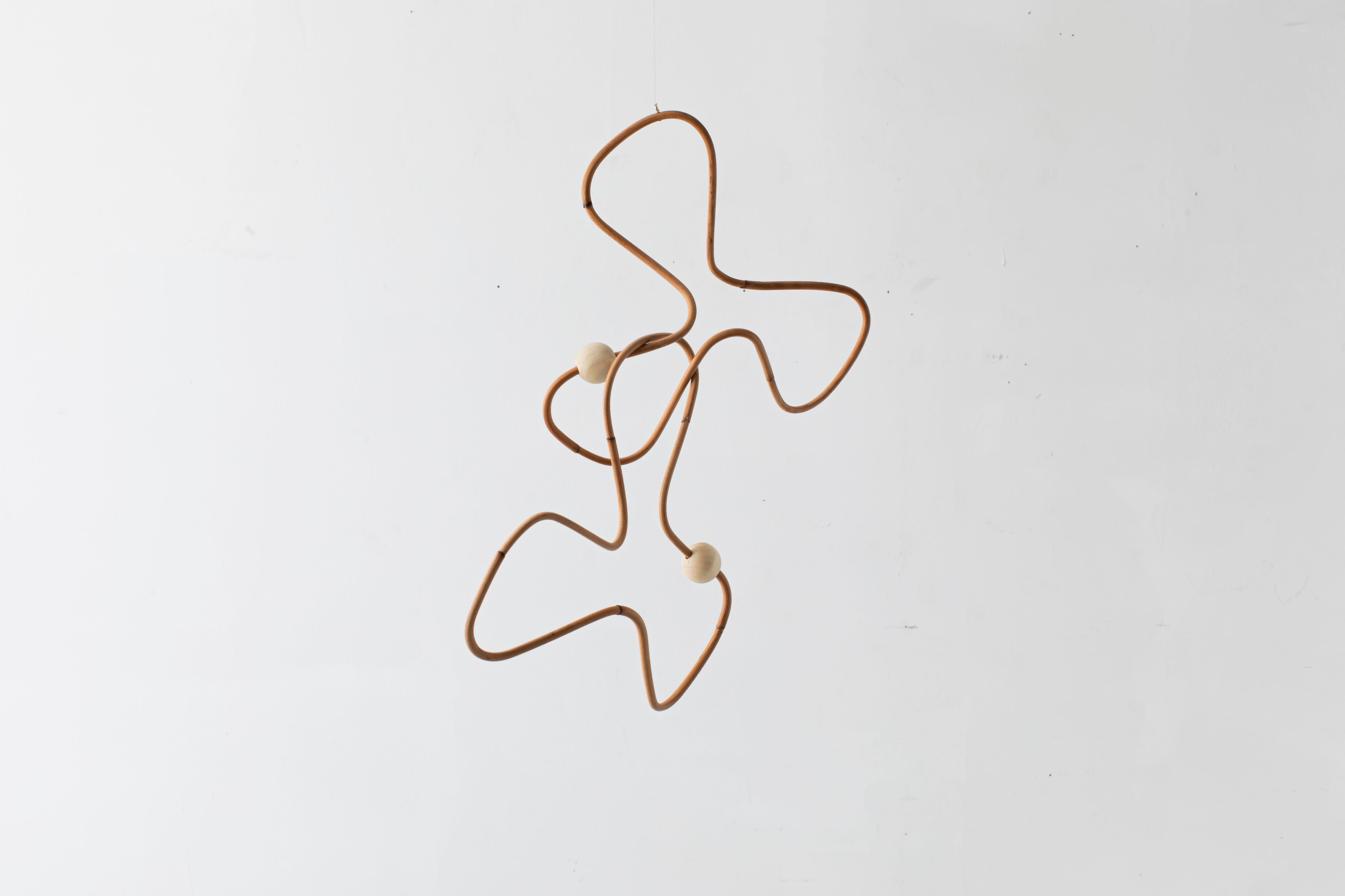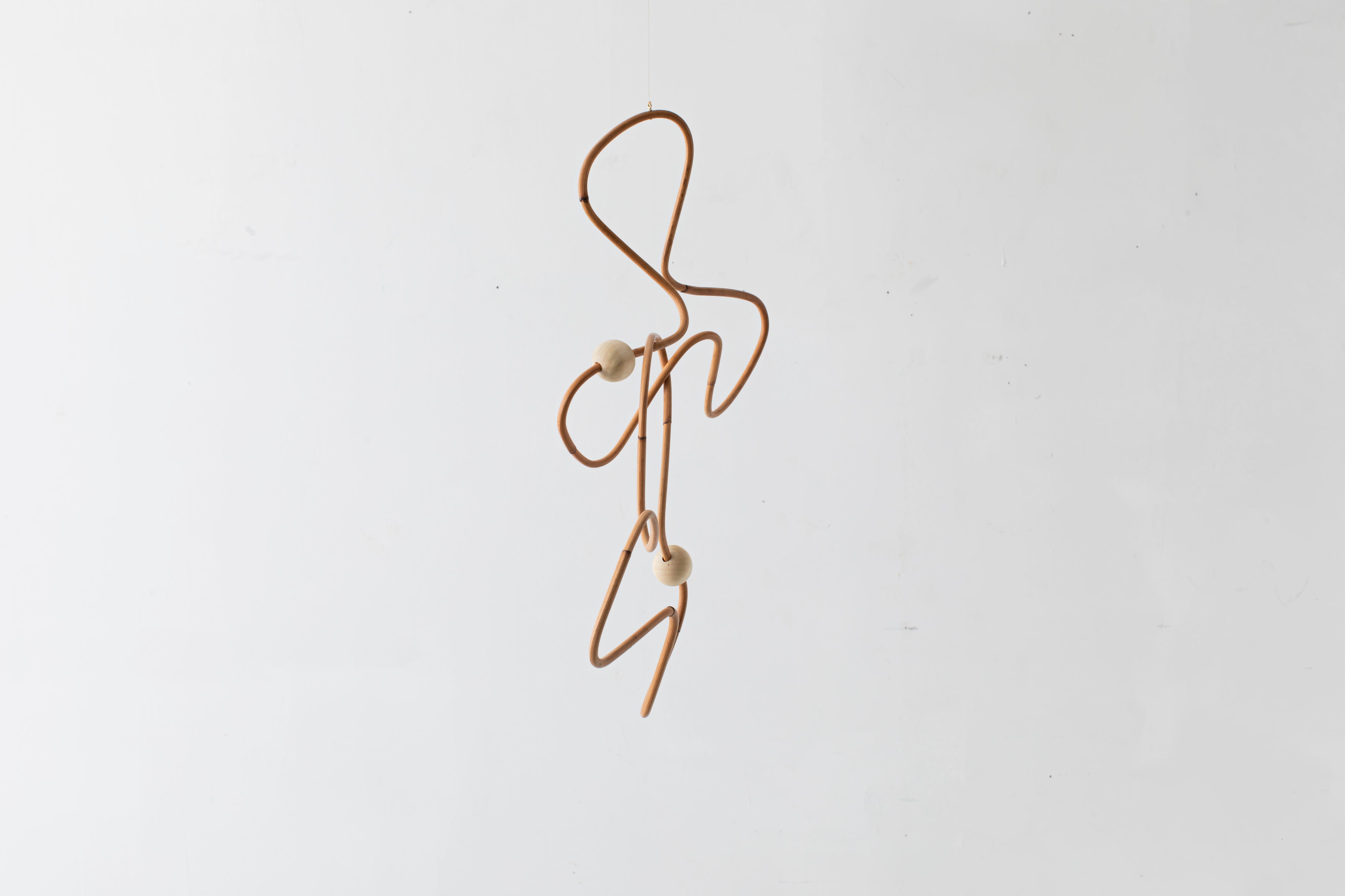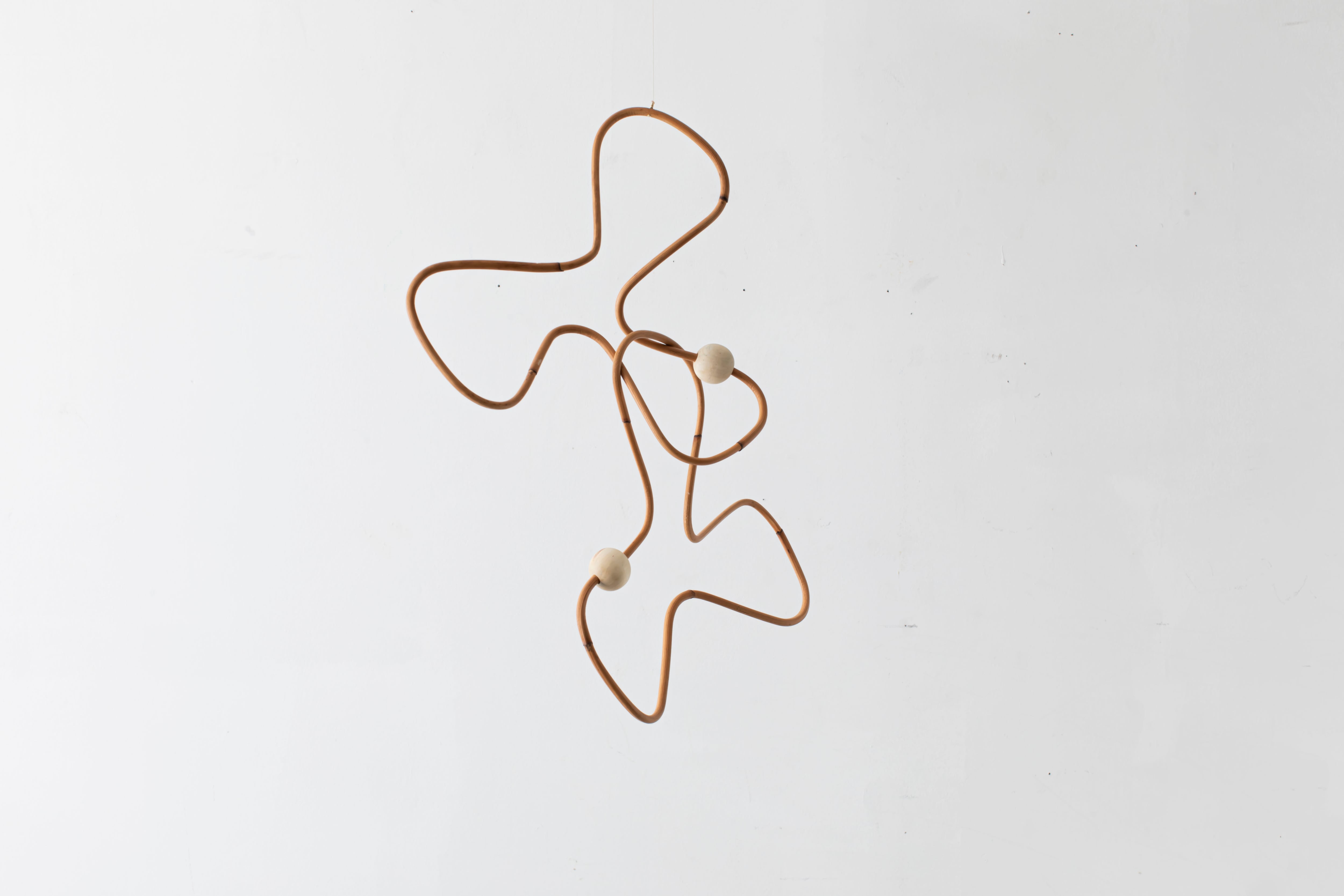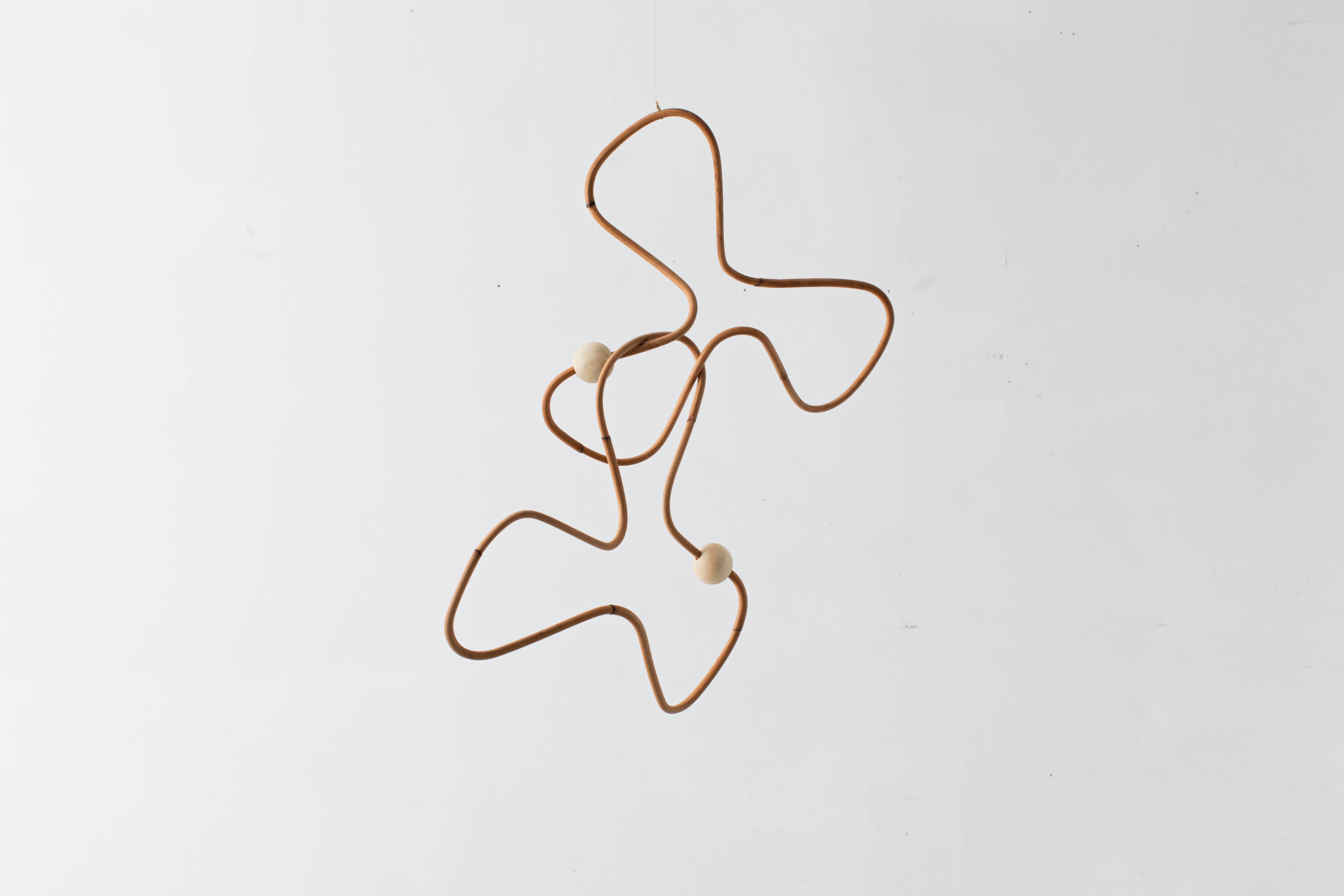 曲線が生み出すアイコニックなフォルムのモビールは、一本の籐を手作業でひとつひとつ型を使用しながら湾曲させて立体的に仕上げています。吊るし紐の長さや、かけ方を変えたりするだけで表情が変えられるので、飾る場所などによってアレンジを効かせながら何通りもの楽しみ方ができます。表情の変化もぜひお楽しみください。