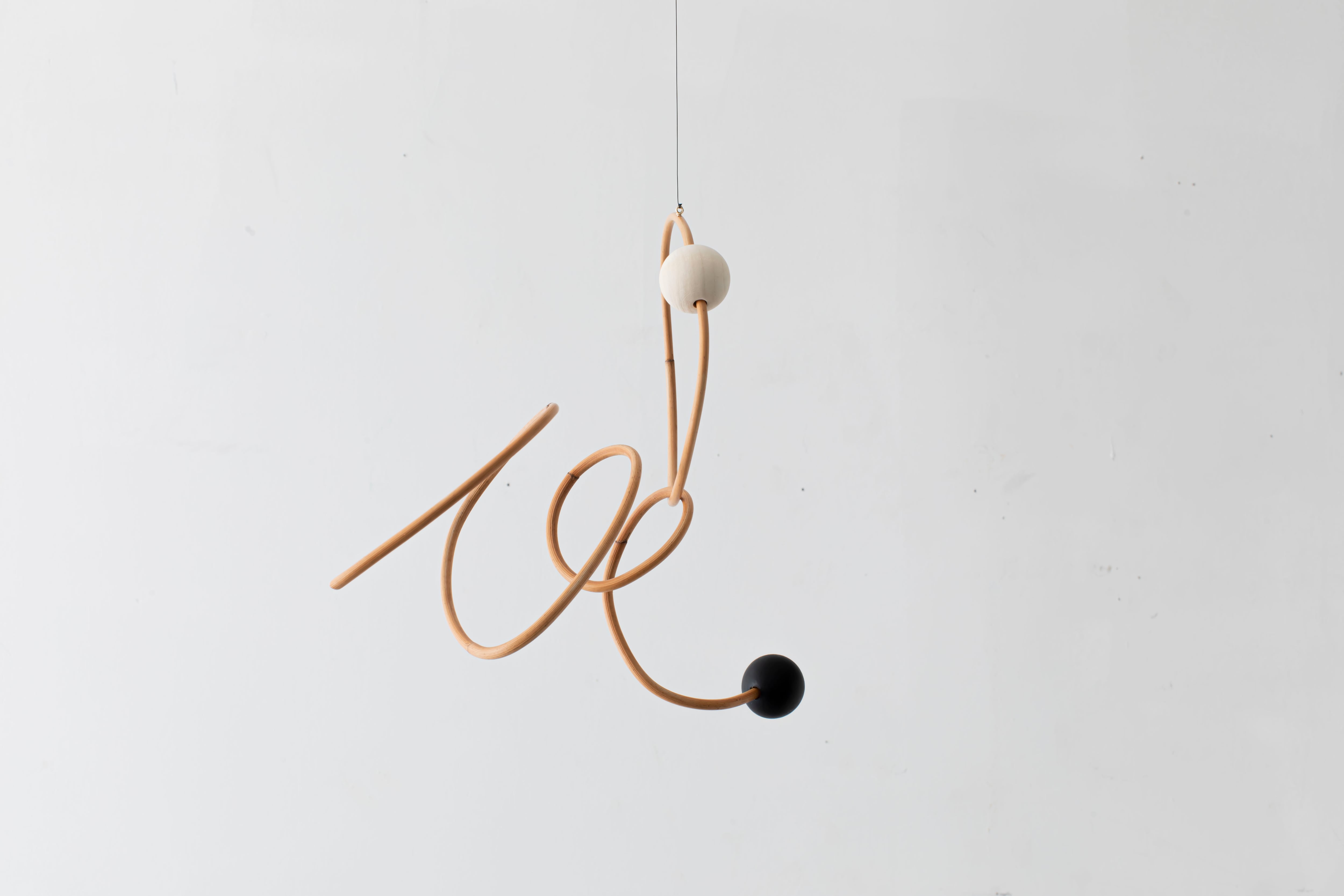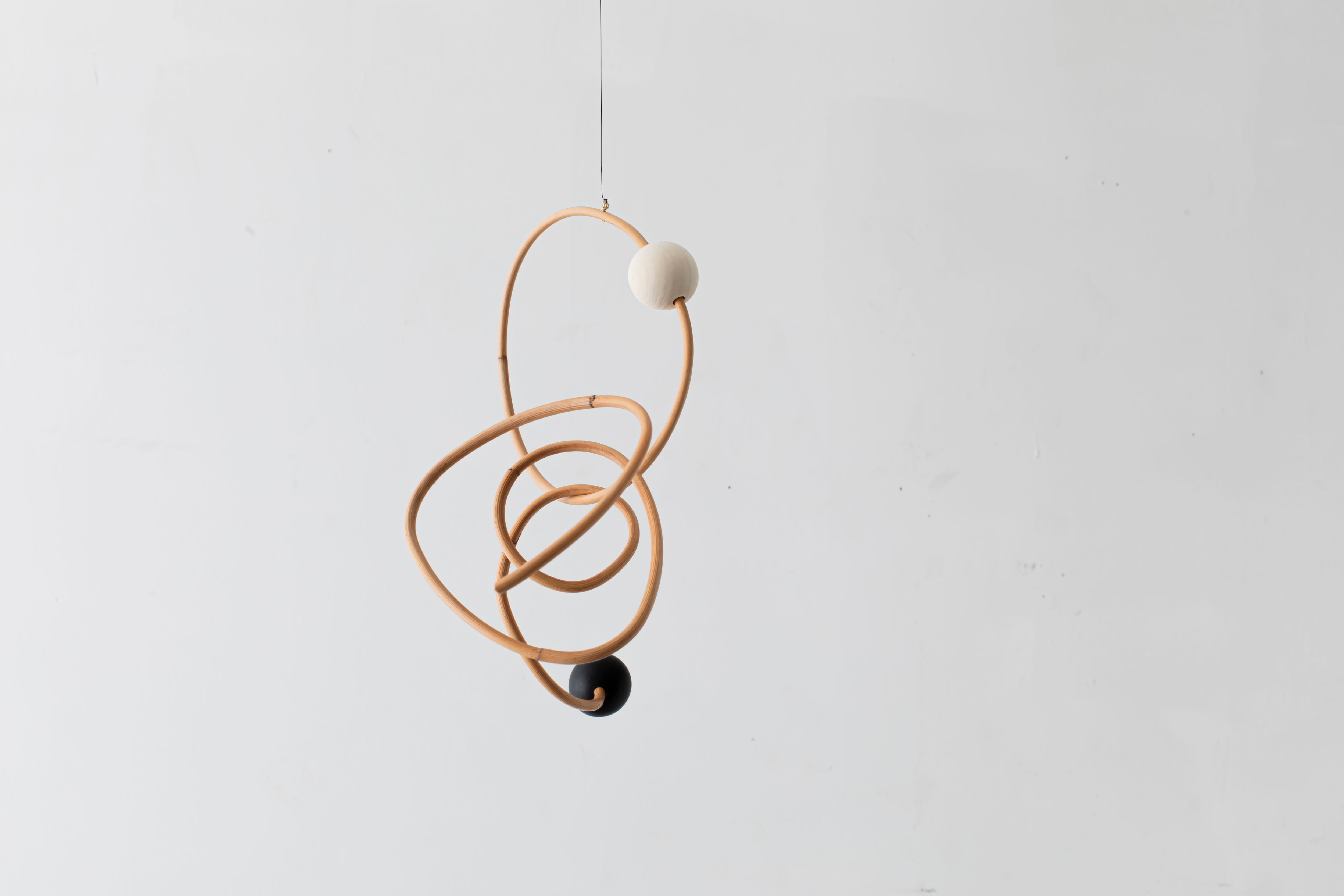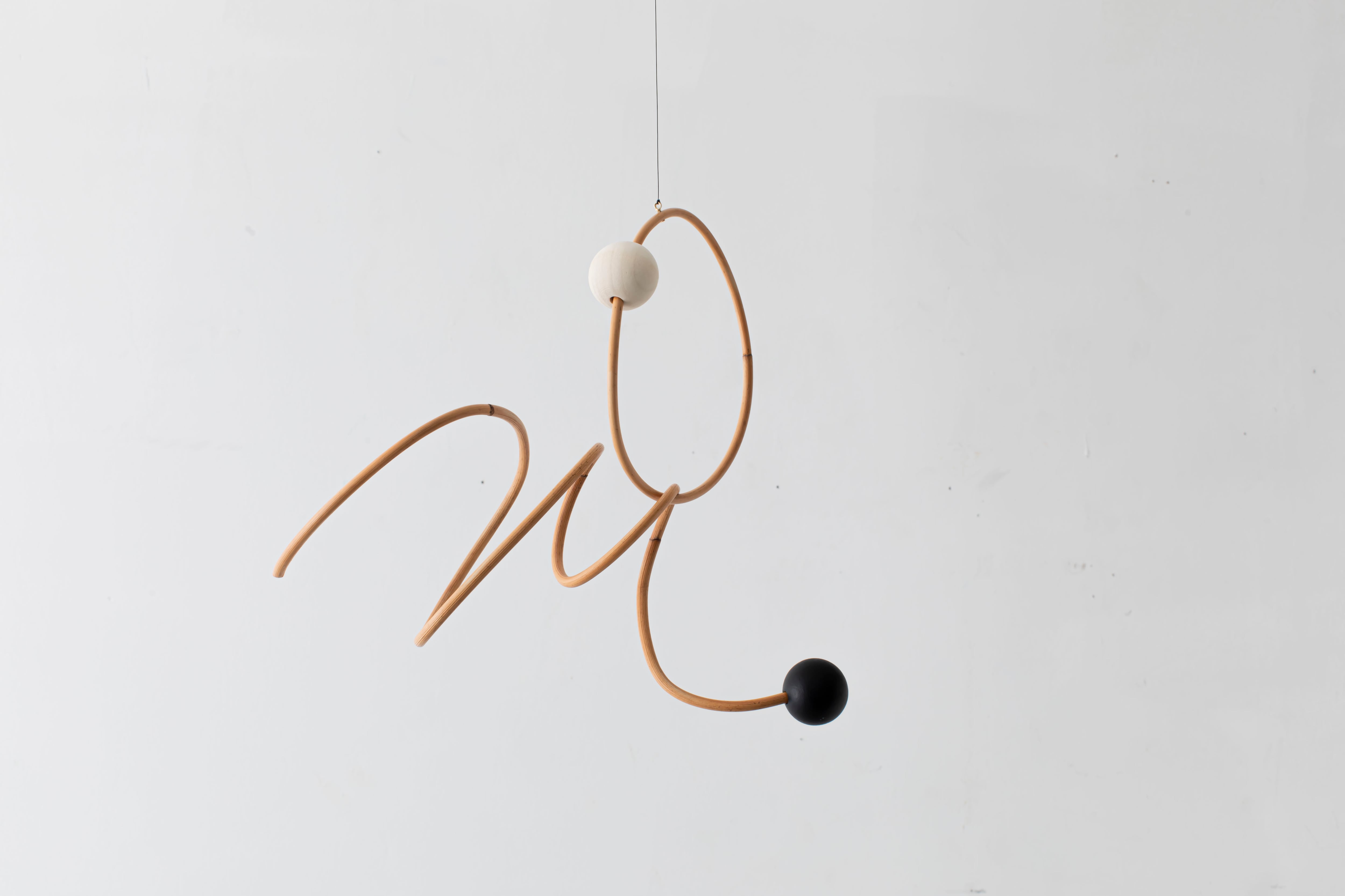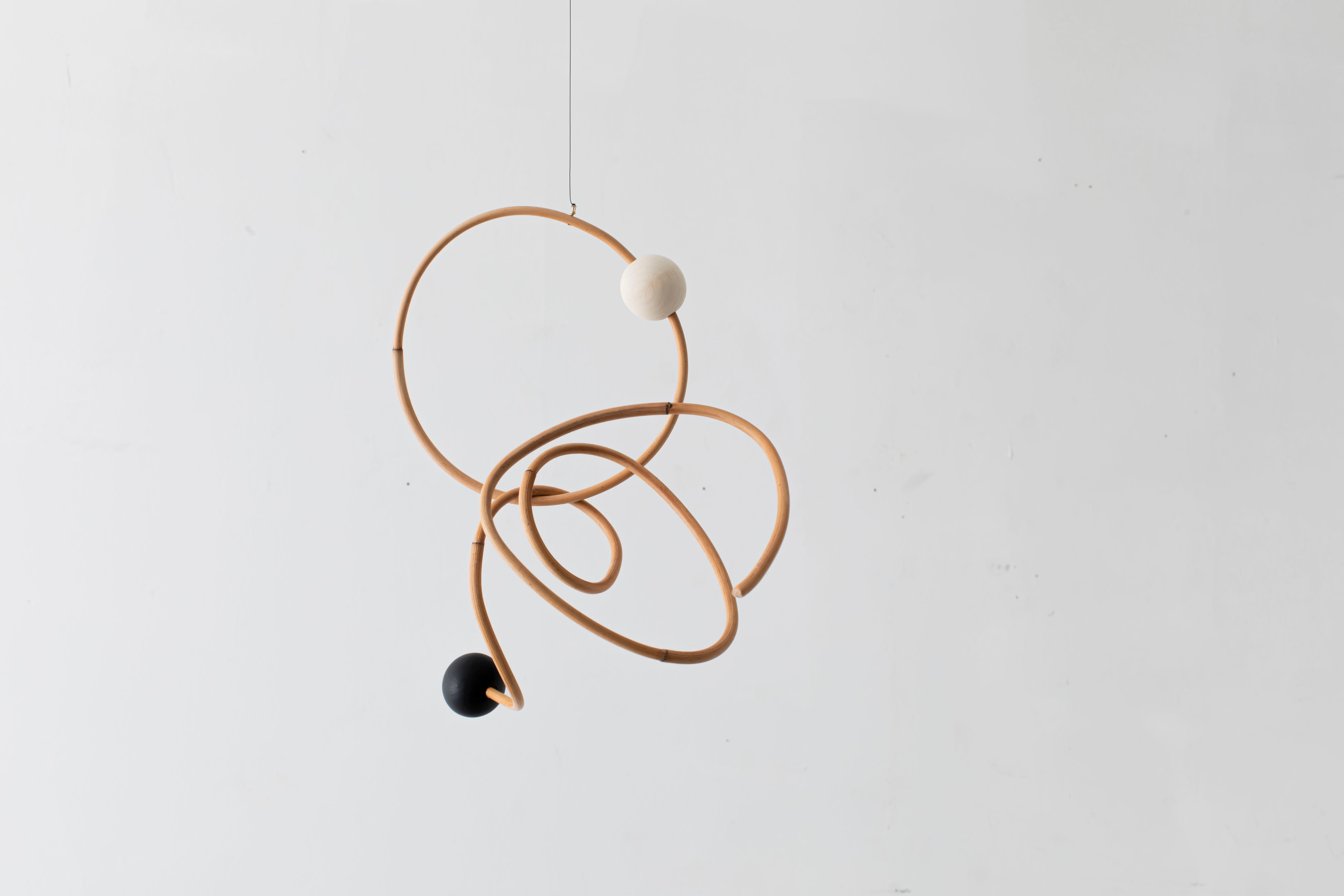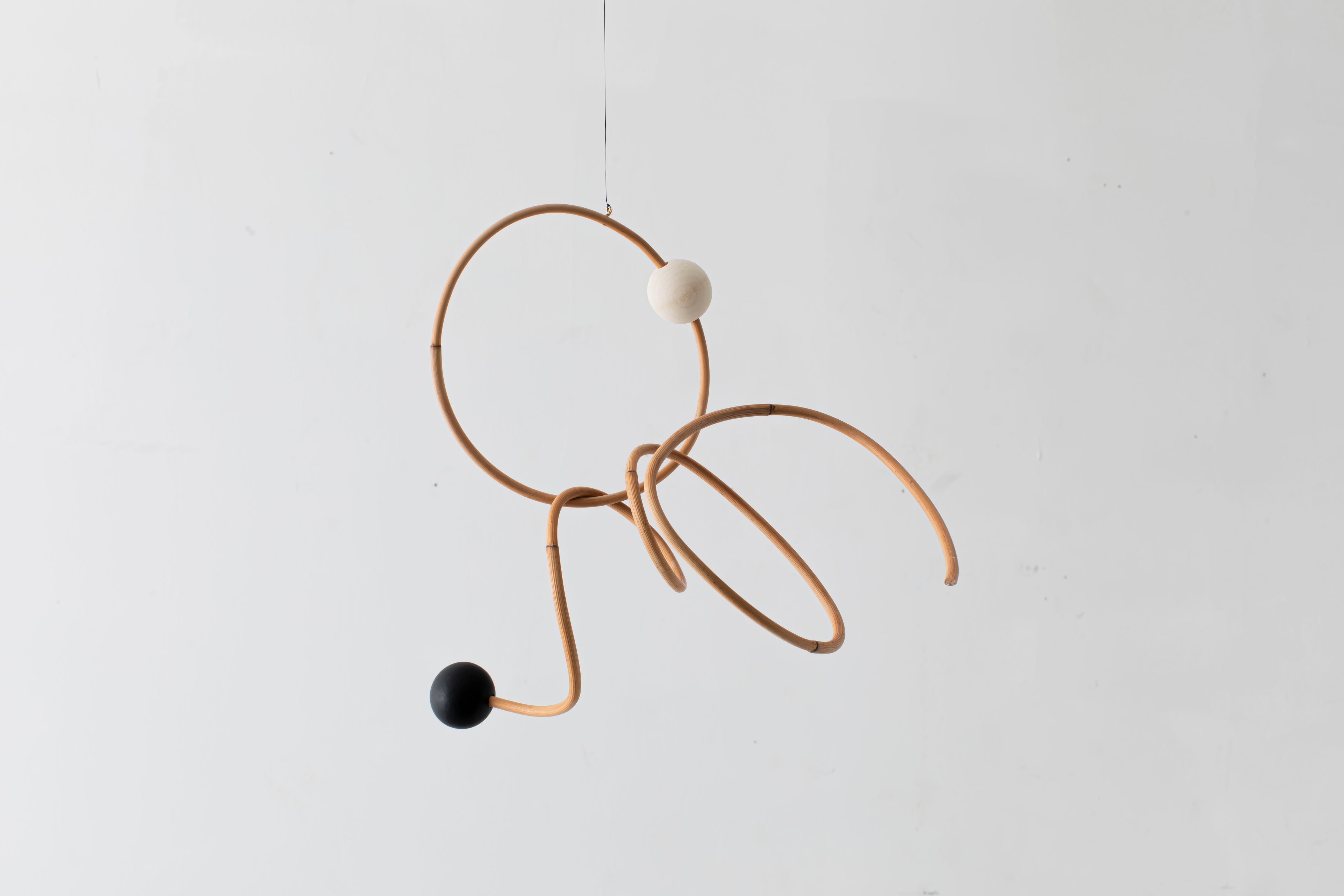 曲線が生み出すアイコニックなフォルムのモビールは、一本の籐を手作業でひとつひとつ型を使用しながら湾曲させて立体的に仕上げています。吊るし紐の長さや、かけ方を変えたりするだけで表情が変えられるので、飾る場所などによってアレンジを効かせながら何通りもの楽しみ方ができます。表情の変化もぜひお楽しみください。