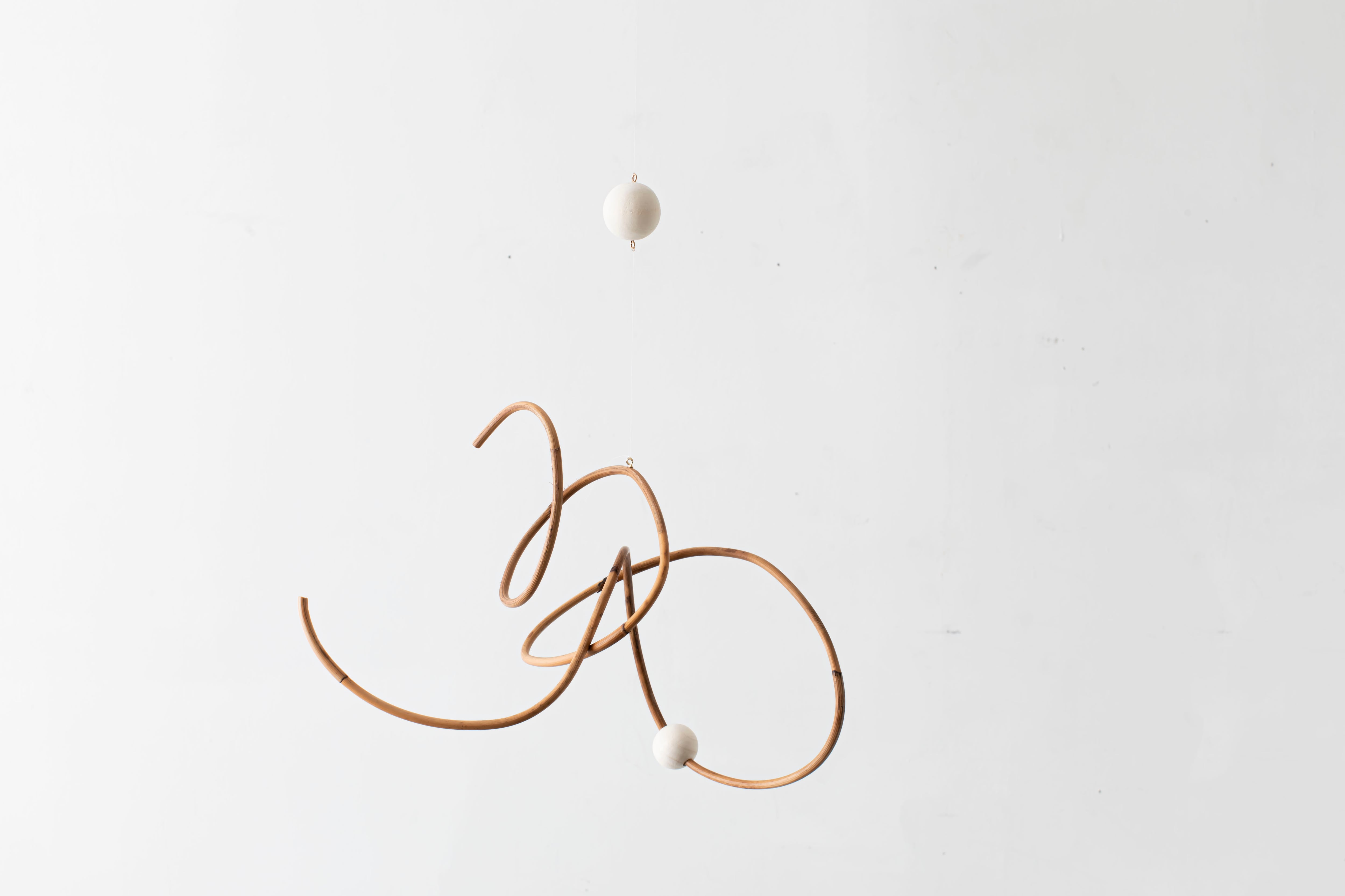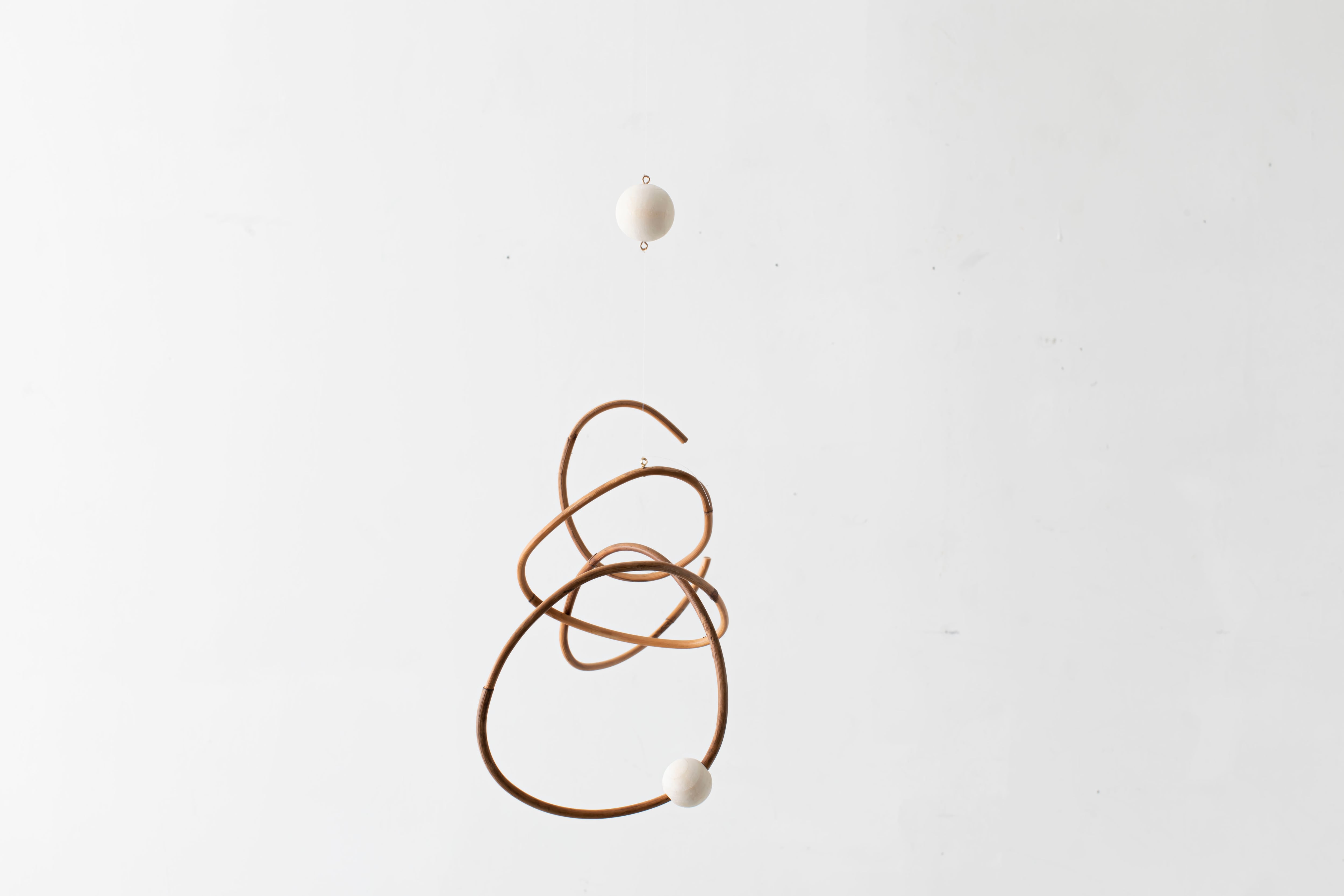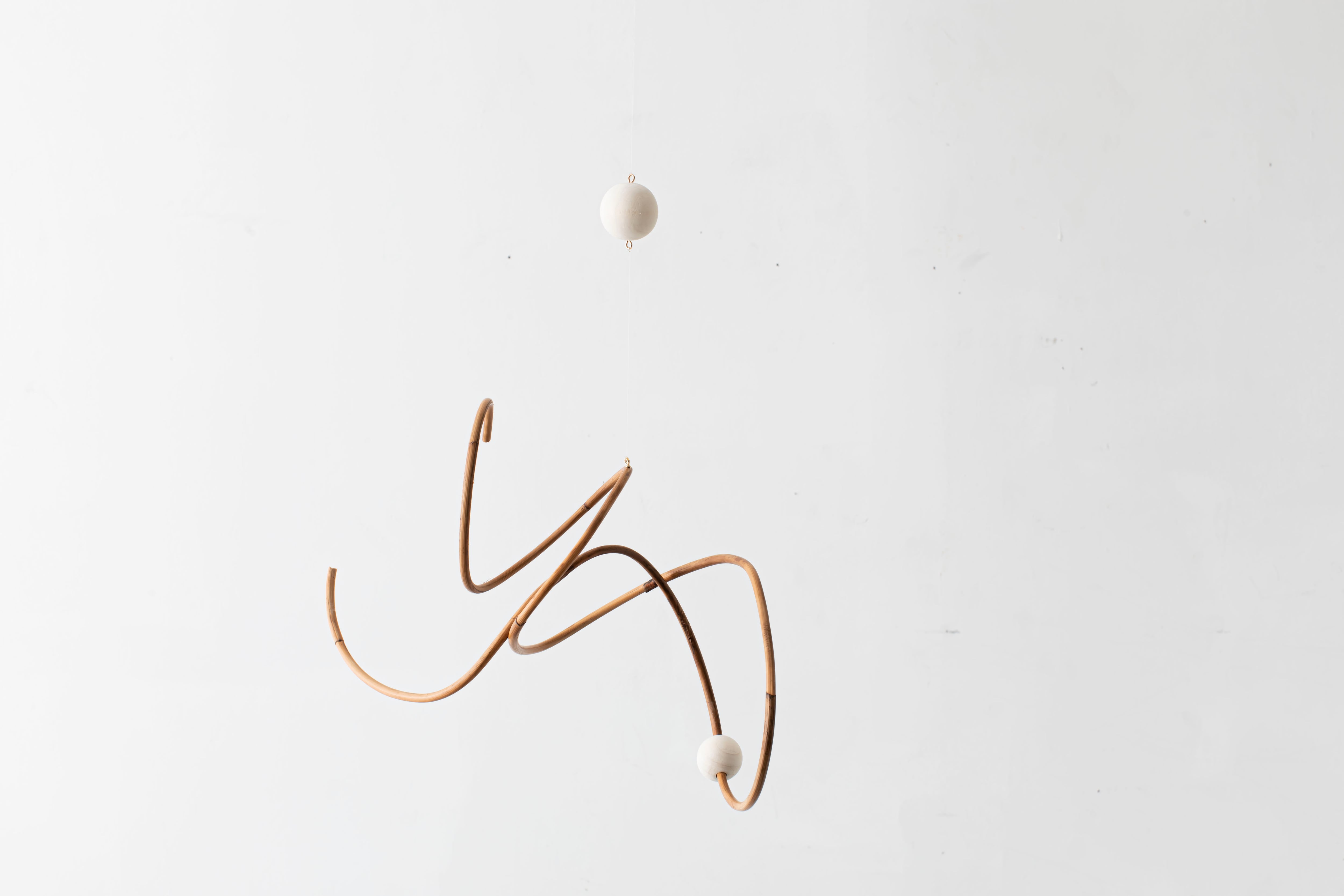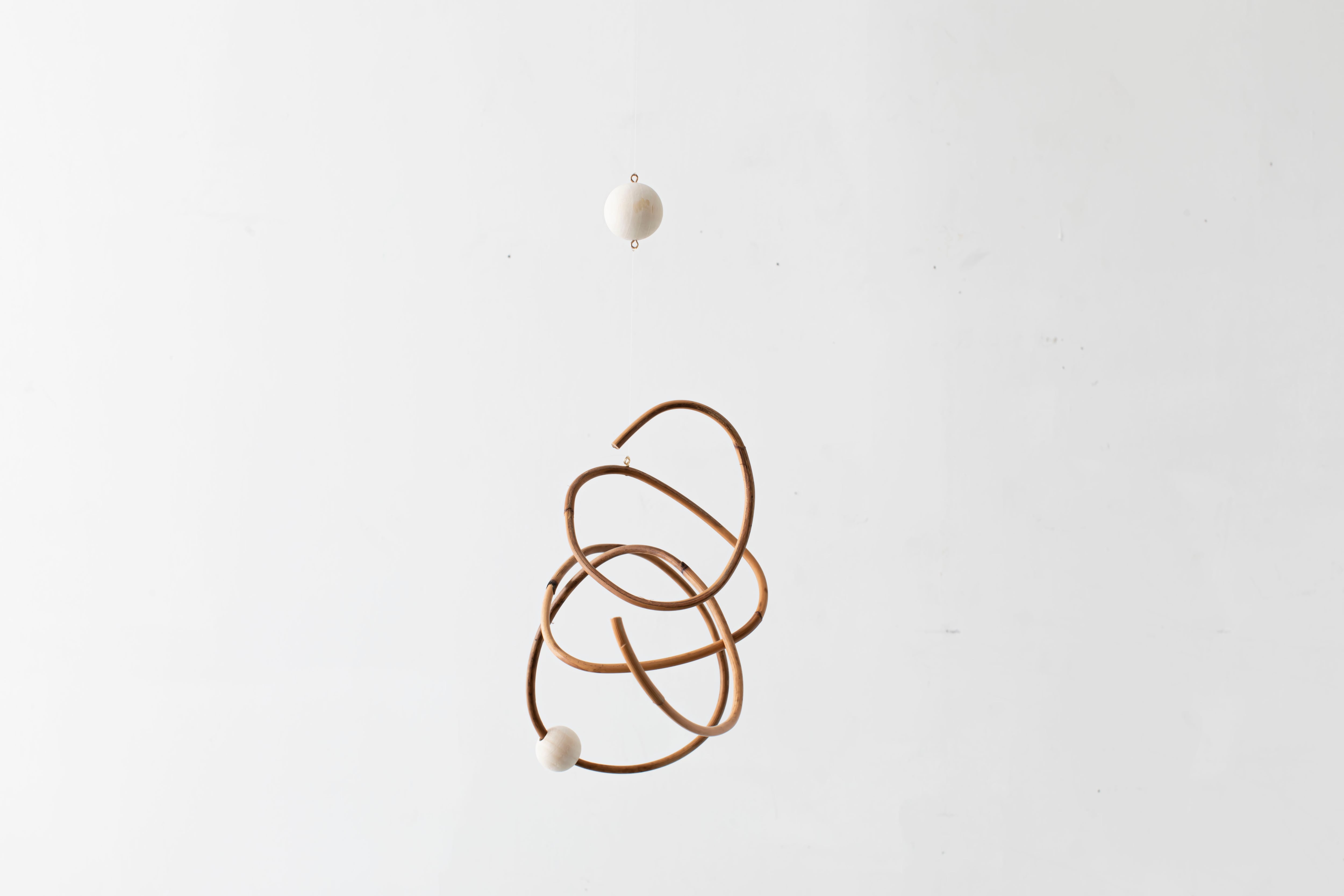 曲線が生み出すアイコニックなフォルムのモビールは、一本の籐を手作業でひとつひとつ型を使用しながら湾曲させて立体的に仕上げています。吊るし紐の長さや、かけ方を変えたりするだけで表情が変えられるので、飾る場所などによってアレンジを効かせながら何通りもの楽しみ方ができます。表情の変化もぜひお楽しみください。