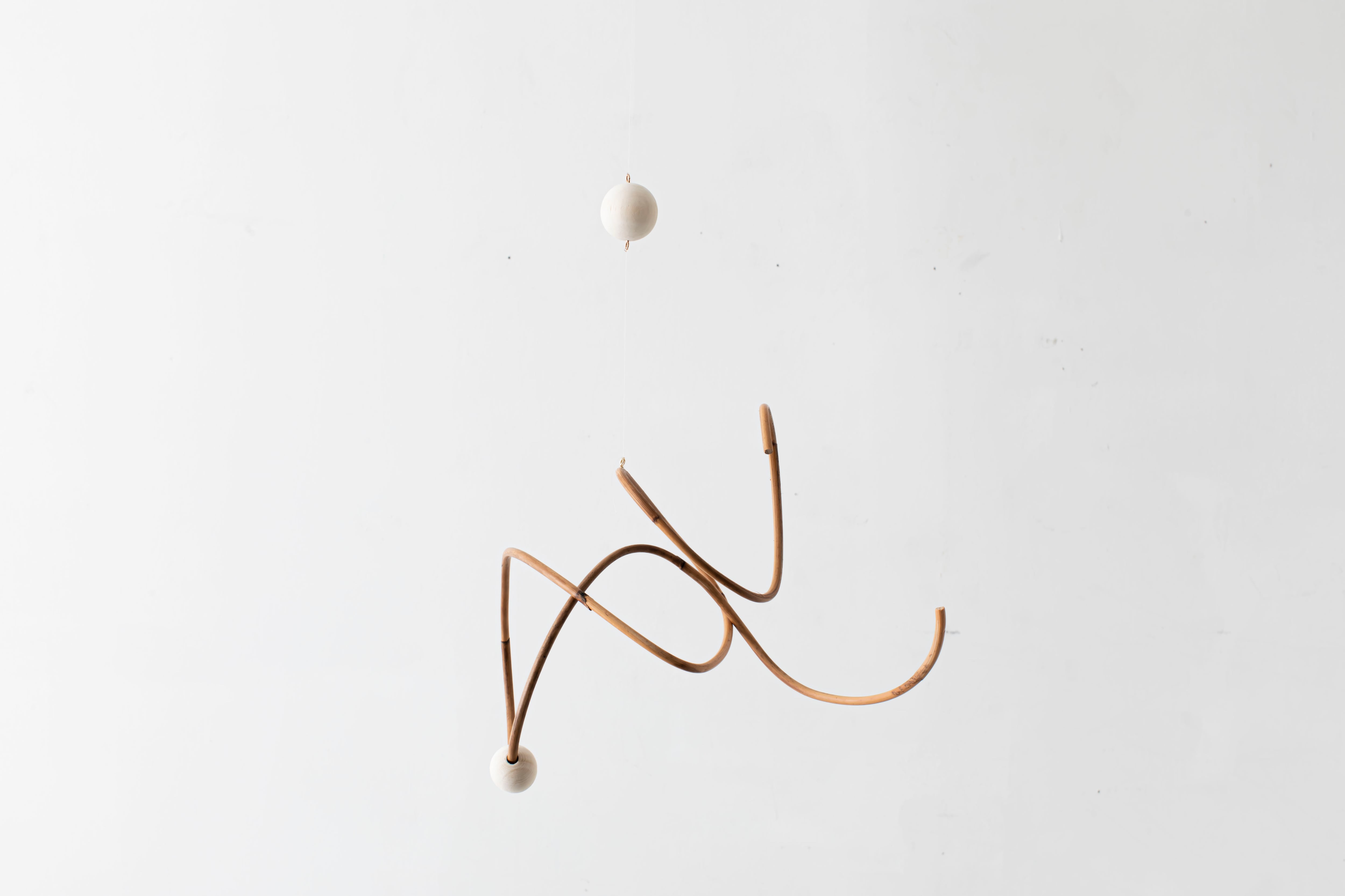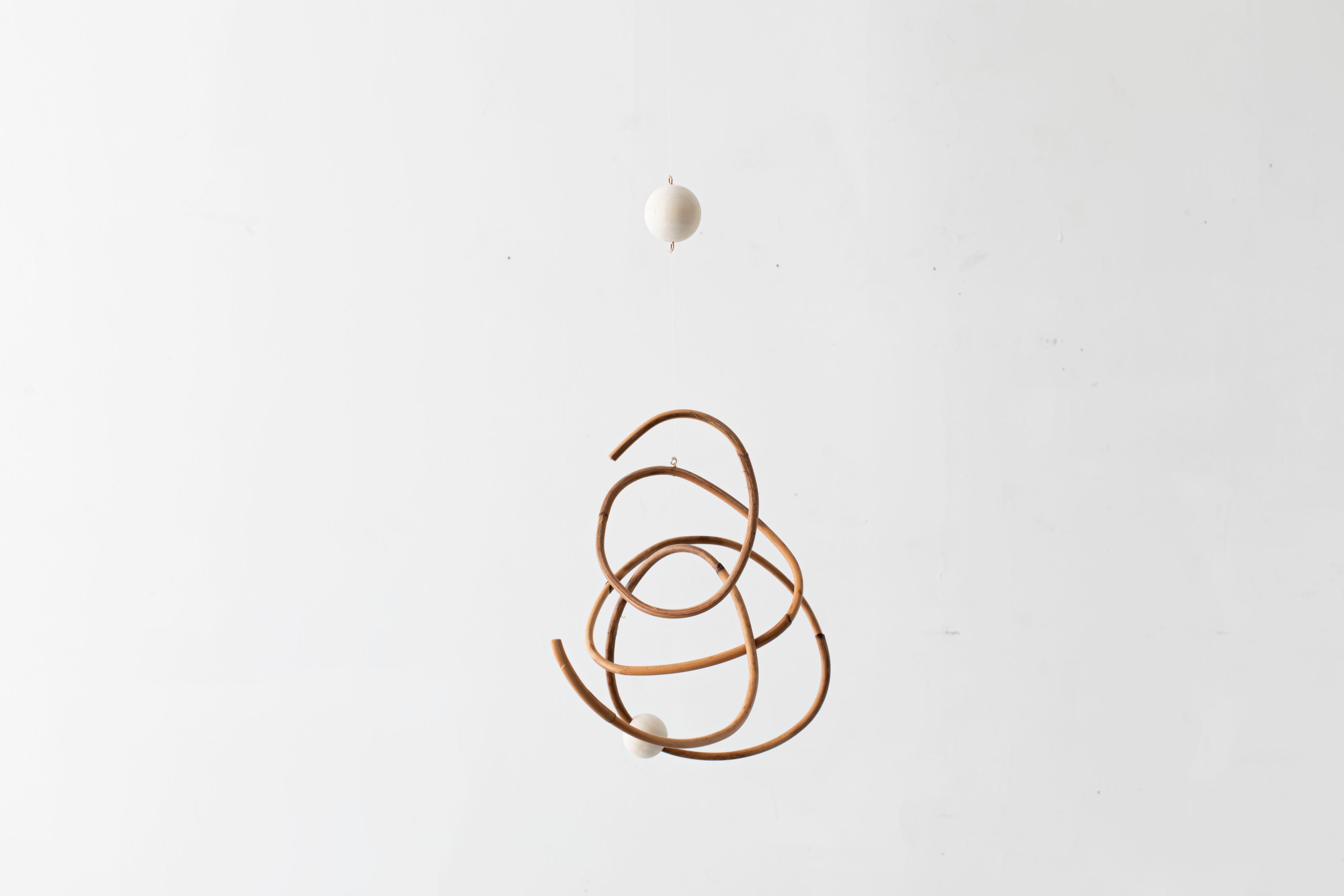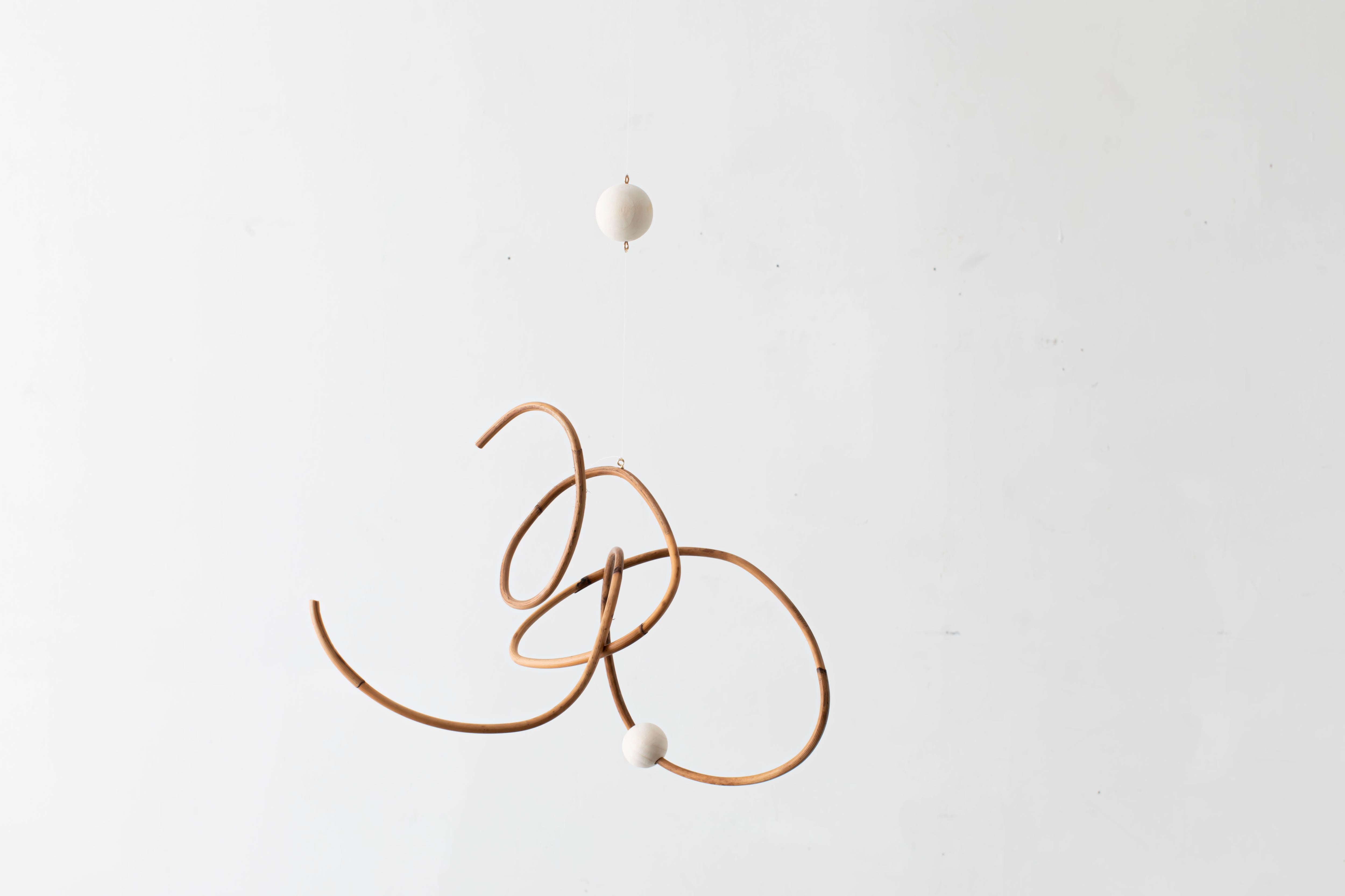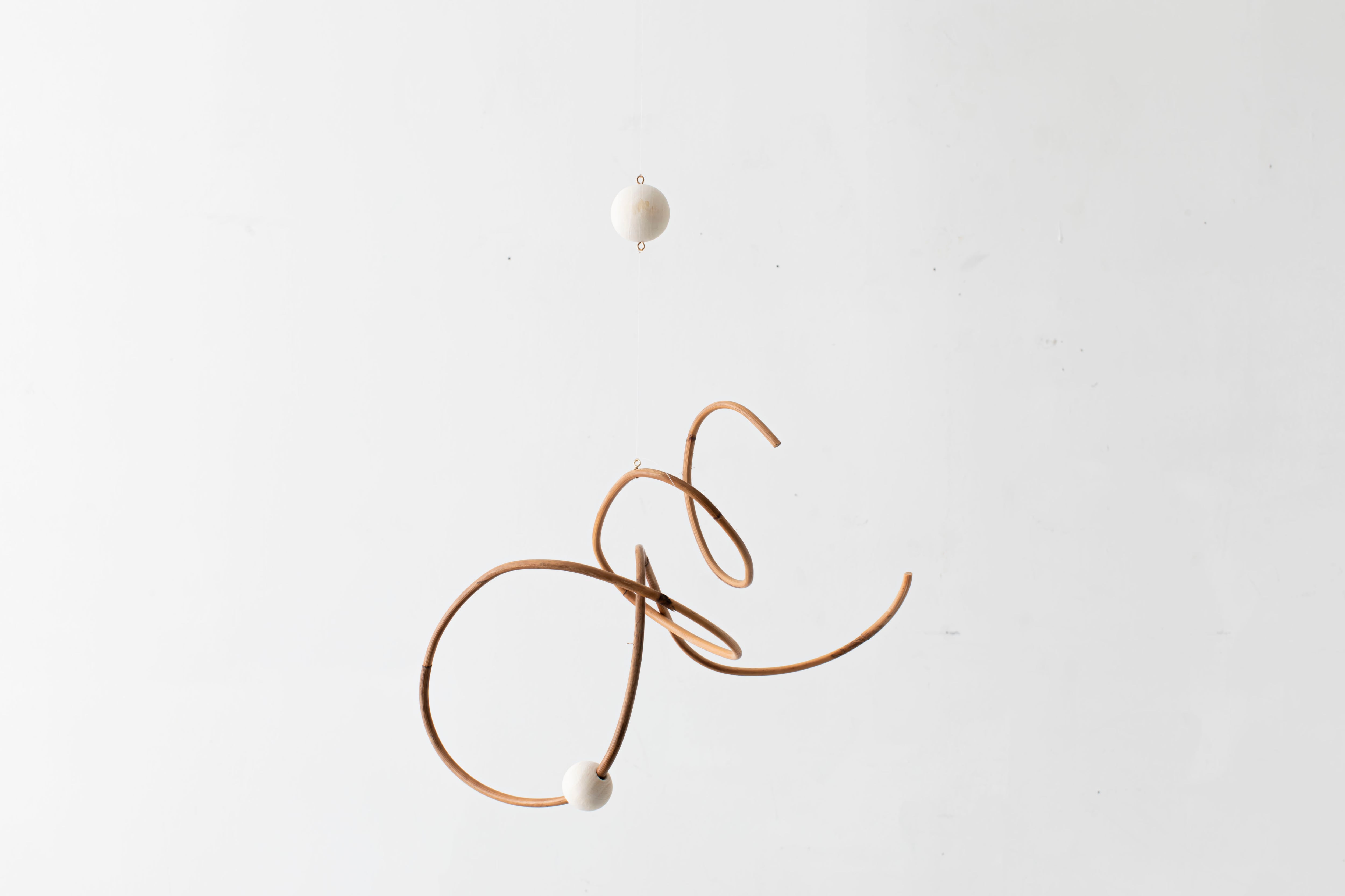 曲線が生み出すアイコニックなフォルムのモビールは、一本の籐を手作業でひとつひとつ型を使用しながら湾曲させて立体的に仕上げています。吊るし紐の長さや、かけ方を変えたりするだけで表情が変えられるので、飾る場所などによってアレンジを効かせながら何通りもの楽しみ方ができます。表情の変化もぜひお楽しみください。