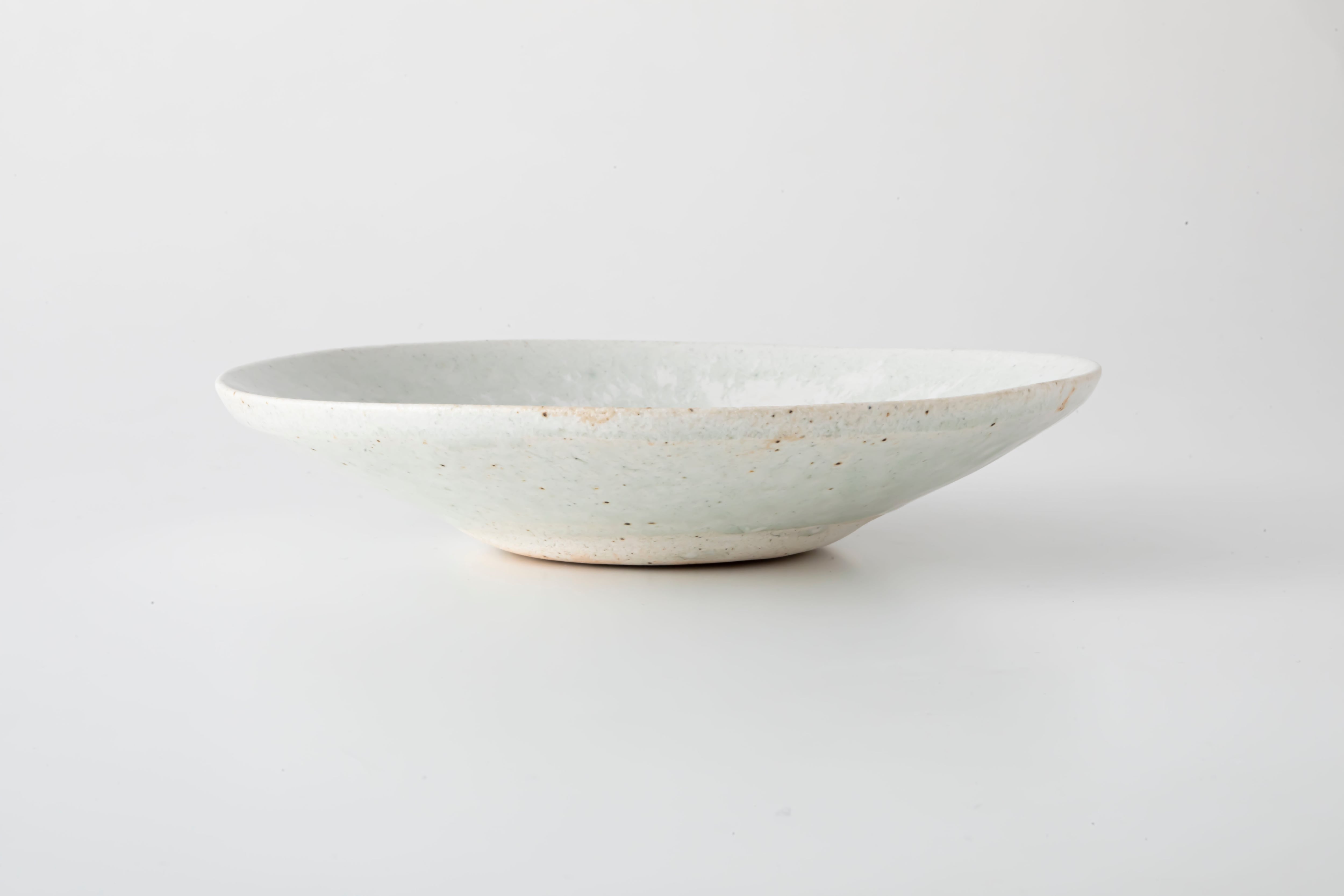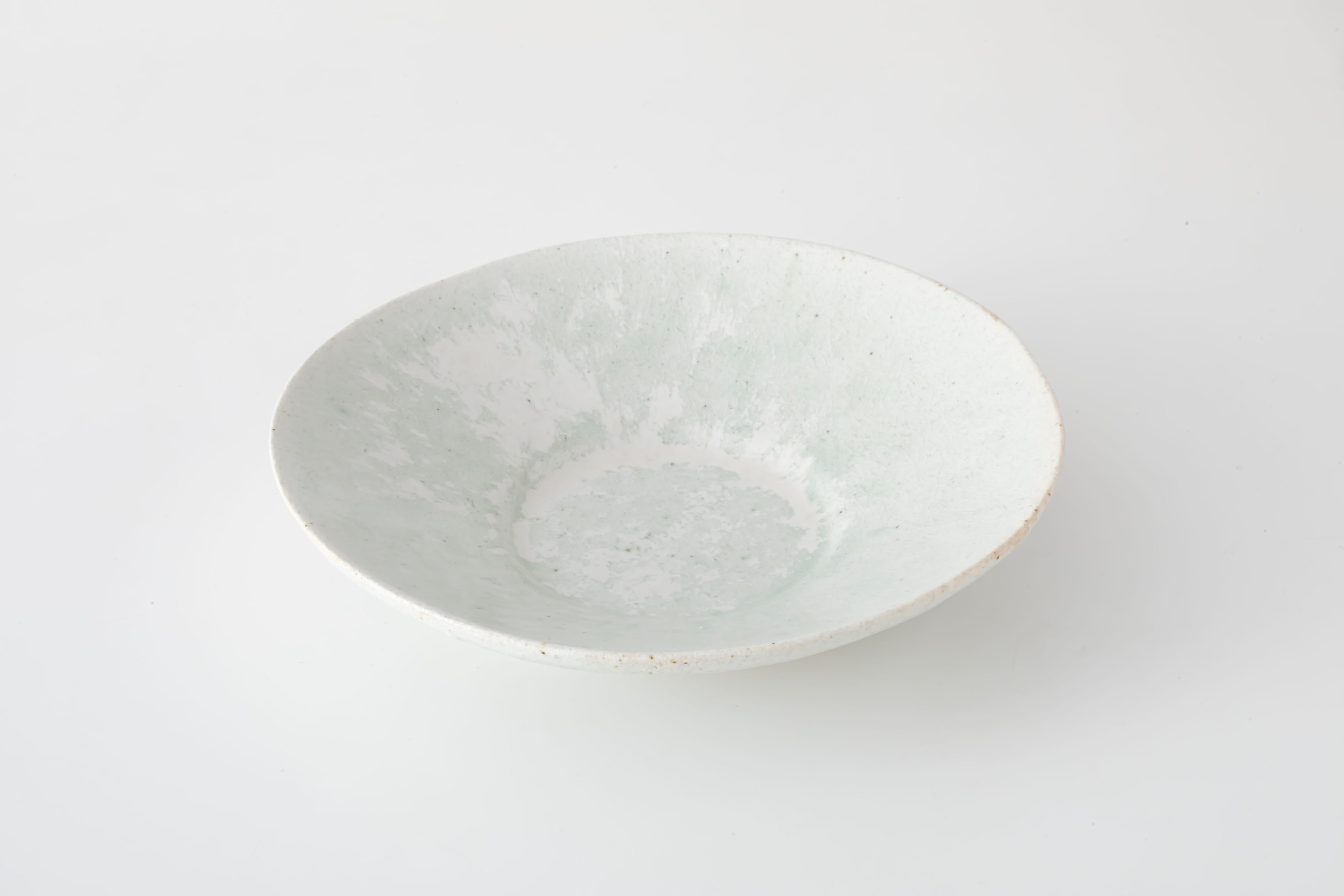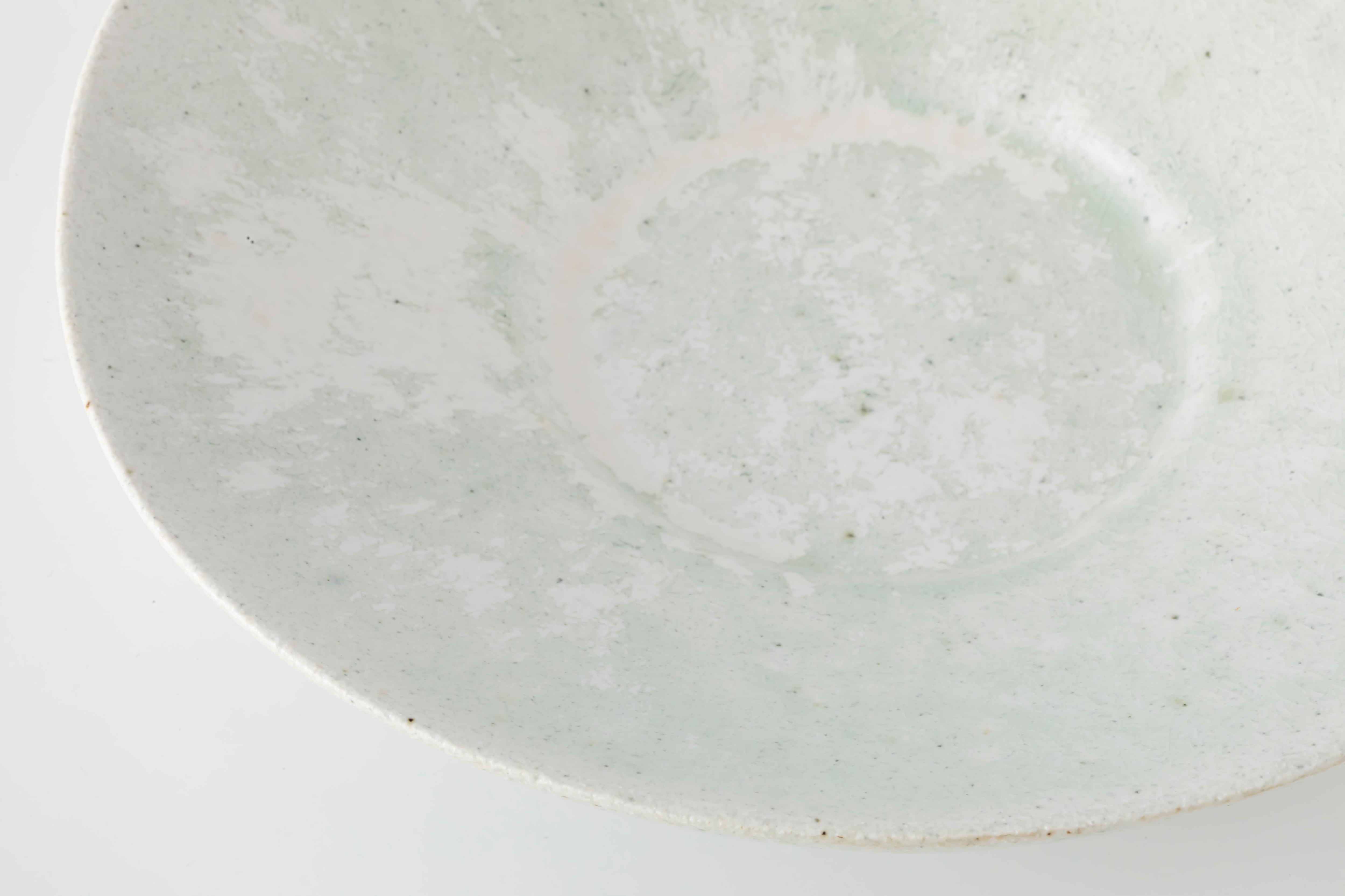 焼成によって一つひとつ異なる表情を見せる、十場あすかさんの器。白を基調としながらも、土の色味や釉薬の溜まりによって、生成りや淡い青みを感じる奥行きのある景色が広がります。貫入が魅せる繊細な表情と優しい佇まいの中に、土の持つ力強さも感じられる一枚です。
