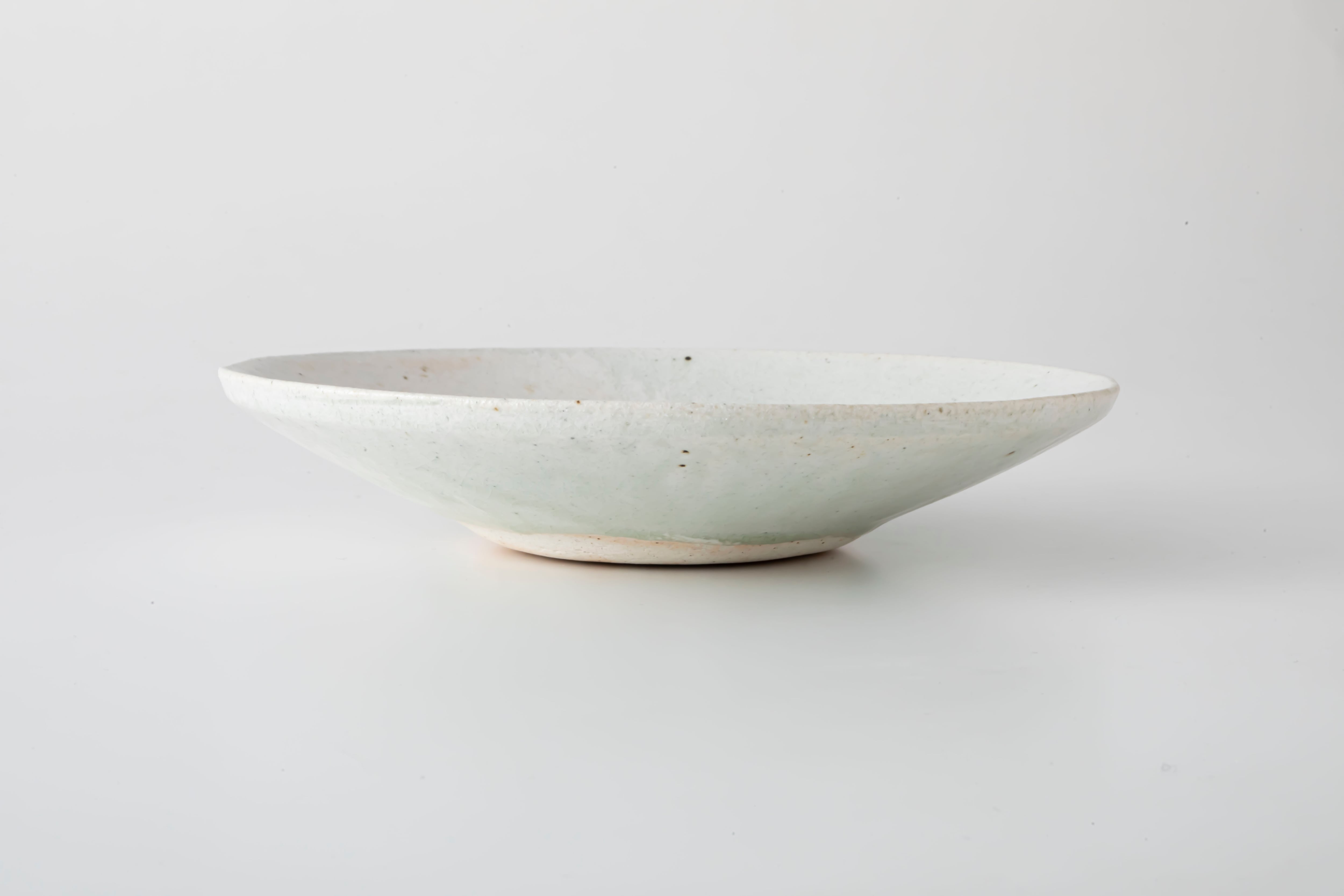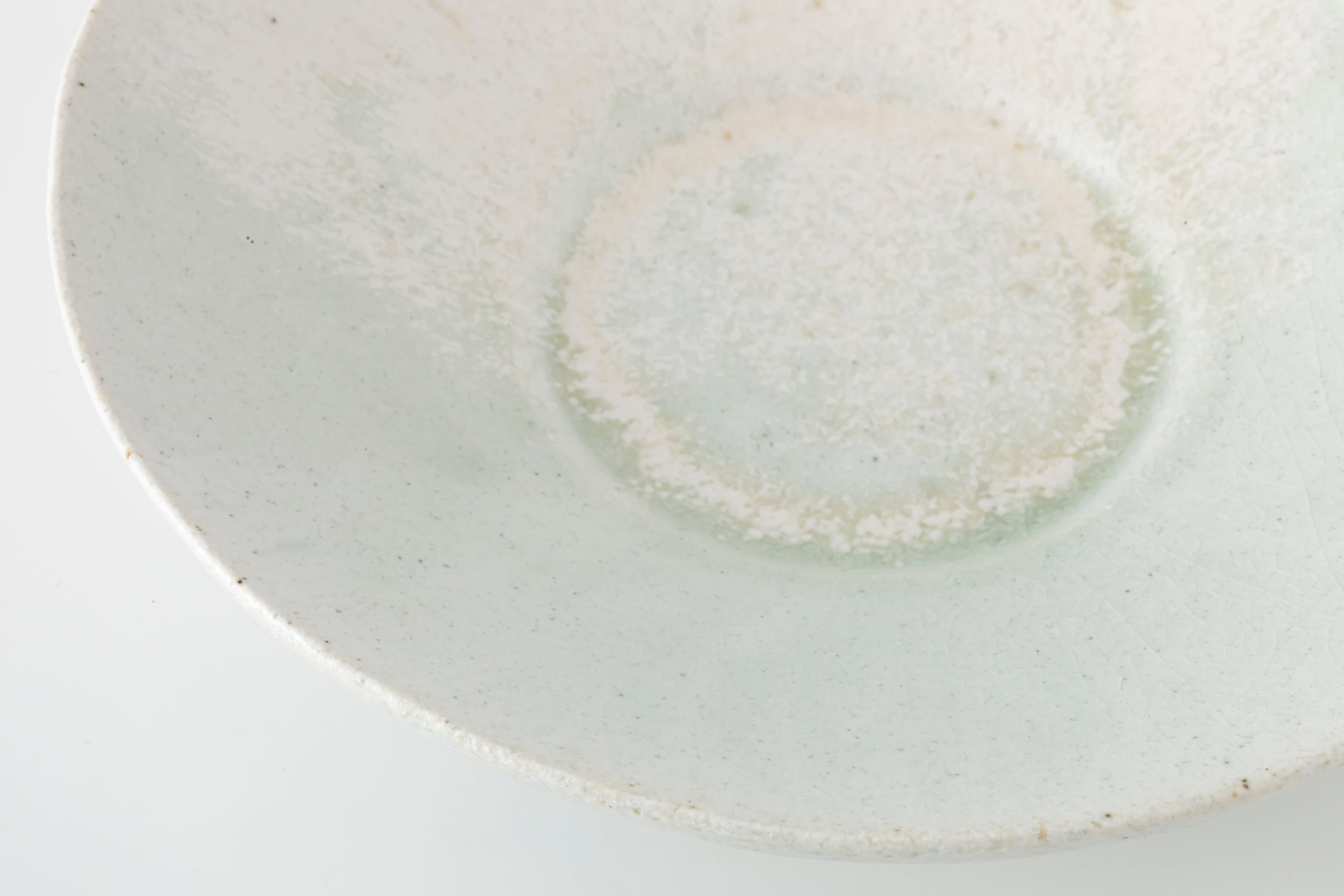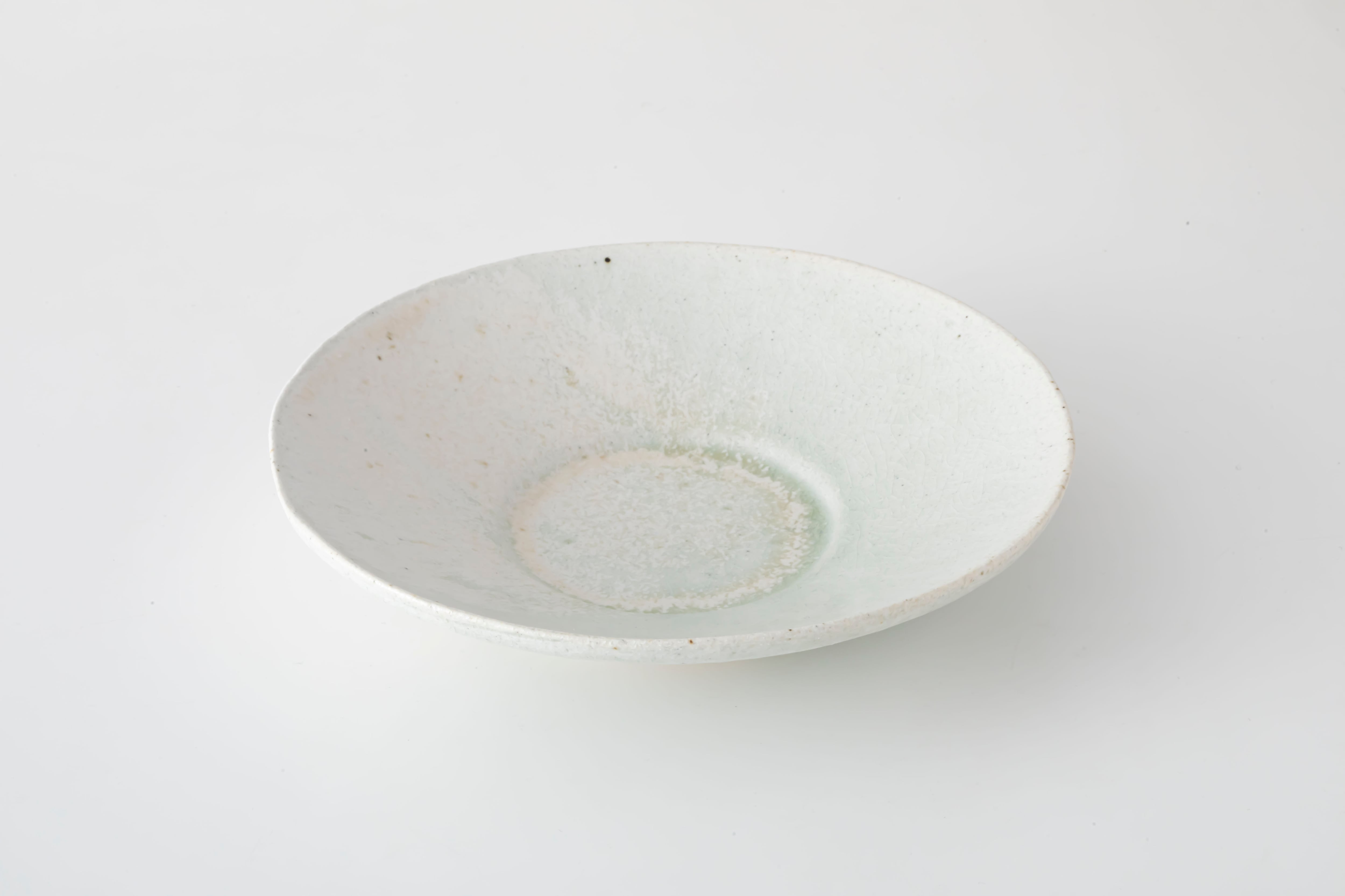 焼成によって一つひとつ異なる表情を見せる、十場あすかさんの器。白を基調としながらも、土の色味や釉薬の溜まりによって、生成りや淡い青みを感じる奥行きのある景色が広がります。貫入が魅せる繊細な表情と優しい佇まいの中に、土の持つ力強さも感じられる一枚です。