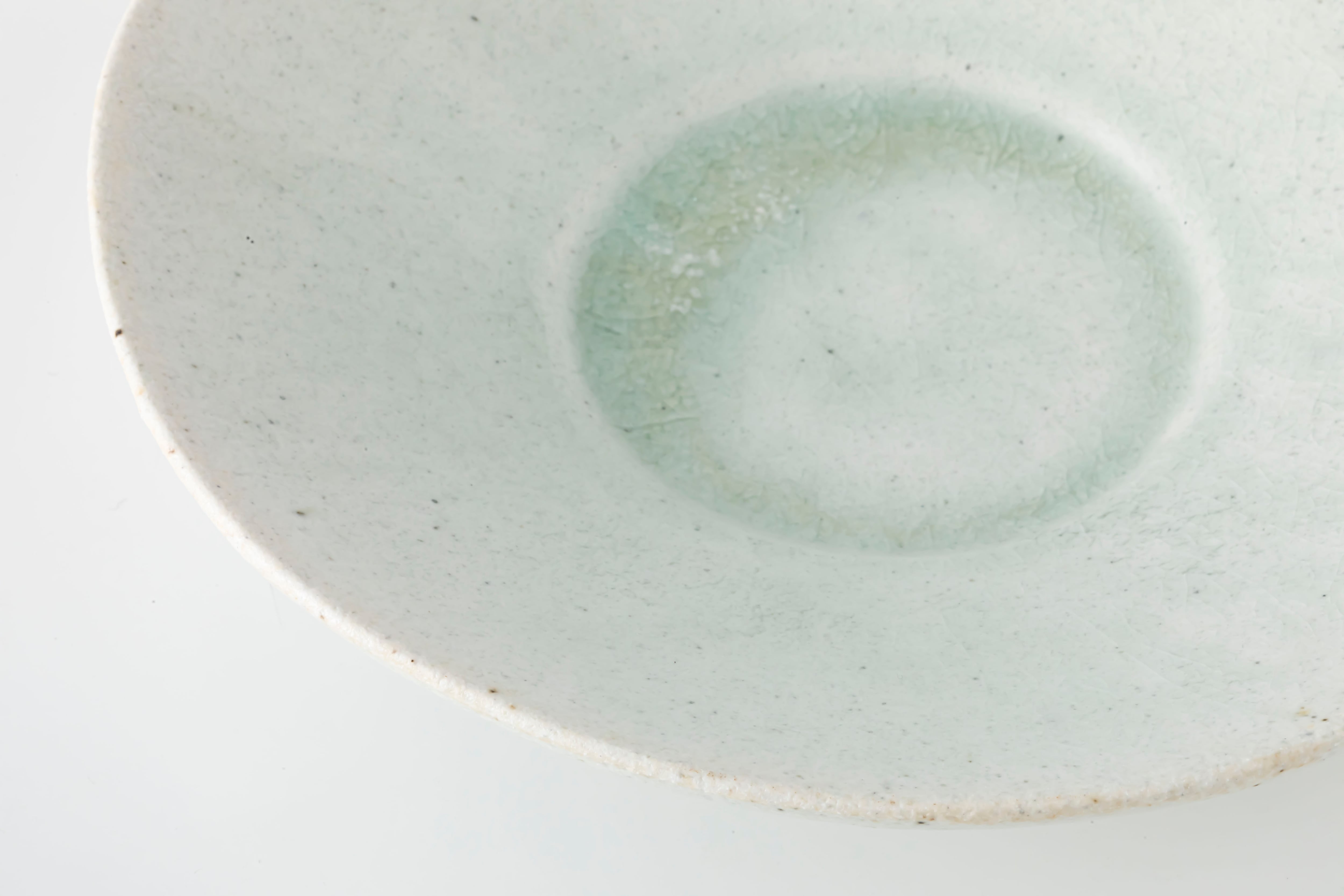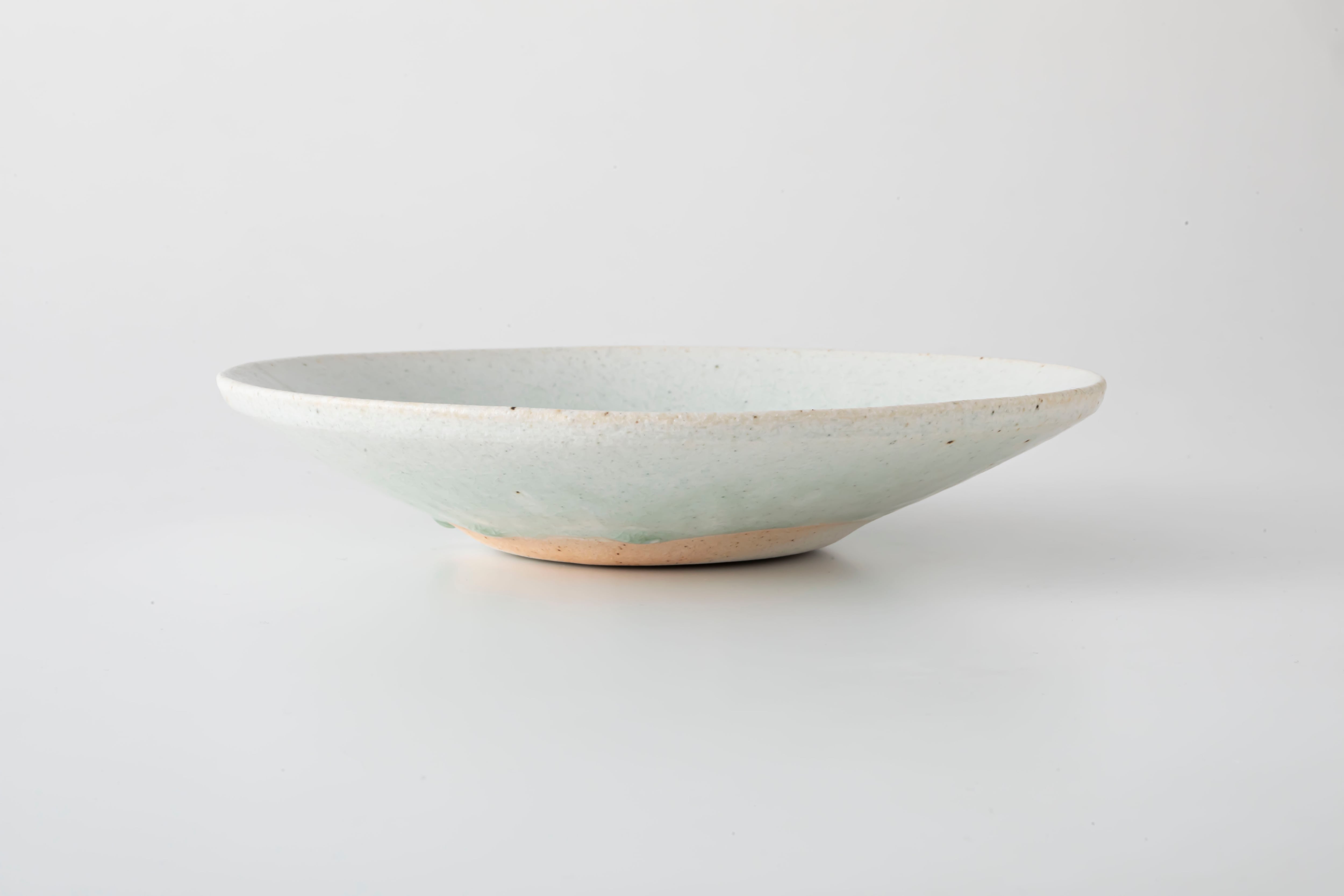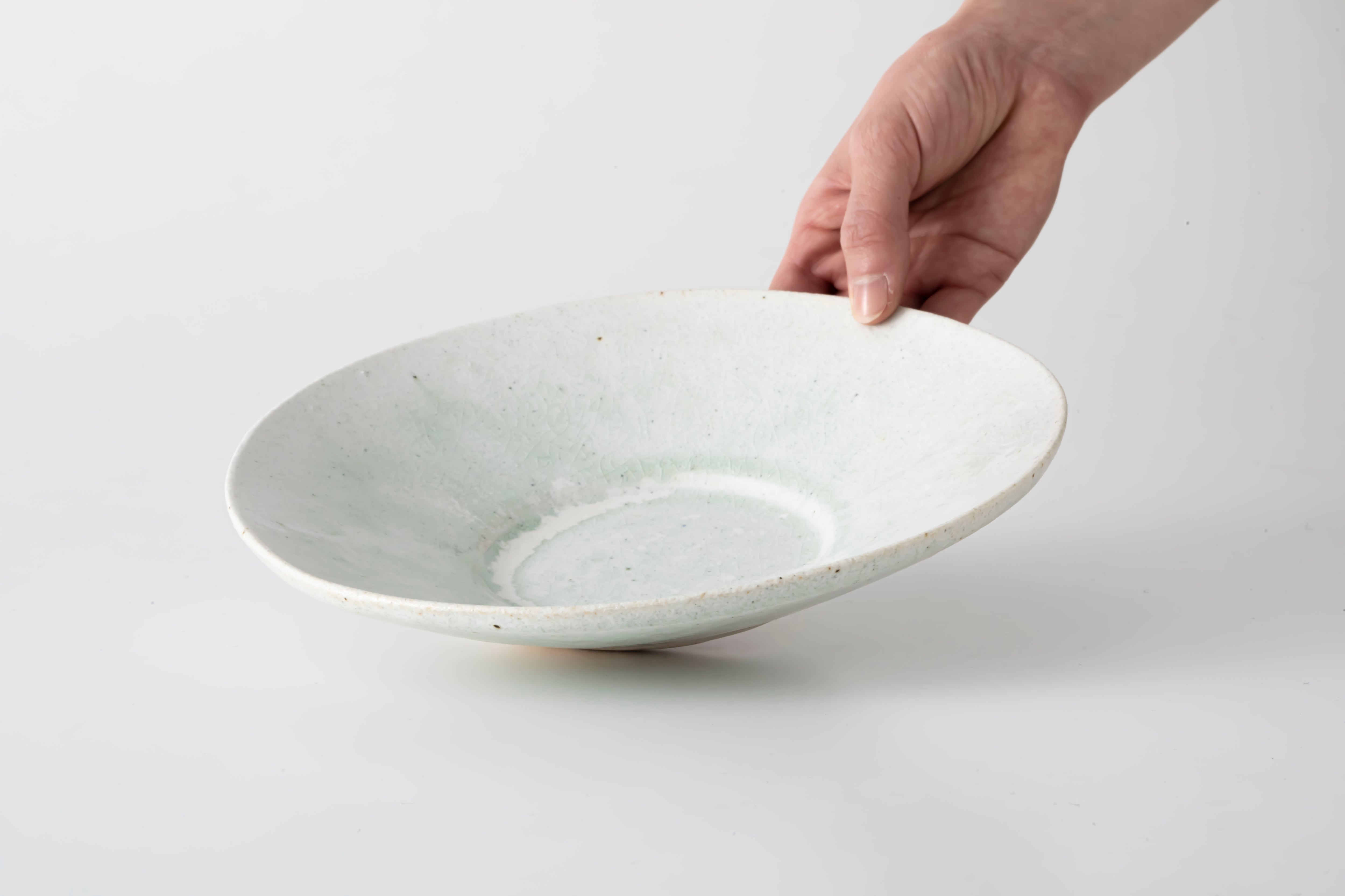 焼成によって一つひとつ異なる表情を見せる、十場あすかさんの器。白を基調としながらも、土の色味や釉薬の溜まりによって、生成りや淡い青みを感じる奥行きのある景色が広がります。貫入が魅せる繊細な表情と優しい佇まいの中に、土の持つ力強さも感じられる一枚です。