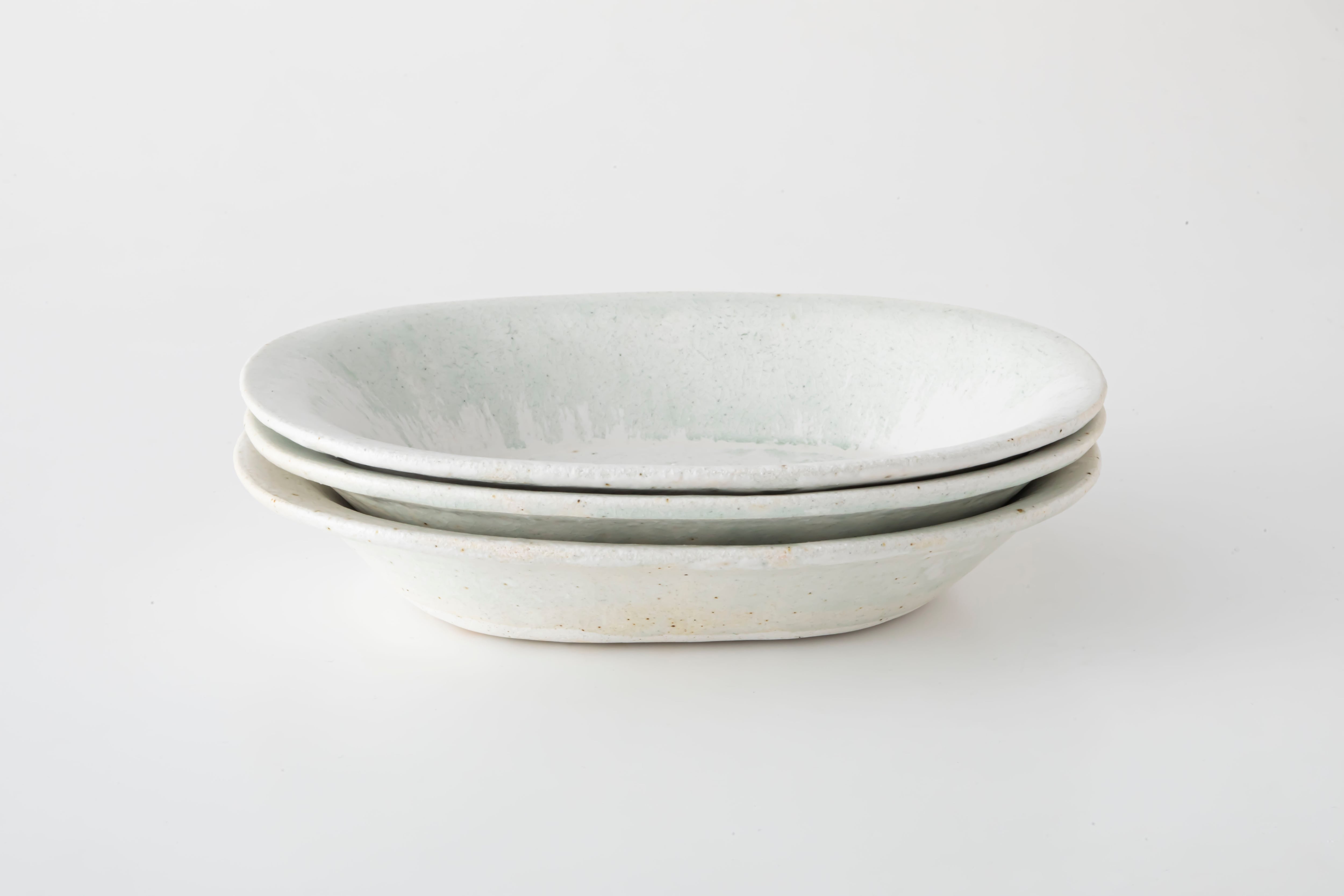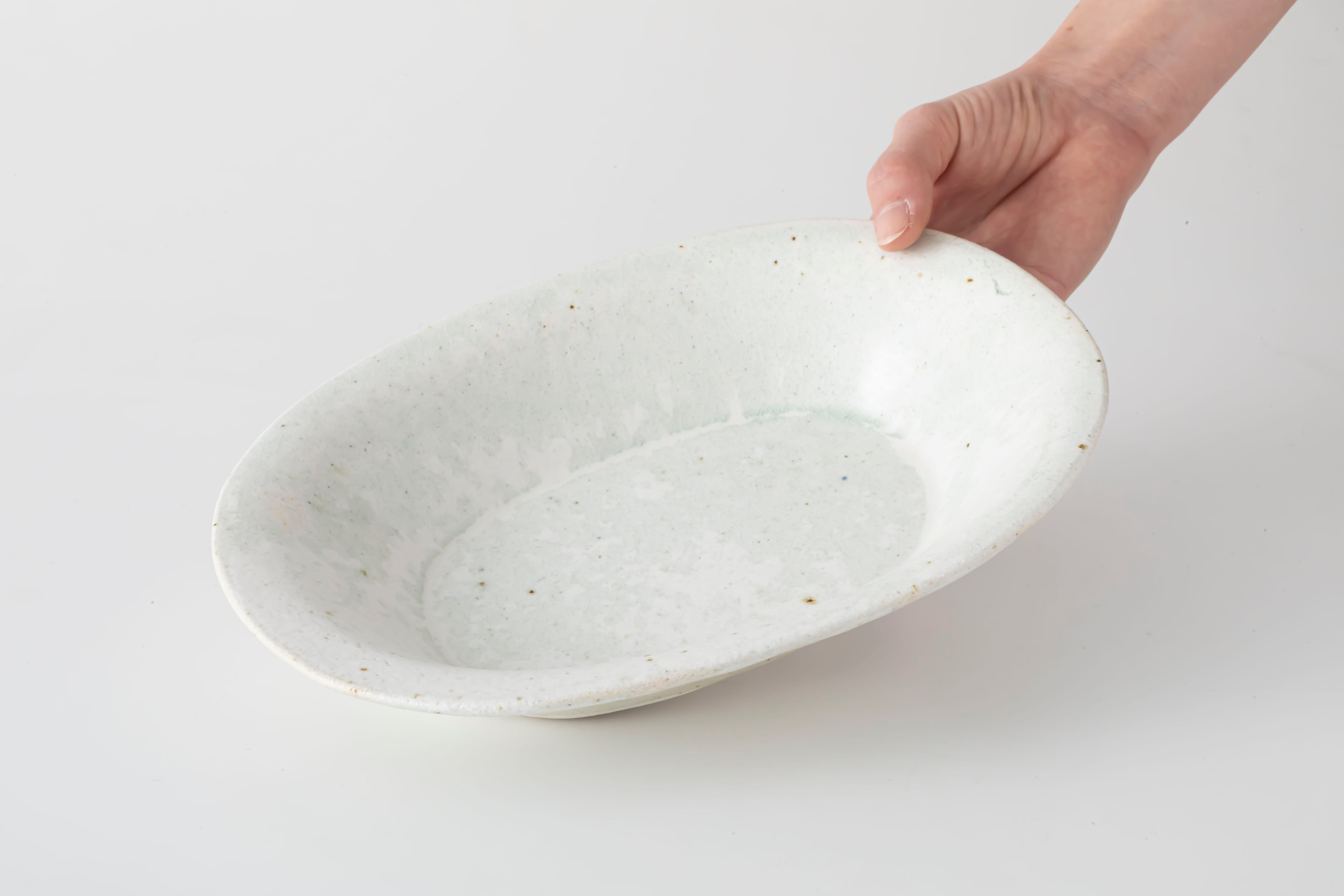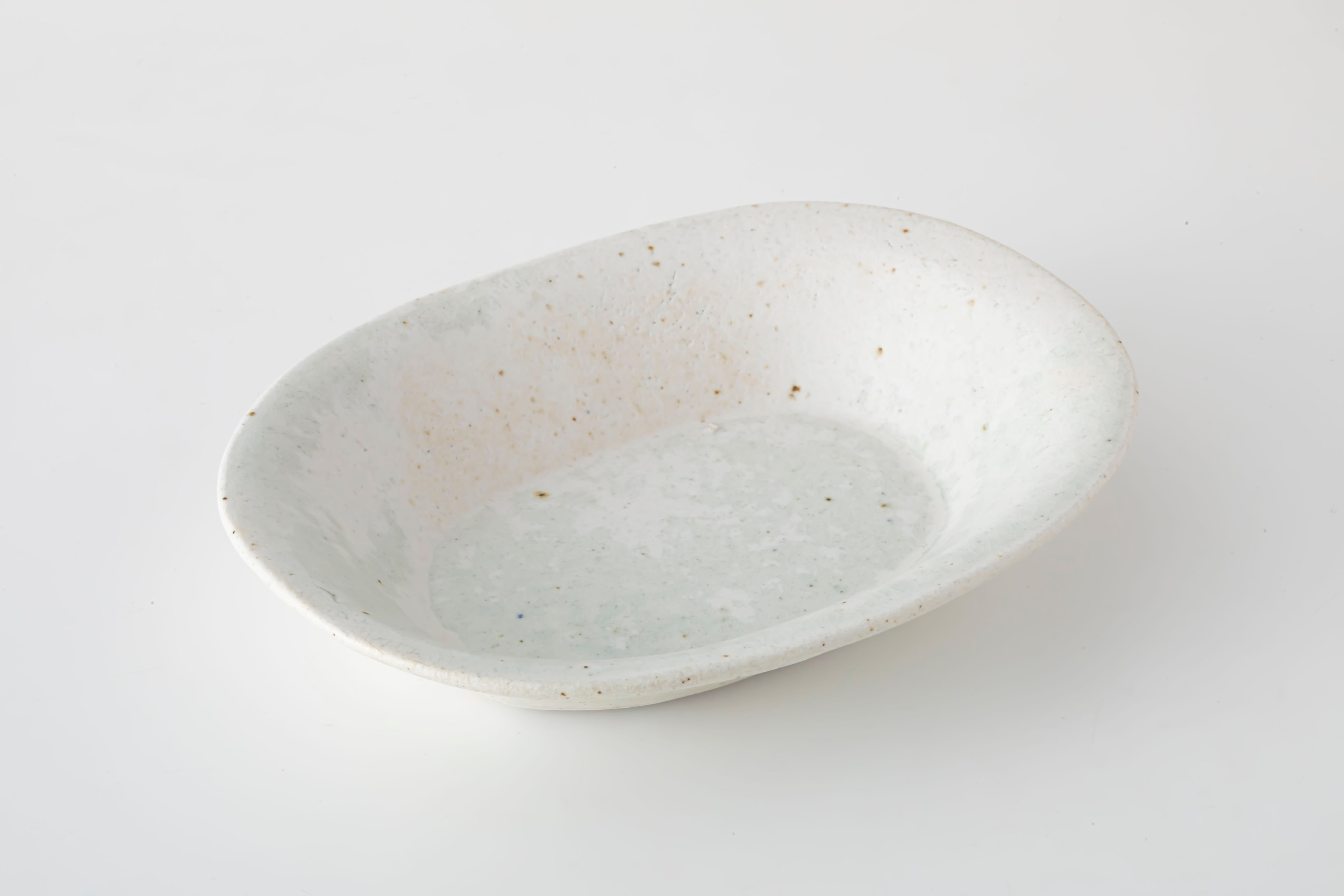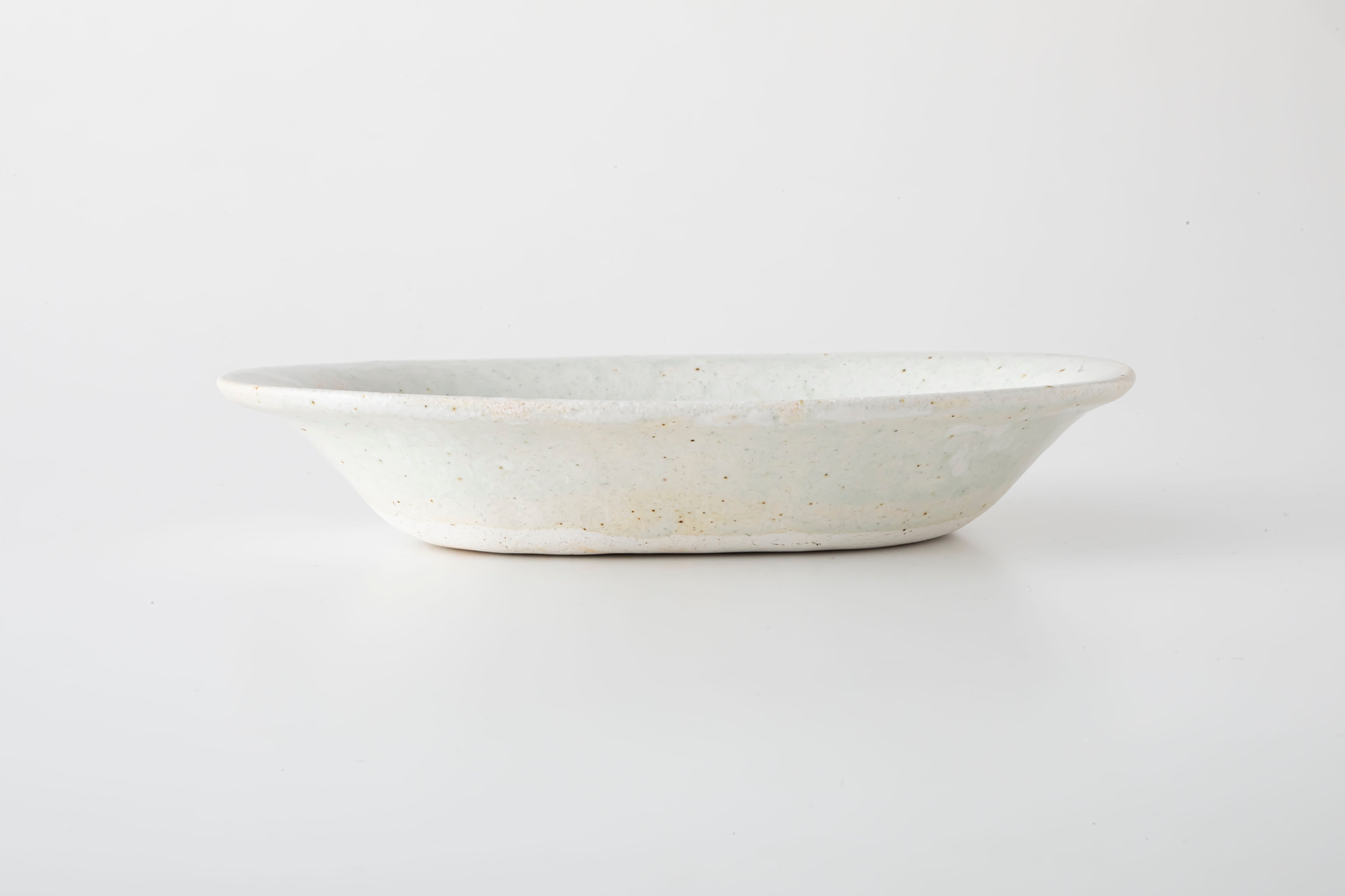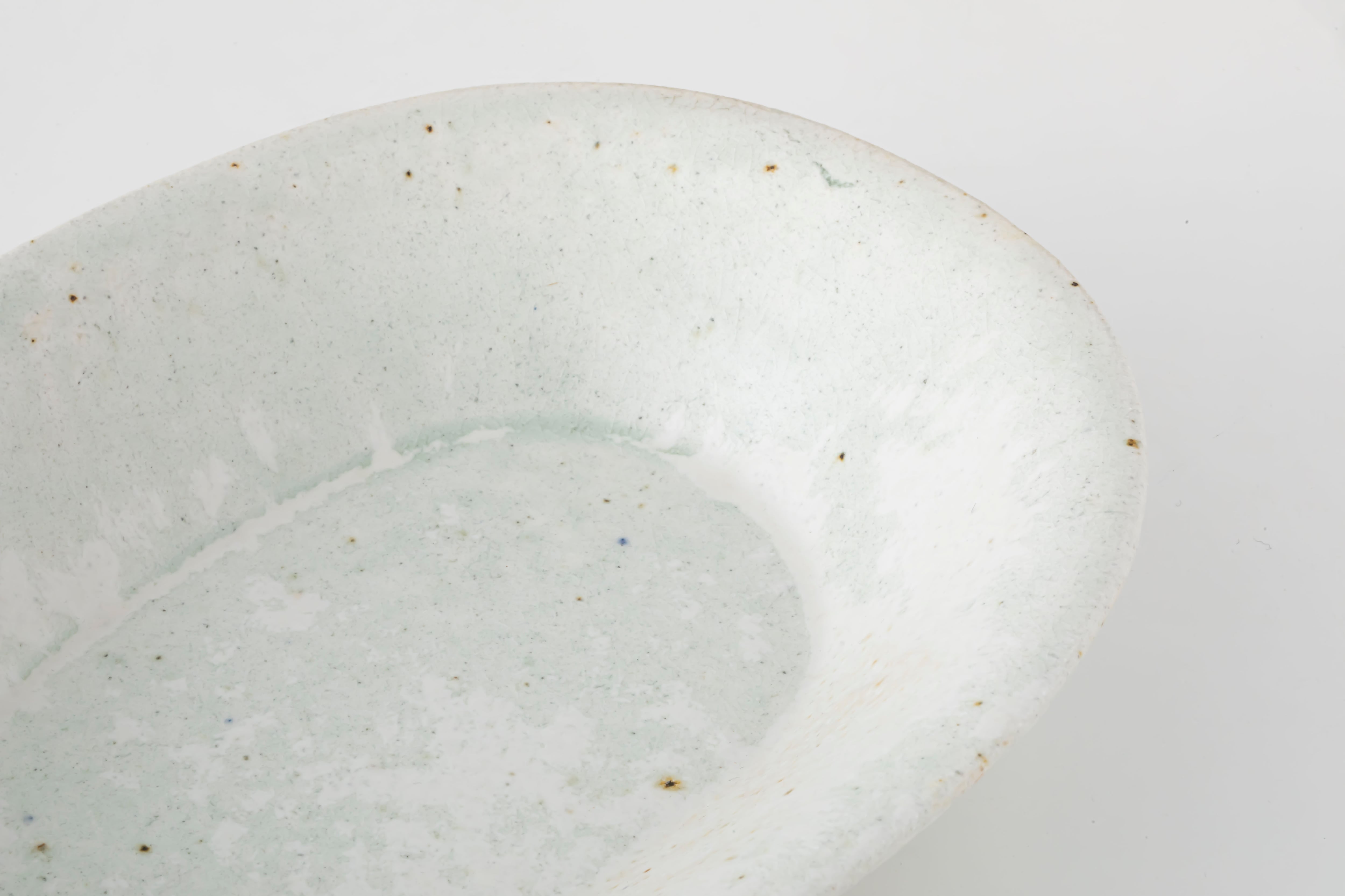 焼成によって一つひとつ異なる表情を見せる、十場あすかさんの器。白を基調としながらも、土の色味や釉薬の溜まりによって、生成りや淡い青みを感じる奥行きのある景色が広がります。貫入が魅せる繊細な表情と優しい佇まいの中に、土の持つ力強さも感じられる一枚です。