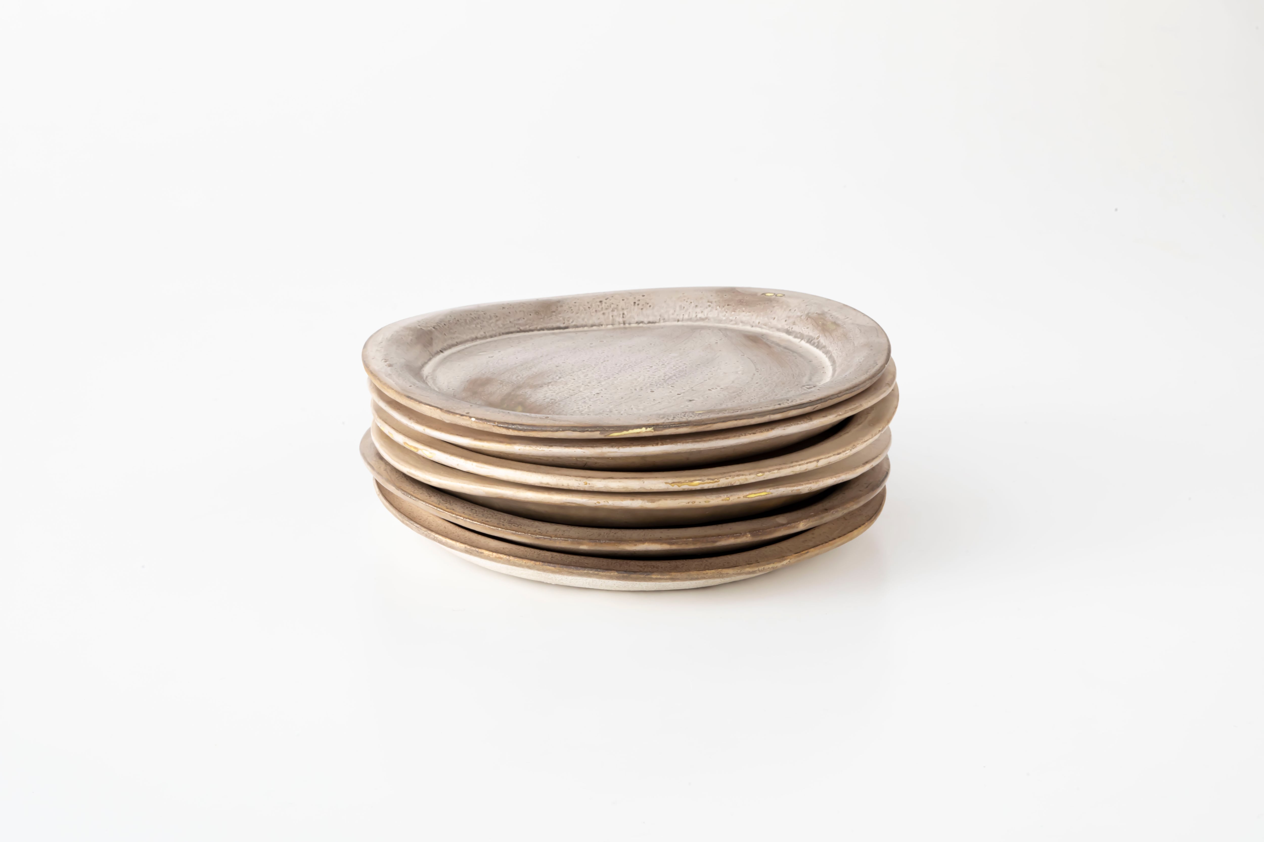 光を受けてやわらかく反射する十場あすかさんの銀彩のシリーズは、主張しすぎることなく、盛り付ける料理を美味しそうに引き立ててくれます。落ち着いた輝きのなかに、土ものならではのおおらかさと存在感が感じられます。銀彩は使い込むほどに少しずつ表情が変わり、経年変化を楽しめるのも魅力のひとつです。