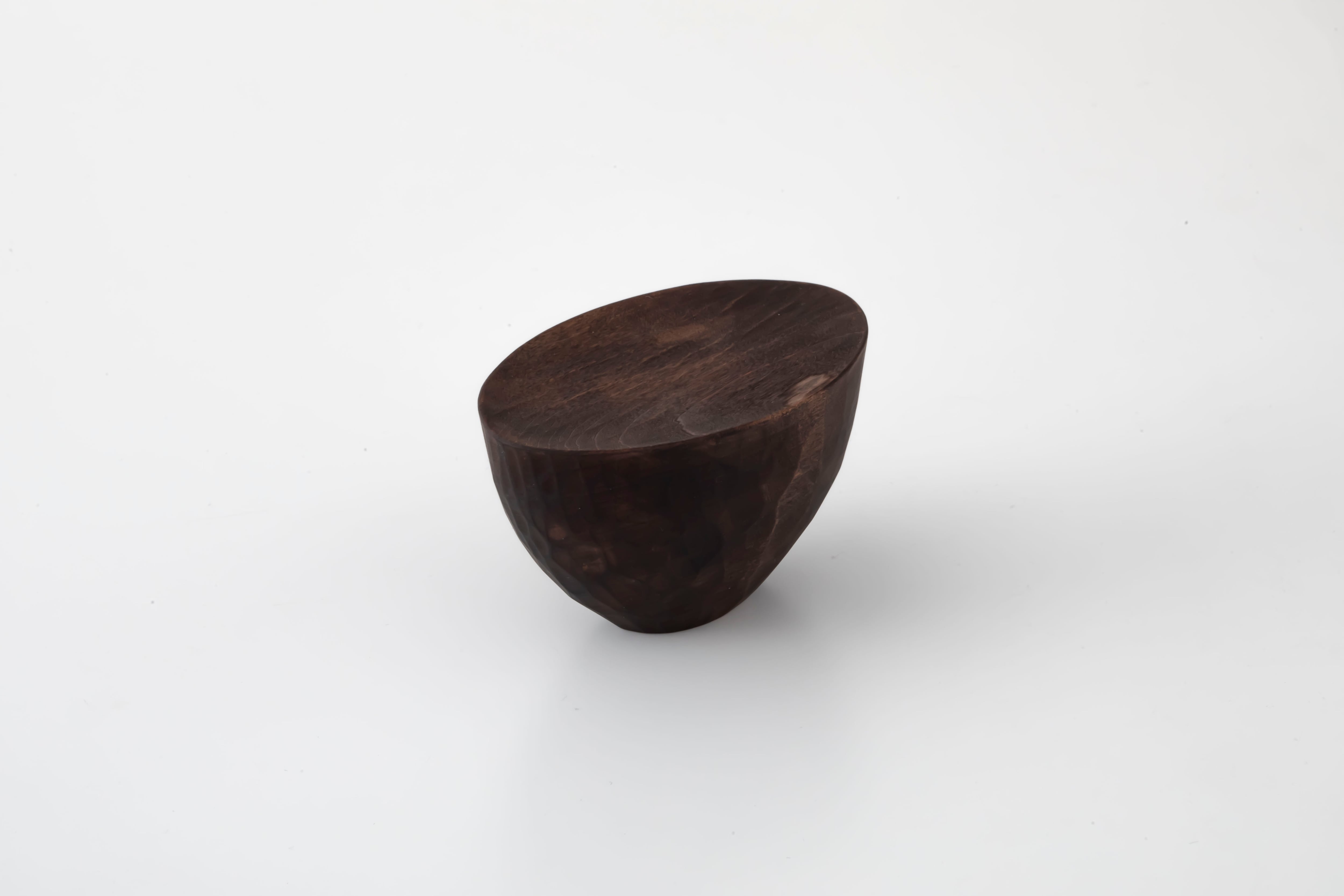 コロンとした形が愛らしい「森のうつわ」は、手彫りならではのやわらかな曲線と、柿渋染めや重曹染めのリズムある模様が魅力です。お菓子やナッツを盛りつけたり、