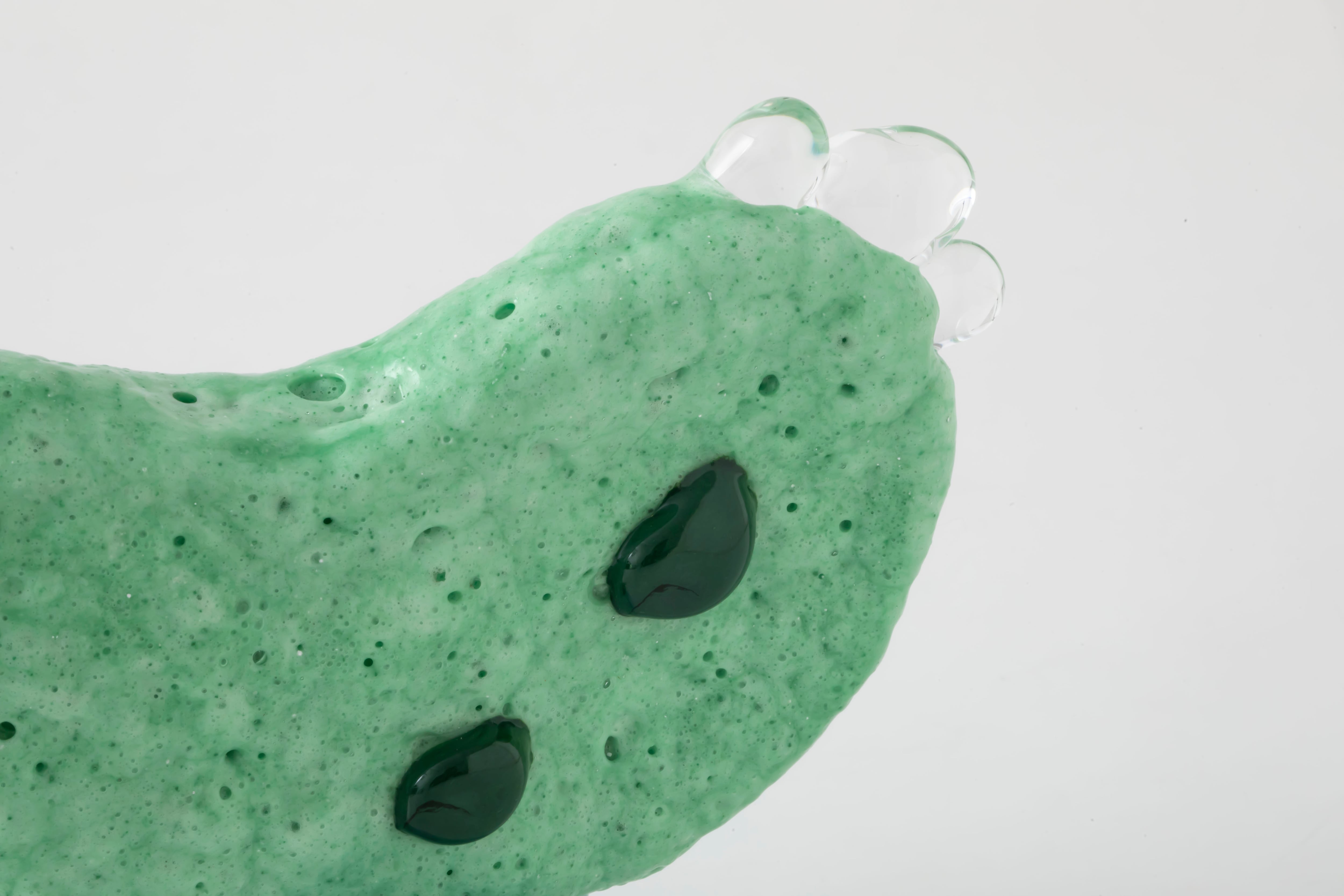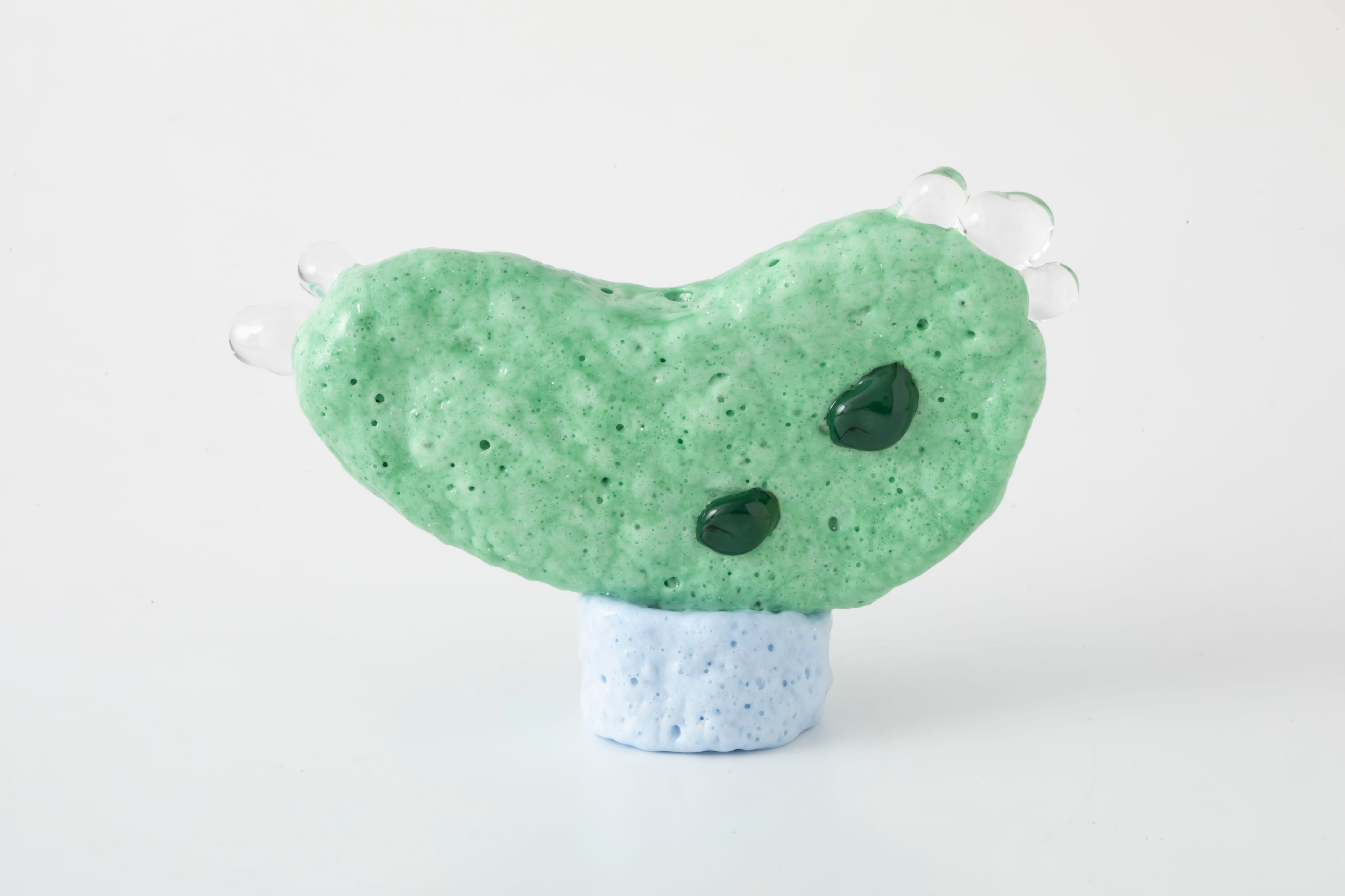 自ら制作した石膏型を用いたキルンワークやブローワークで成形した作品は、内部からもこもこと泡のように膨らんだ凹凸や、偶然性を含んだフォルムが魅力的。ガラスでありながら見た目よりも軽く、見る角度によっても表情が変わるため、お気に入りの場所に置いて眺めたくなるような存在です。お手持ちのオブジェと組み合わせてもぜひお楽しみください。