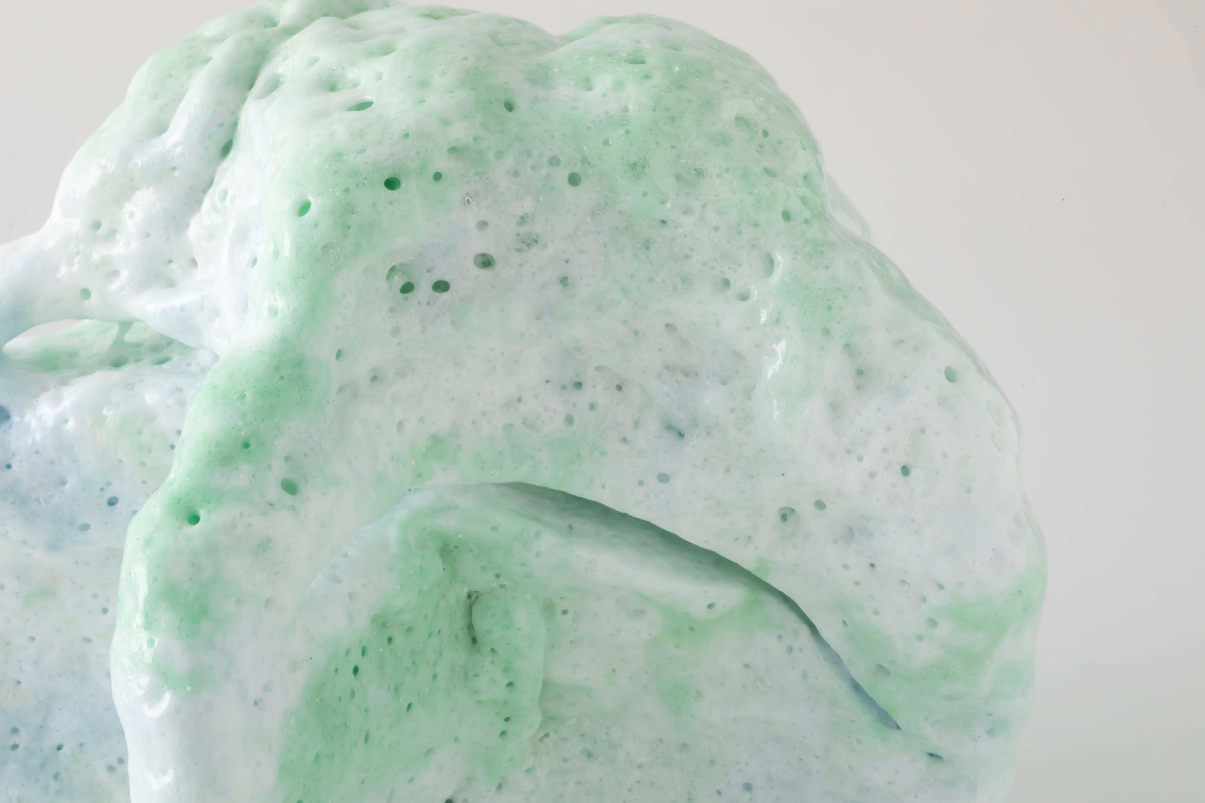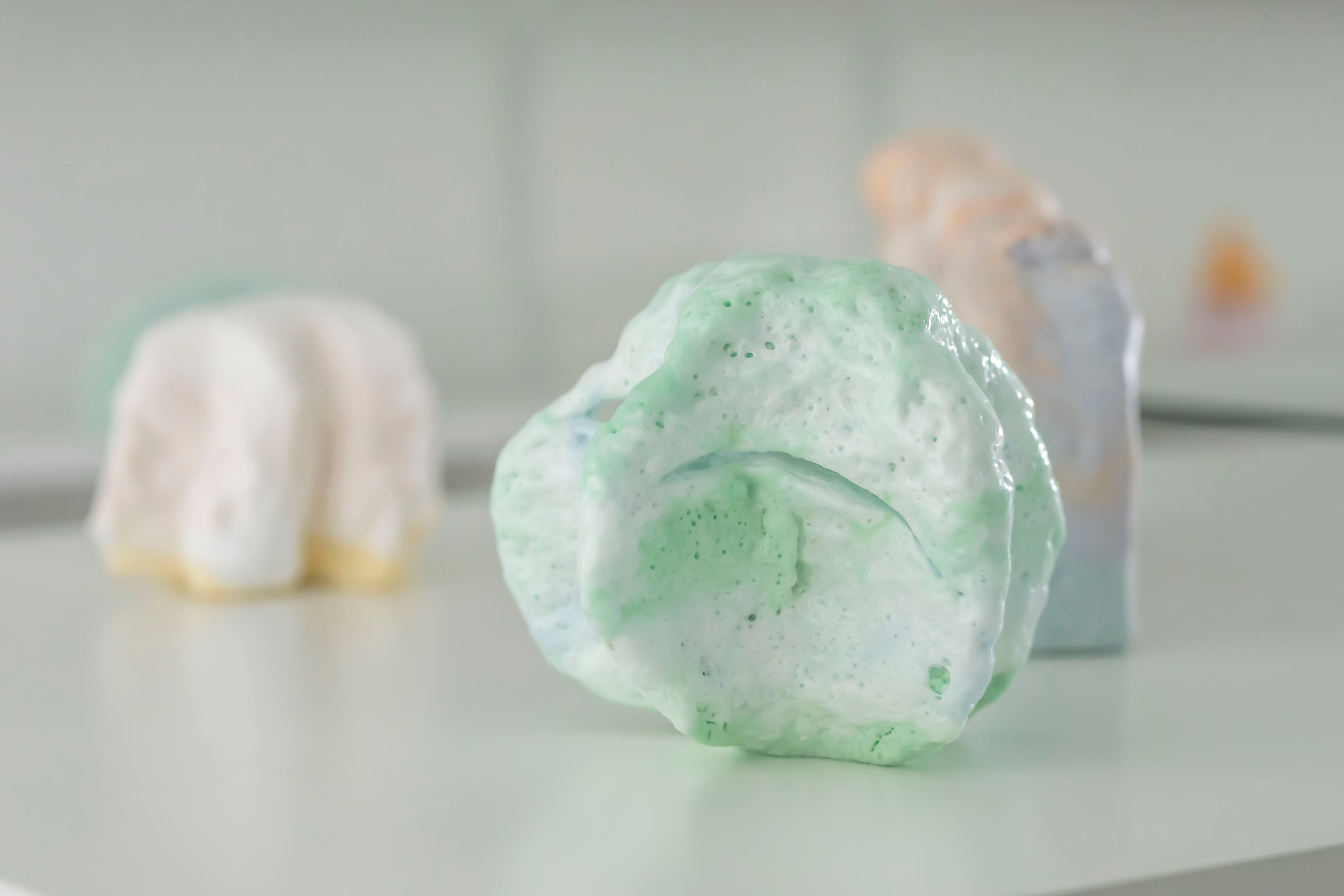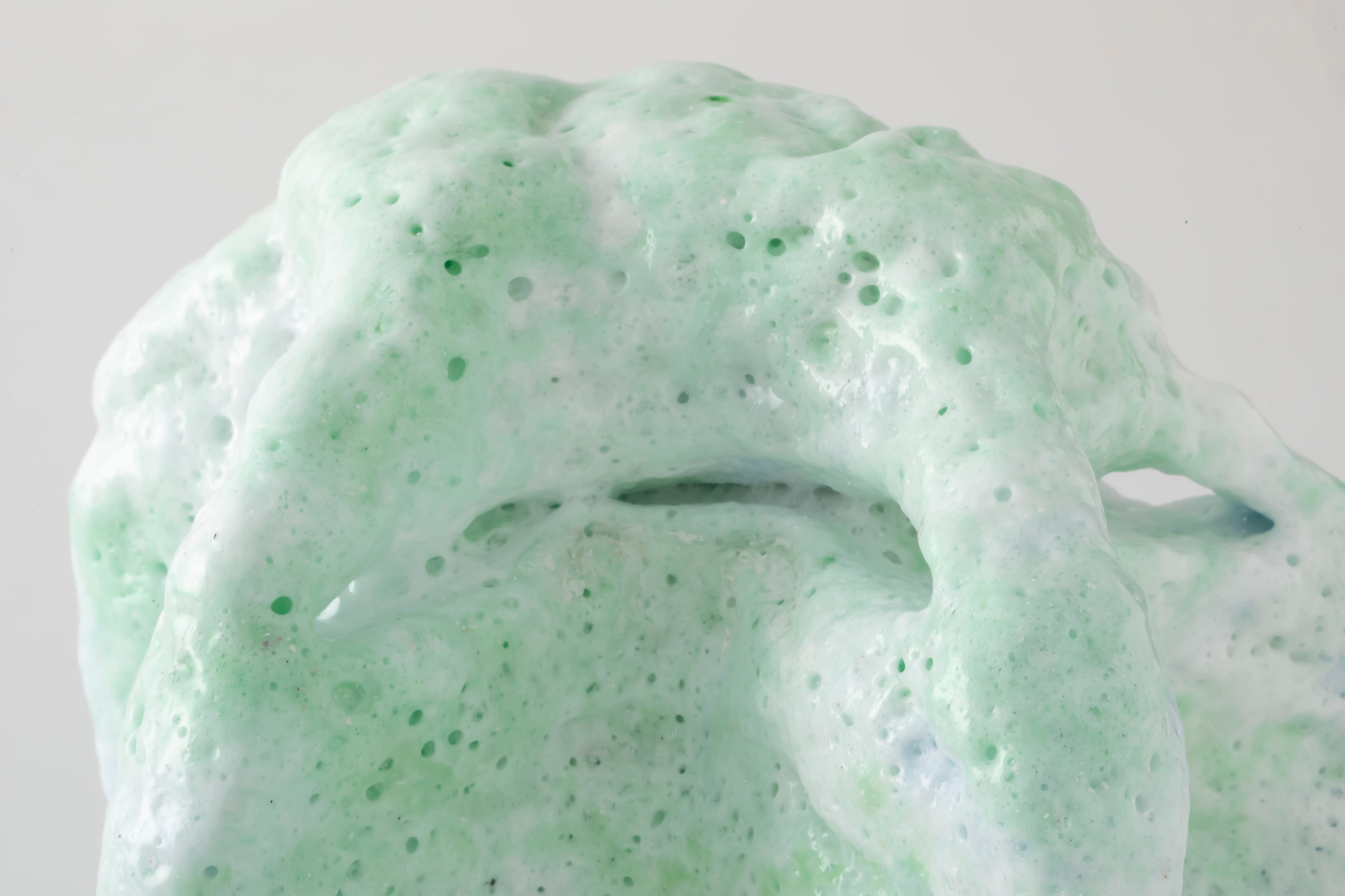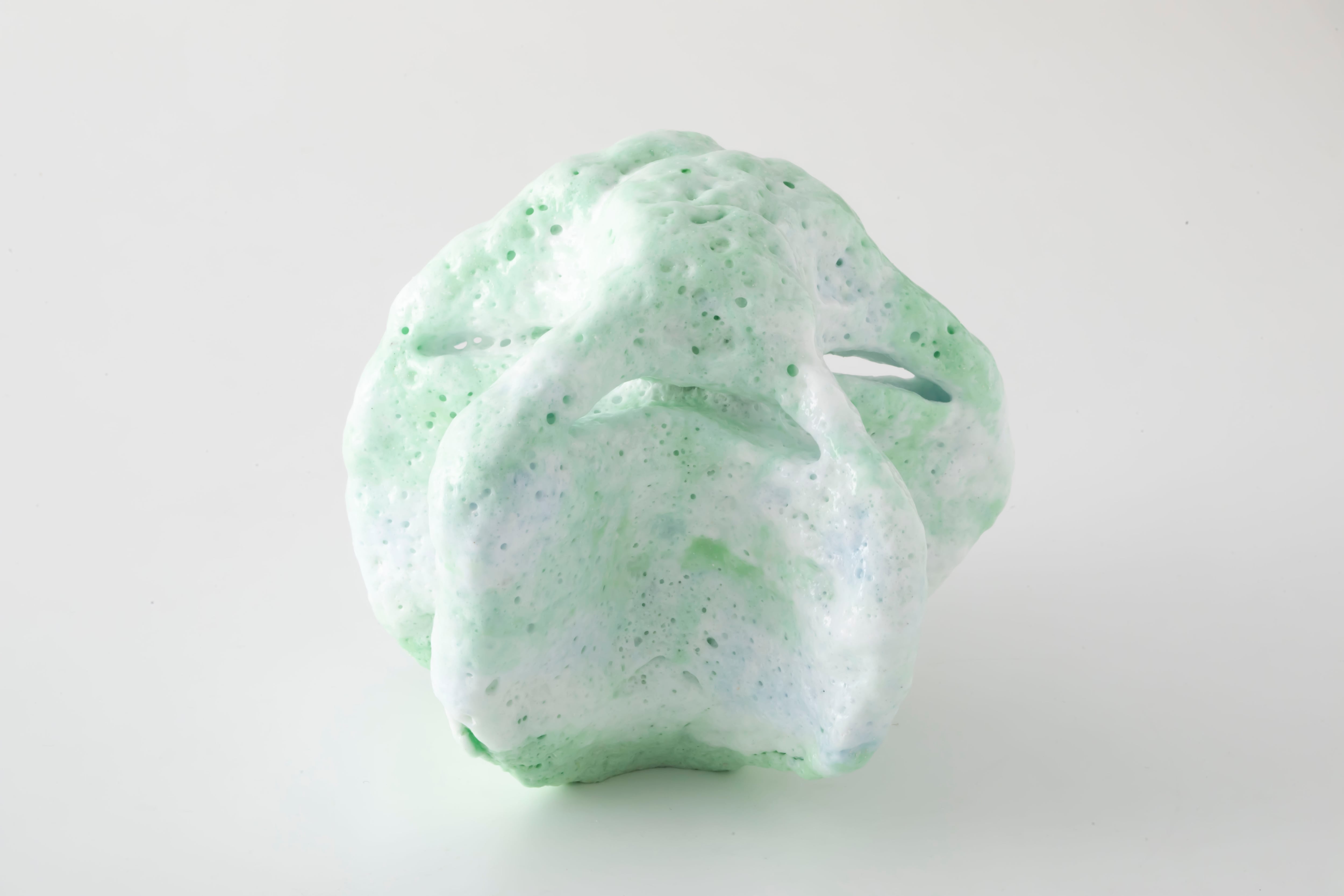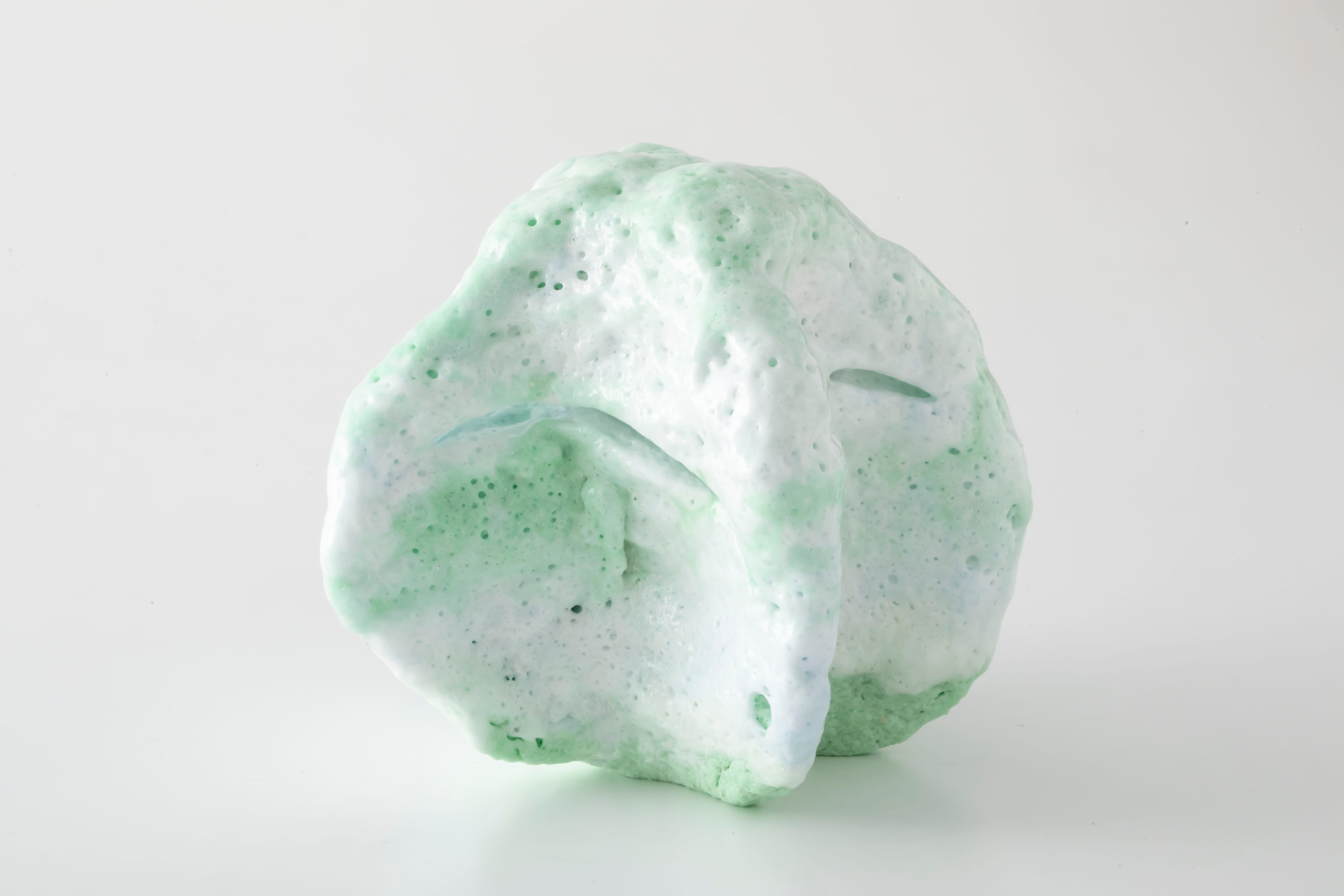 自ら制作した石膏型を用いたキルンワークで成形した作品は、内部からもこもこと泡のように膨らんだ凹凸や、偶然性を含んだフォルムが魅力的。ガラスでありながら見た目よりも軽く、見る角度によっても表情が変わるため、お気に入りの場所に置いて眺めたくなるような存在です。お手持ちのオブジェと組み合わせてもぜひお楽しみください。
