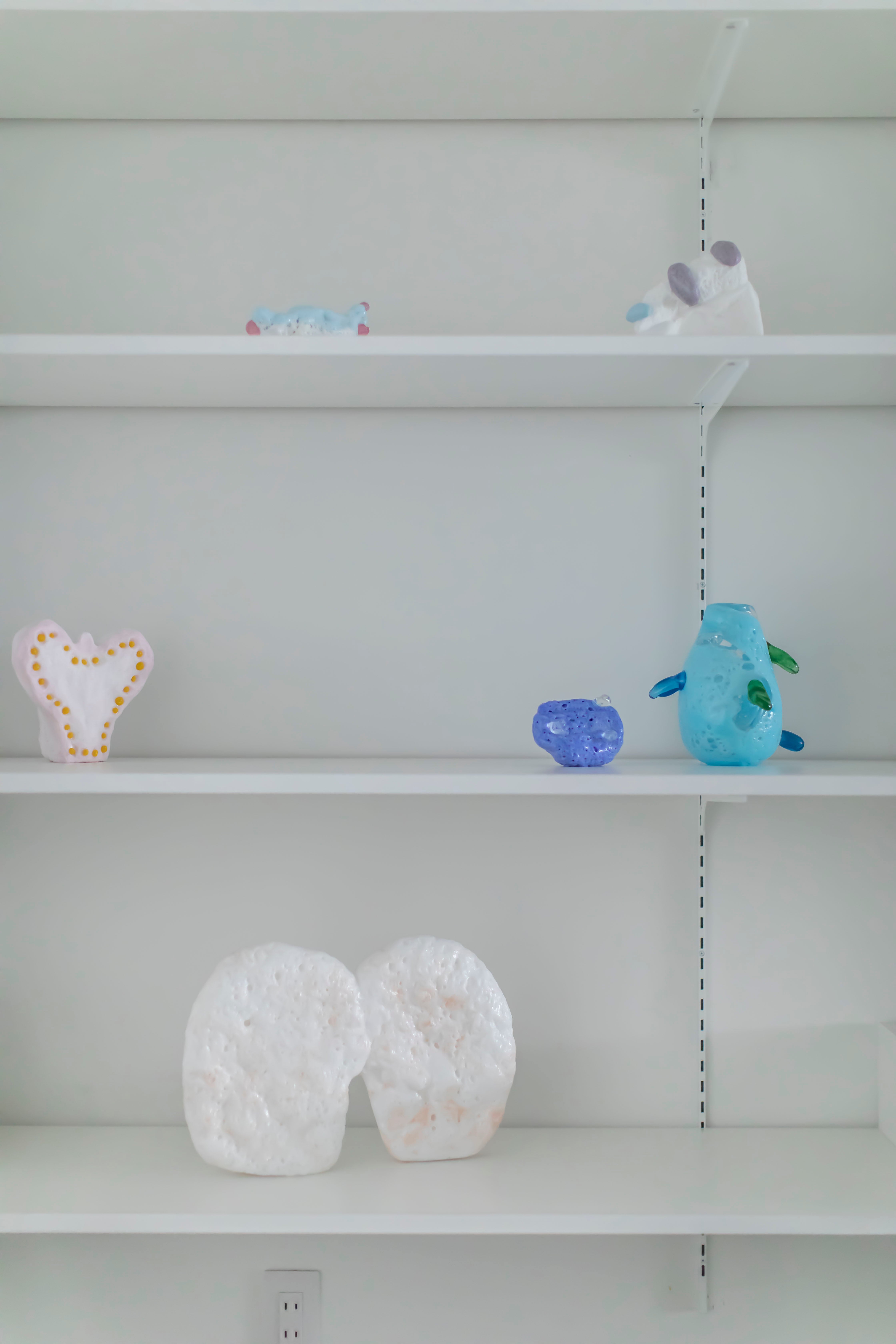 自ら制作した石膏型を用いたキルンワークで成形した作品は、内部からもこもこと泡のように膨らんだ凹凸や、偶然性を含んだフォルムが魅力的。ガラスでありながら見た目よりも軽く、見る角度によっても表情が変わるため、お気に入りの場所に置いて眺めたくなるような存在です。お手持ちのオブジェと組み合わせてもぜひお楽しみください。