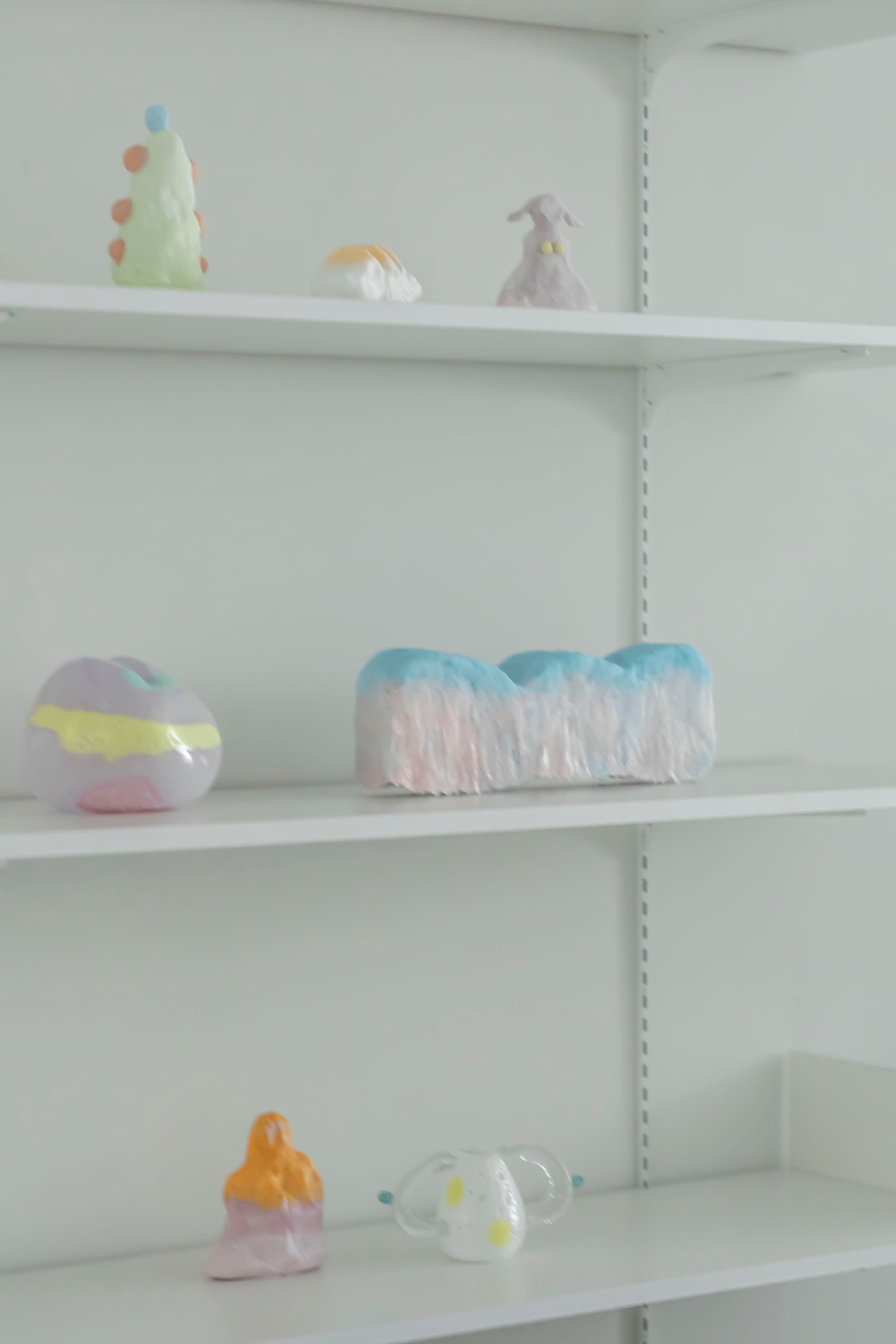 今展ではある種のユニークで捉え所のないフォルムにメタファーとしての役割が与えられている。作家自身が魅了される古代の造形や風習の意味を再解釈し、土器や土偶、お面など、祭祀や人々の営みの中で古くから精神的な結びつきの象徴だった存在に眼差しを向け、現代の形として表現した。