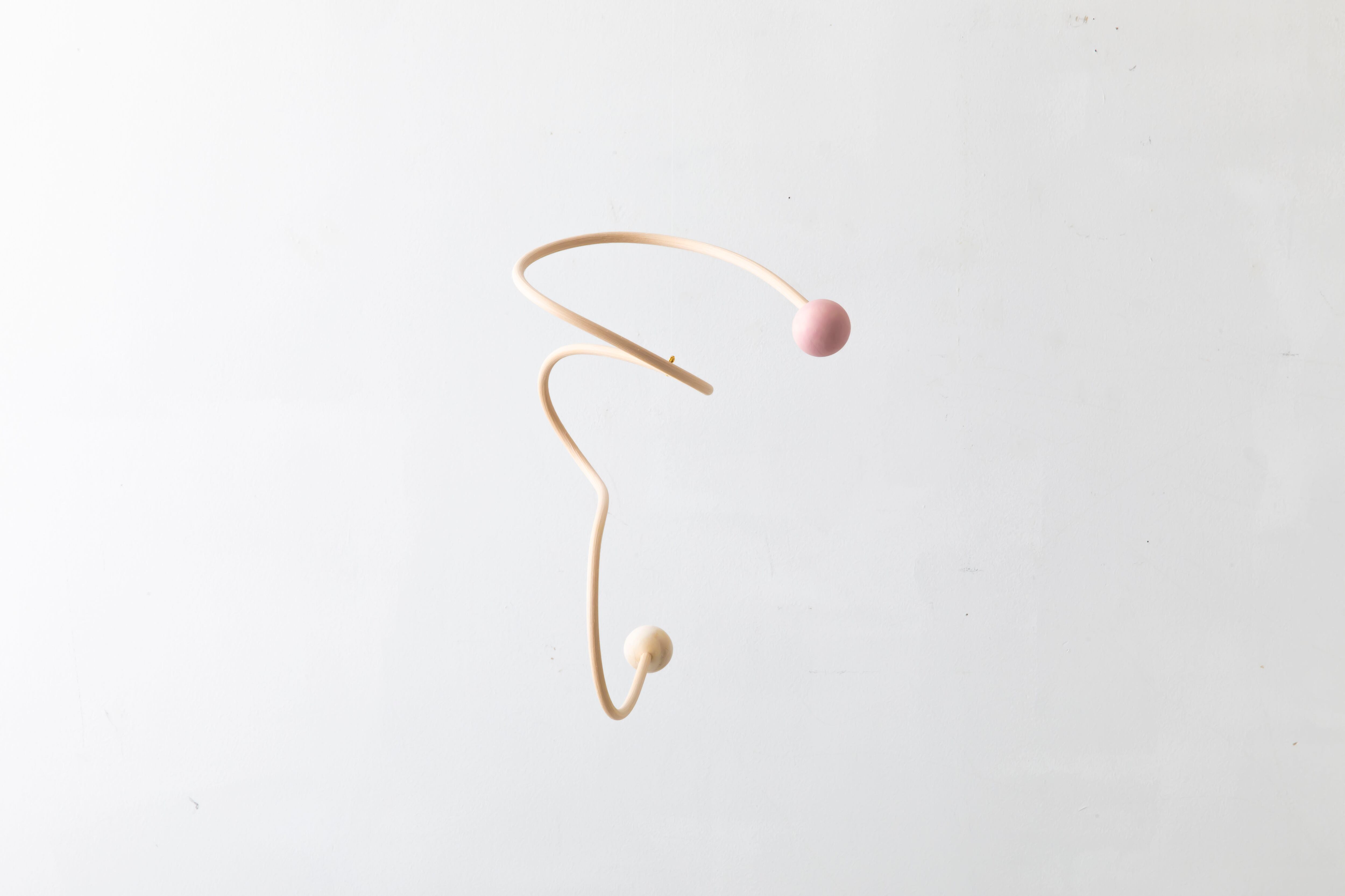 曲線が生み出すアイコニックなフォルムのモビールは、一本の籐を手作業でひとつひとつ型を使用しながら湾曲させて立体的に仕上げています。吊るし紐の長さや、かけ方を変えたりするだけで表情が変えられるので、飾る場所などによってアレンジを効かせながら何通りもの楽しみ方ができます。また、白い籐は経年変化により徐々に色が飴色に変わっていきます。表情の変化もぜひお楽しみください。