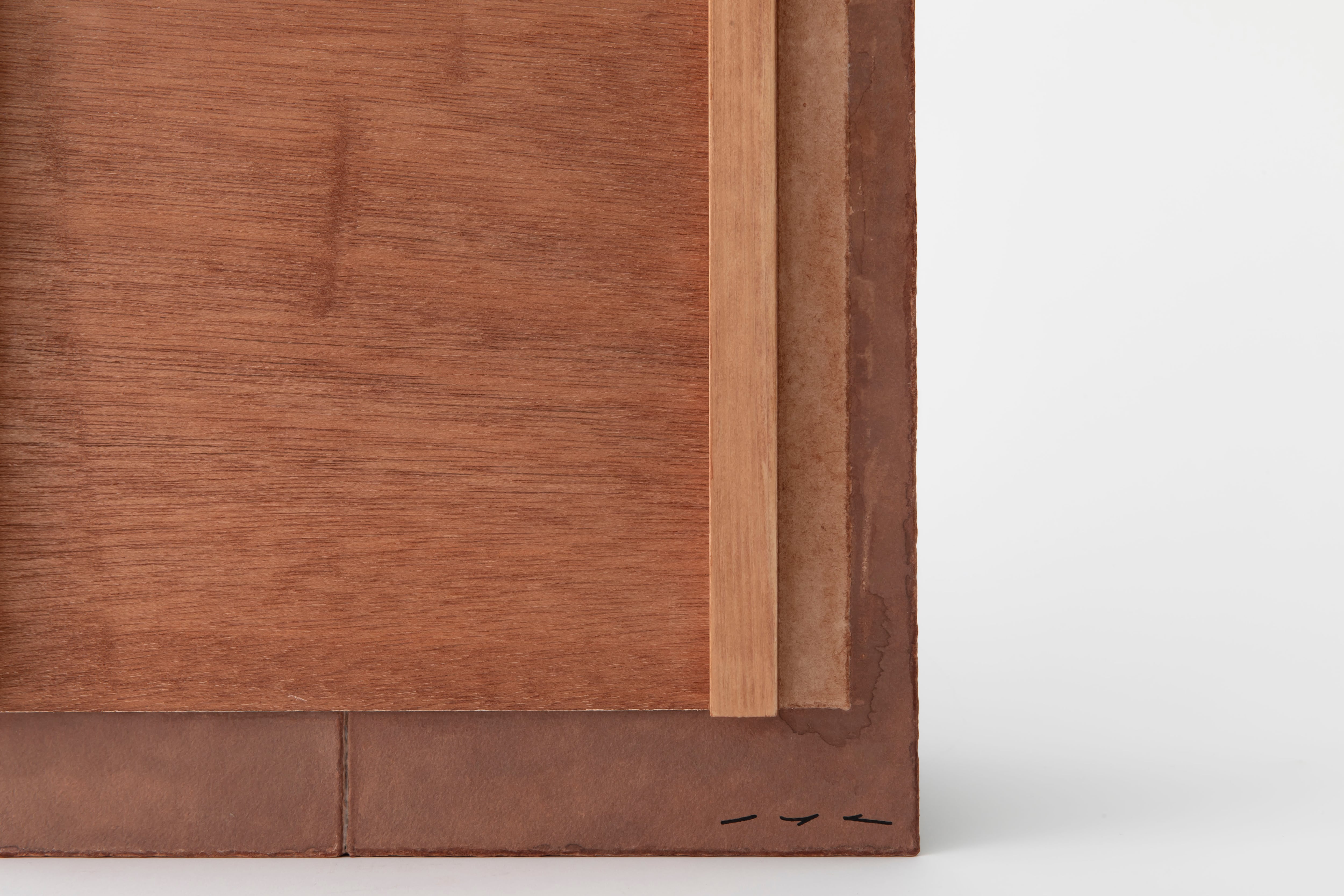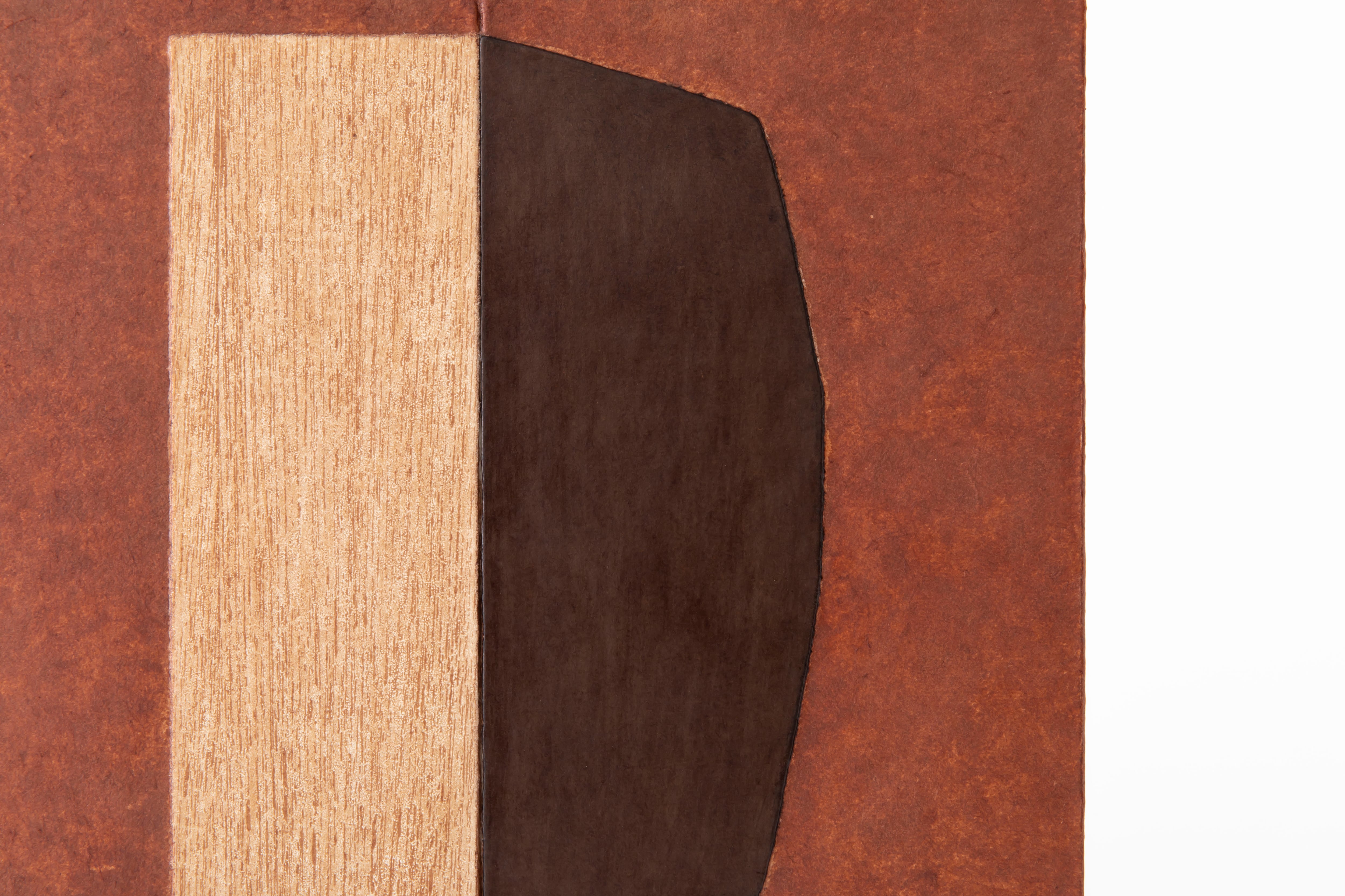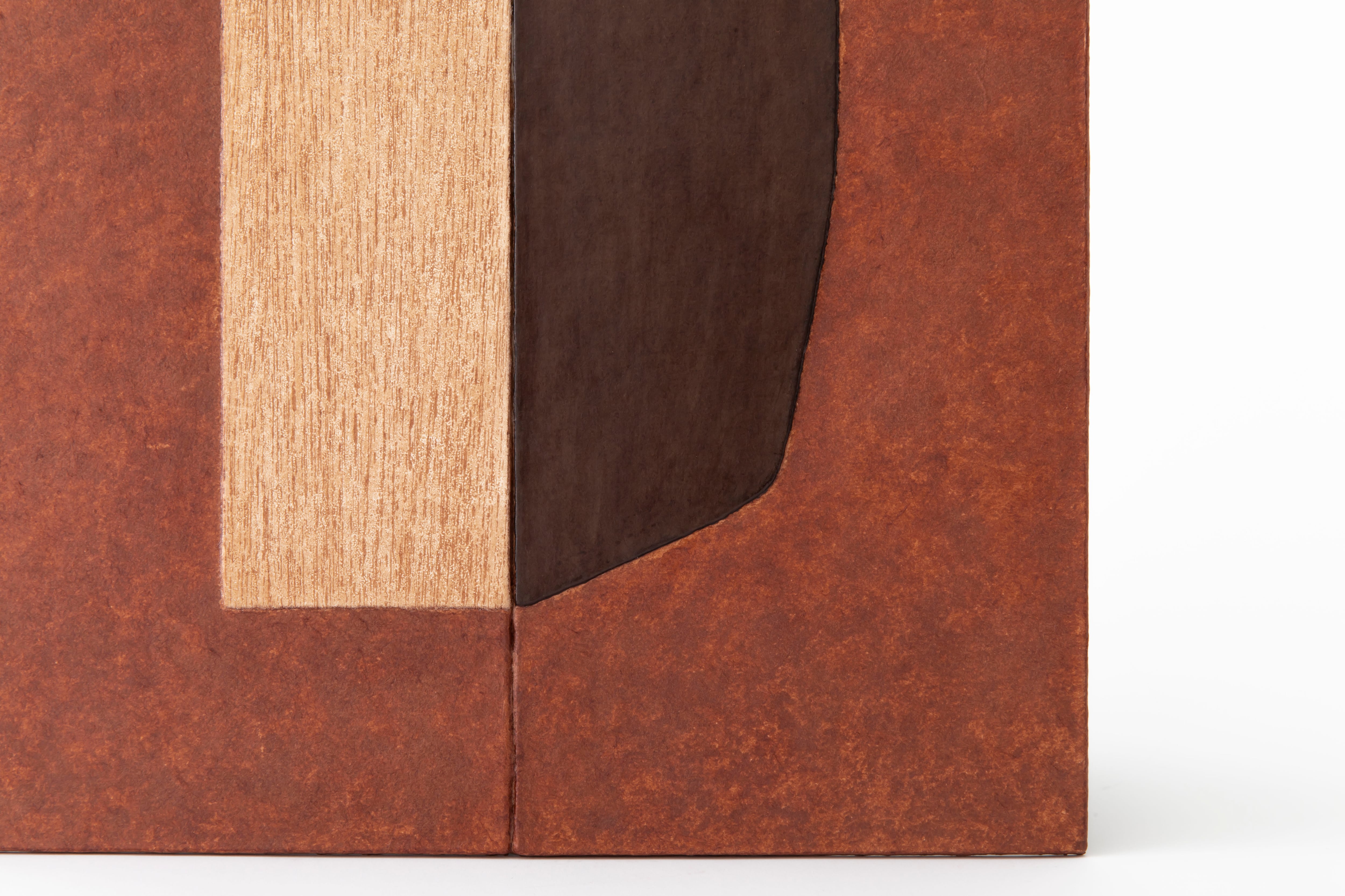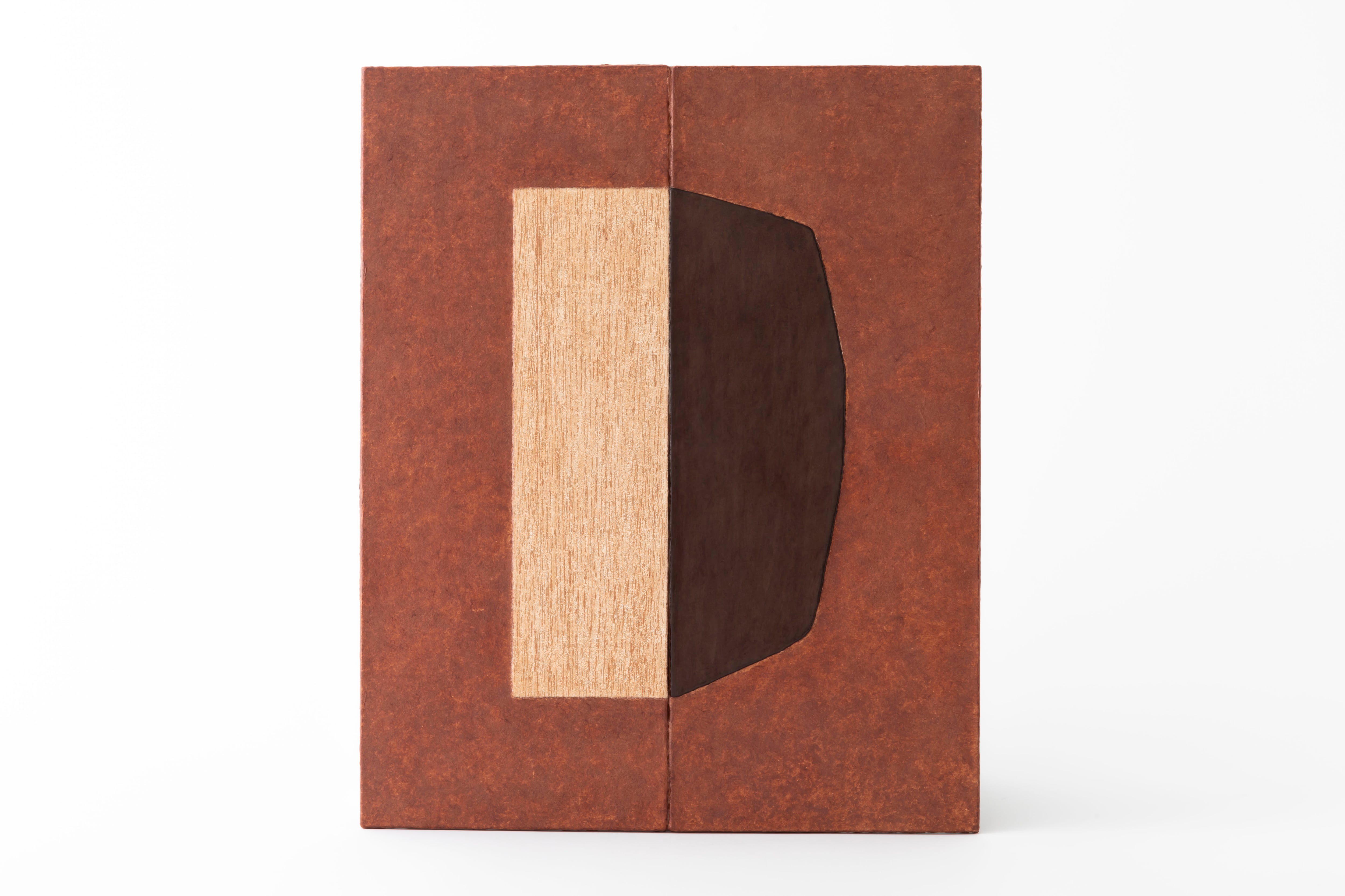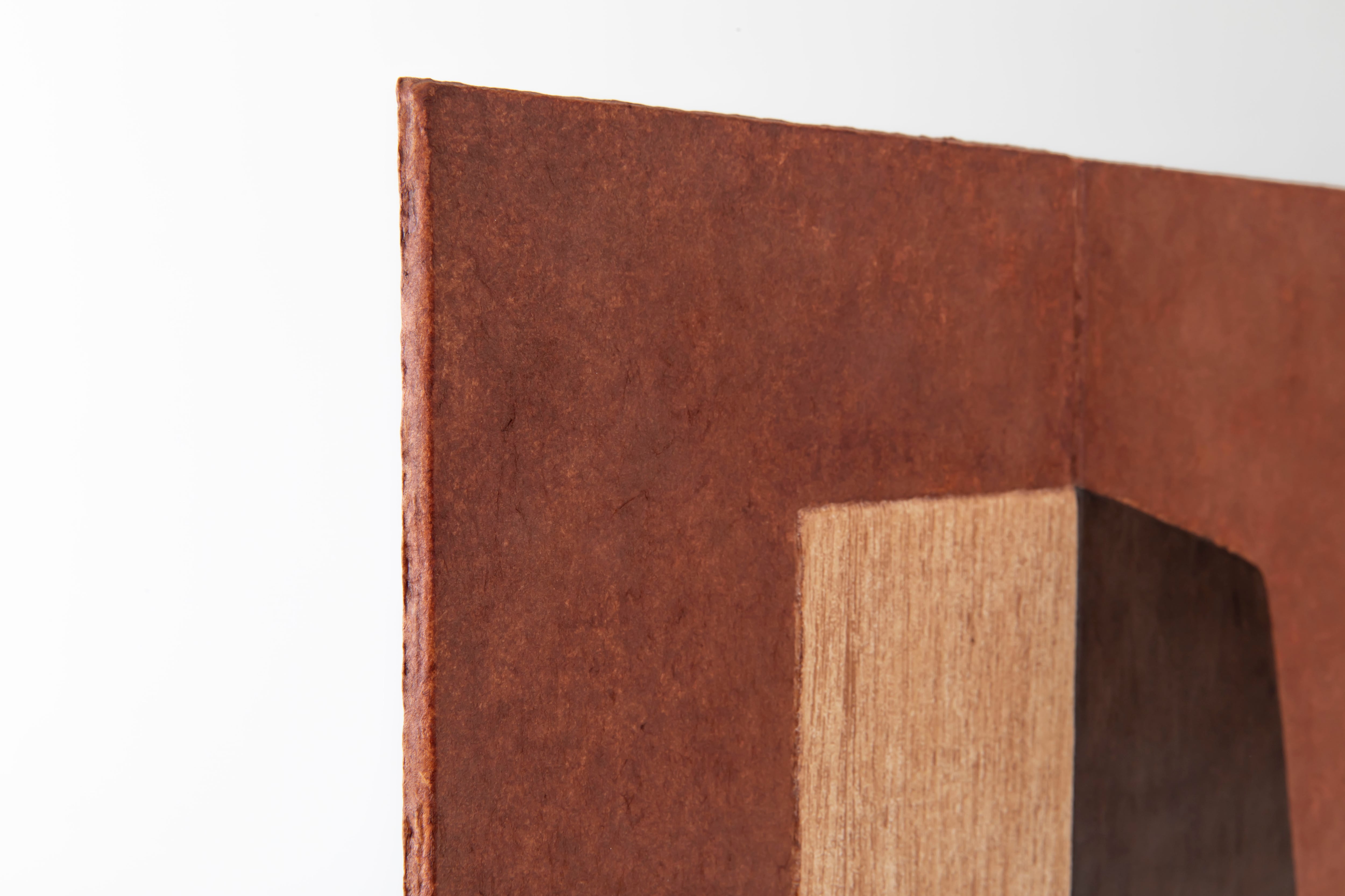 2024年5月に開催した、美術作家・小板橋雅之さんの個展「層状」の作品です。今展では、和紙を幾重にも重ね柿渋を塗る、あるいは版を摺った紙を植物染料に浸し染めを施すなど、まさに層状に手数を重ねた立体的な作品を発表しました。